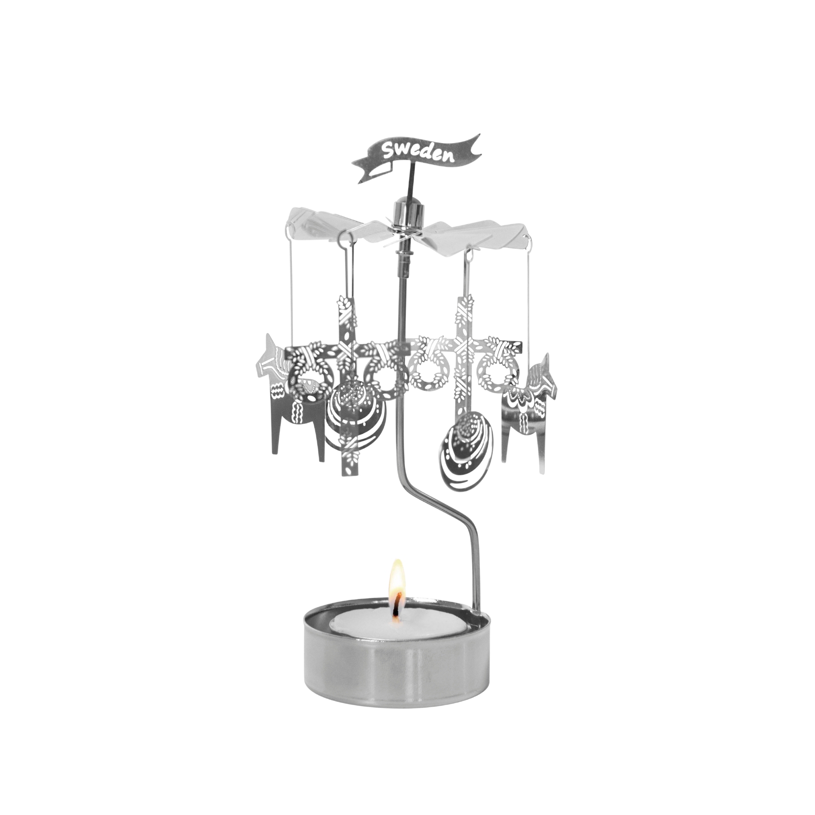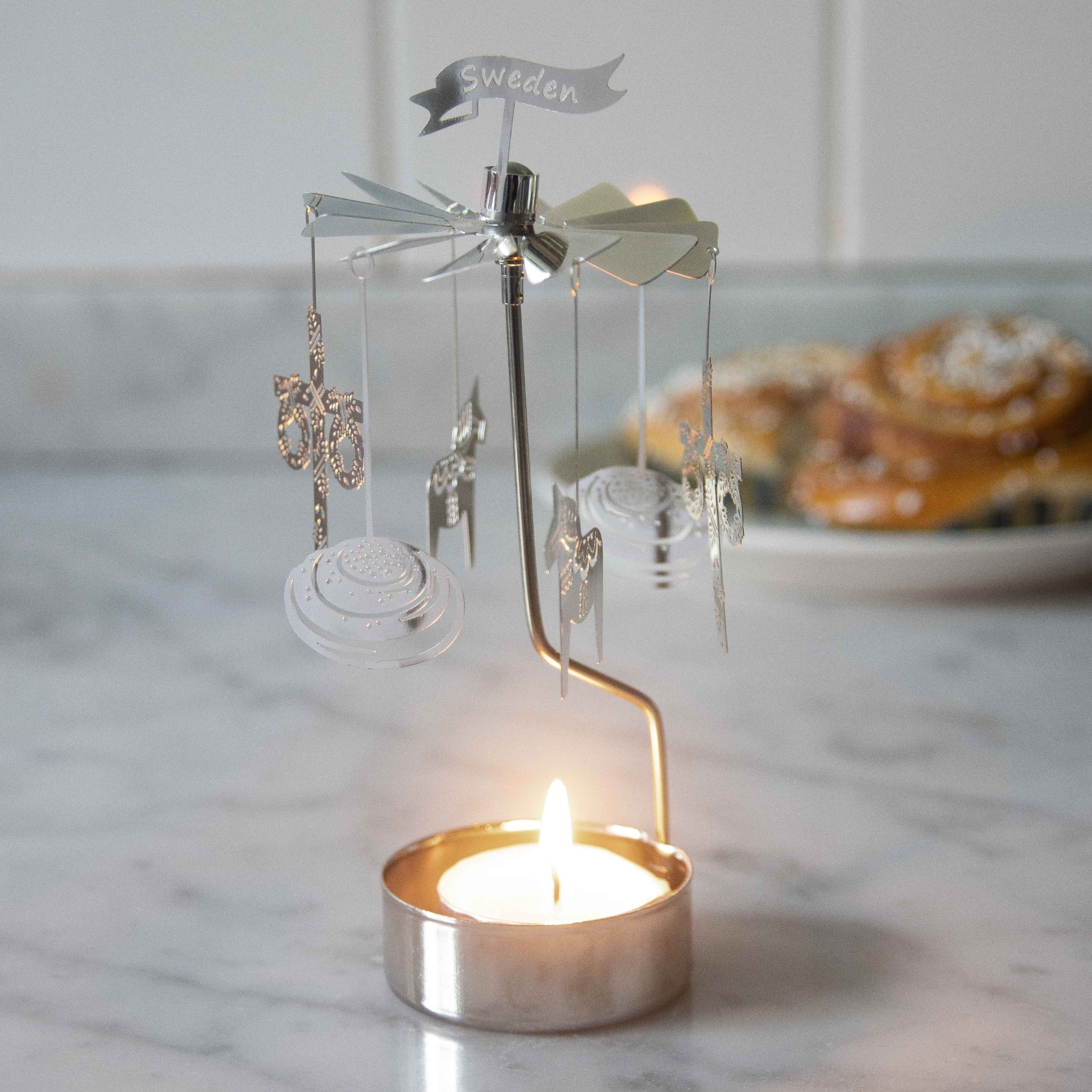 Änglaspel i silverfärgad metall som roterar av värmen från värmeljuset. En dekorativ detalj som skapar rörelse och stämning på bordet eller i fönstret.
