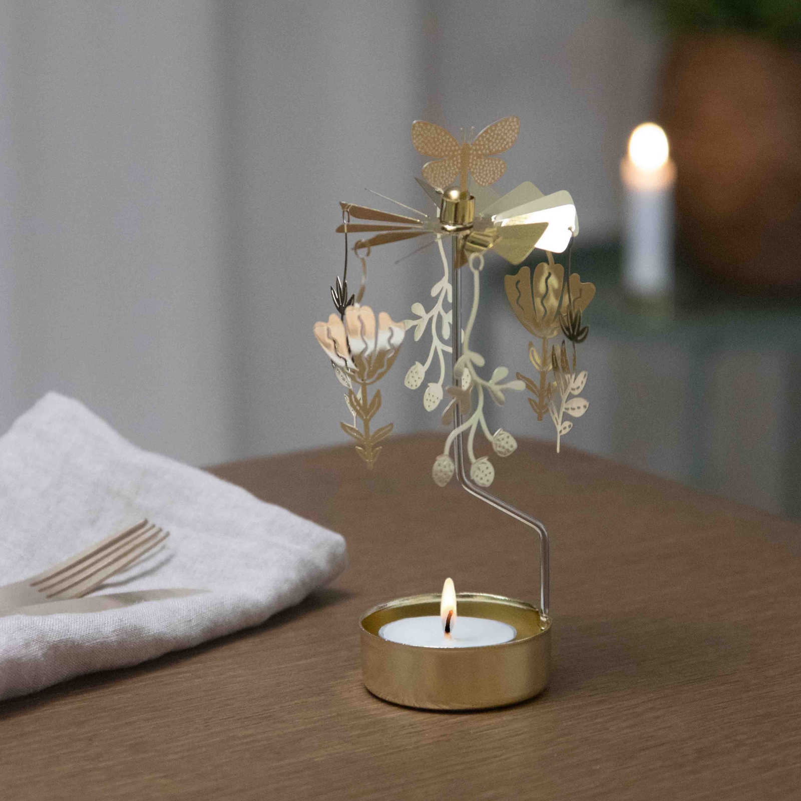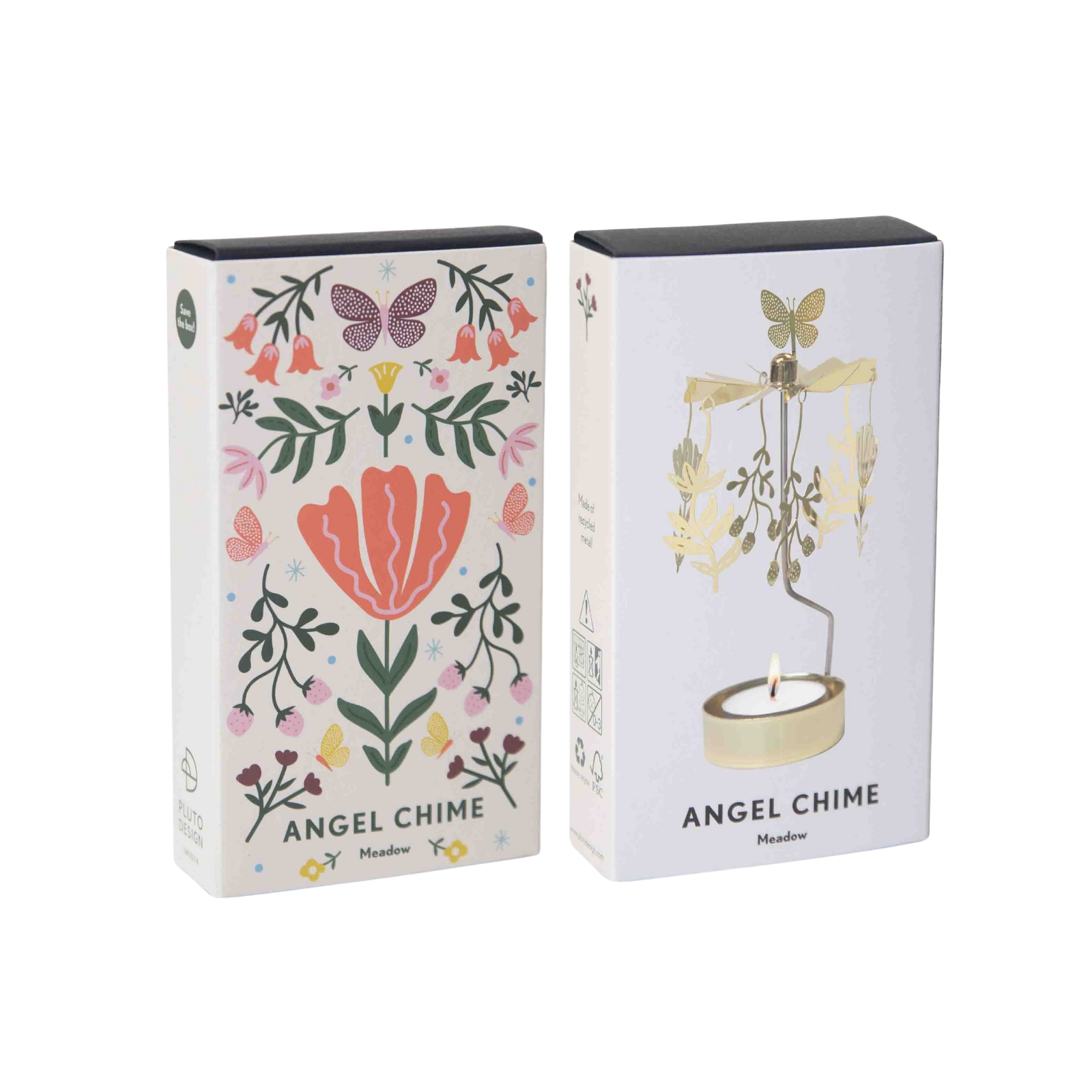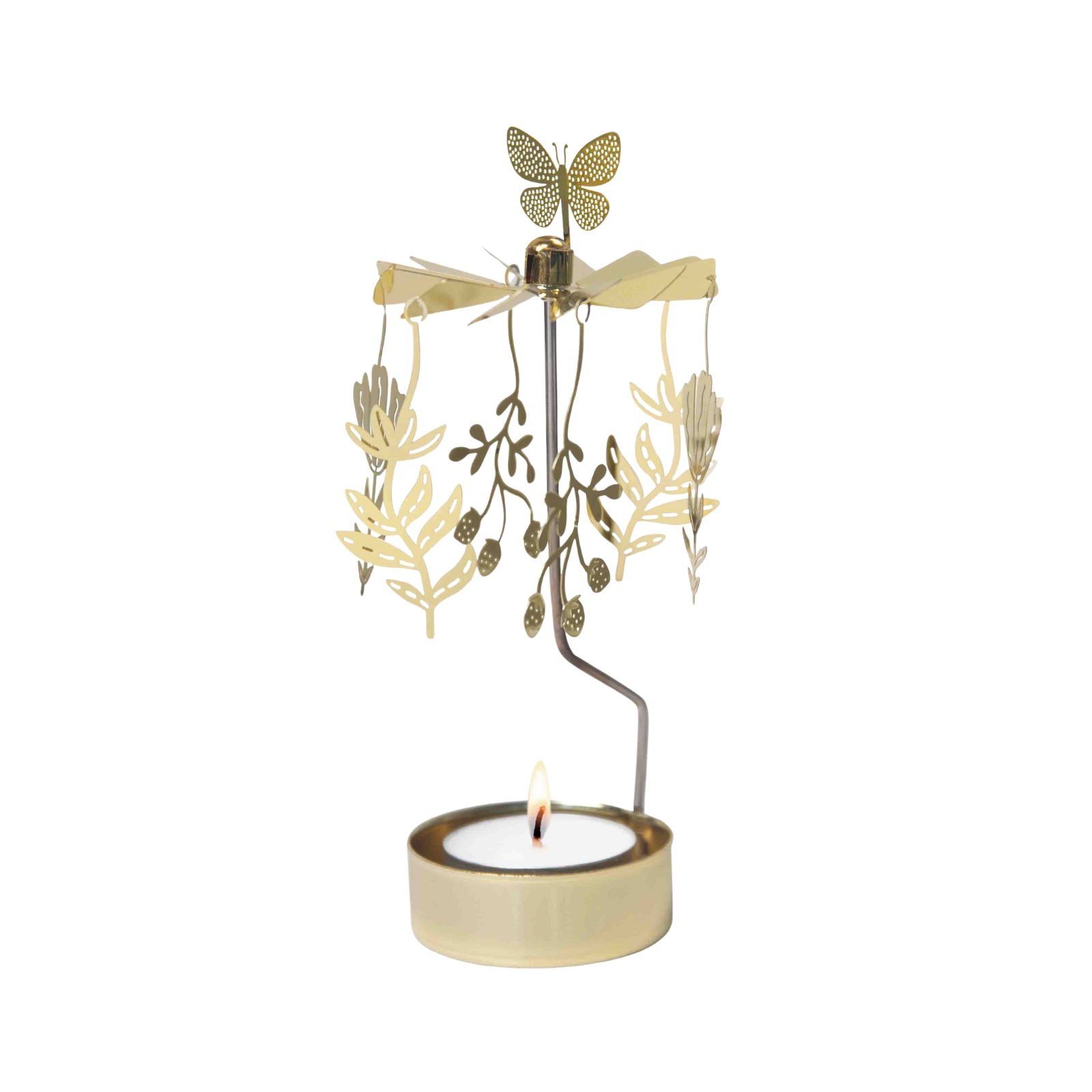Änglaspel för värmeljus inspirerat av en blommande äng med fjärilar och blommor. När ljuset tänds börjar änglaspelet snurra och skapar en mjuk rörelse som ger rummet en varm och levande känsla.
