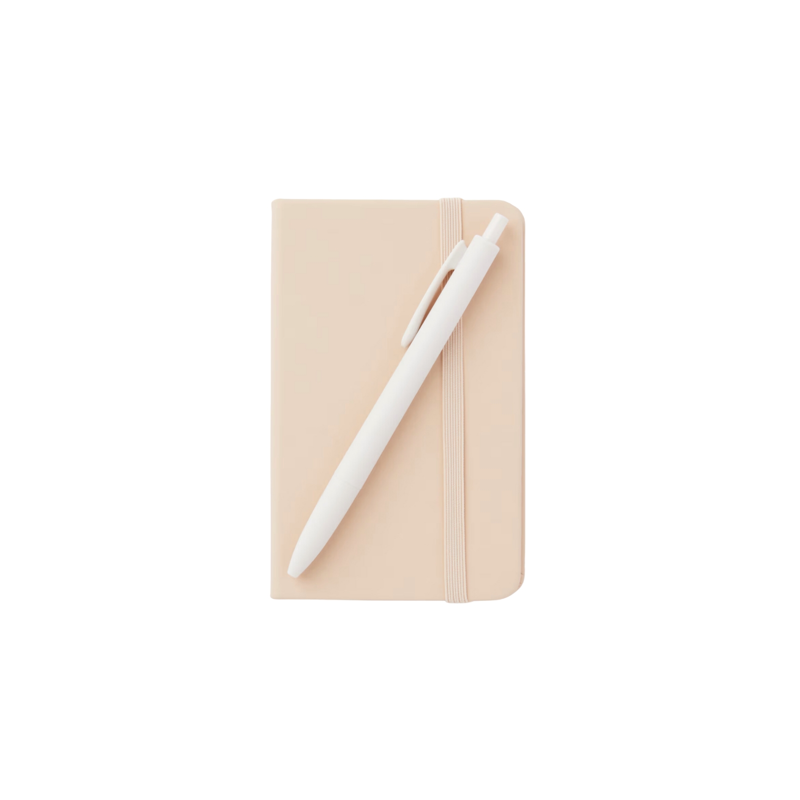 Liten skrivbok klädd i konstläder med färgmatchad elastisk snodd, perfekt att ta med i handväskan eller på resan.