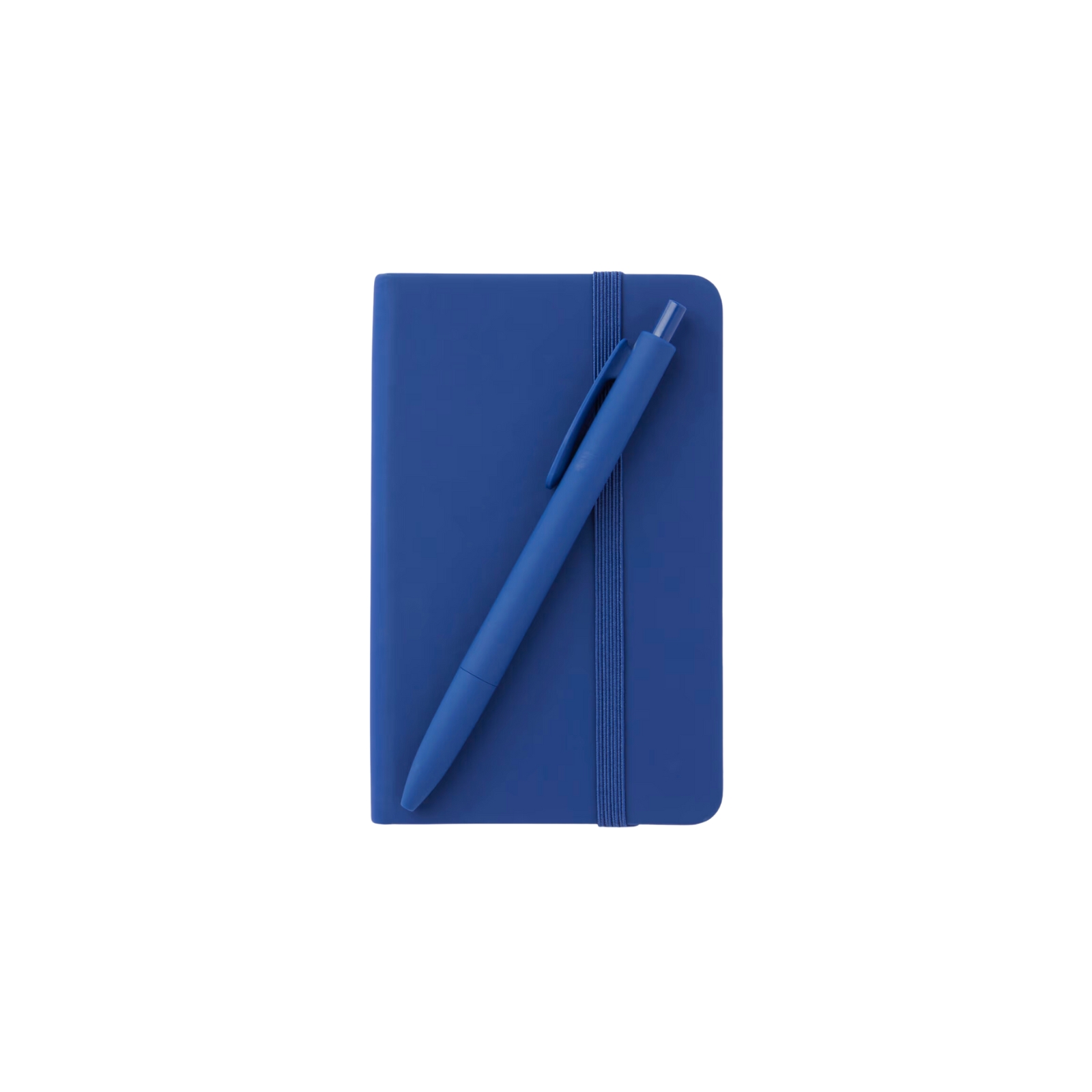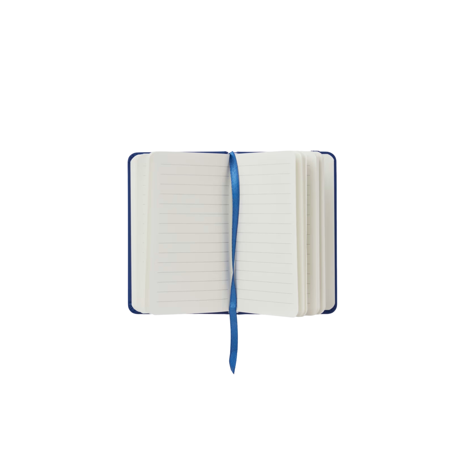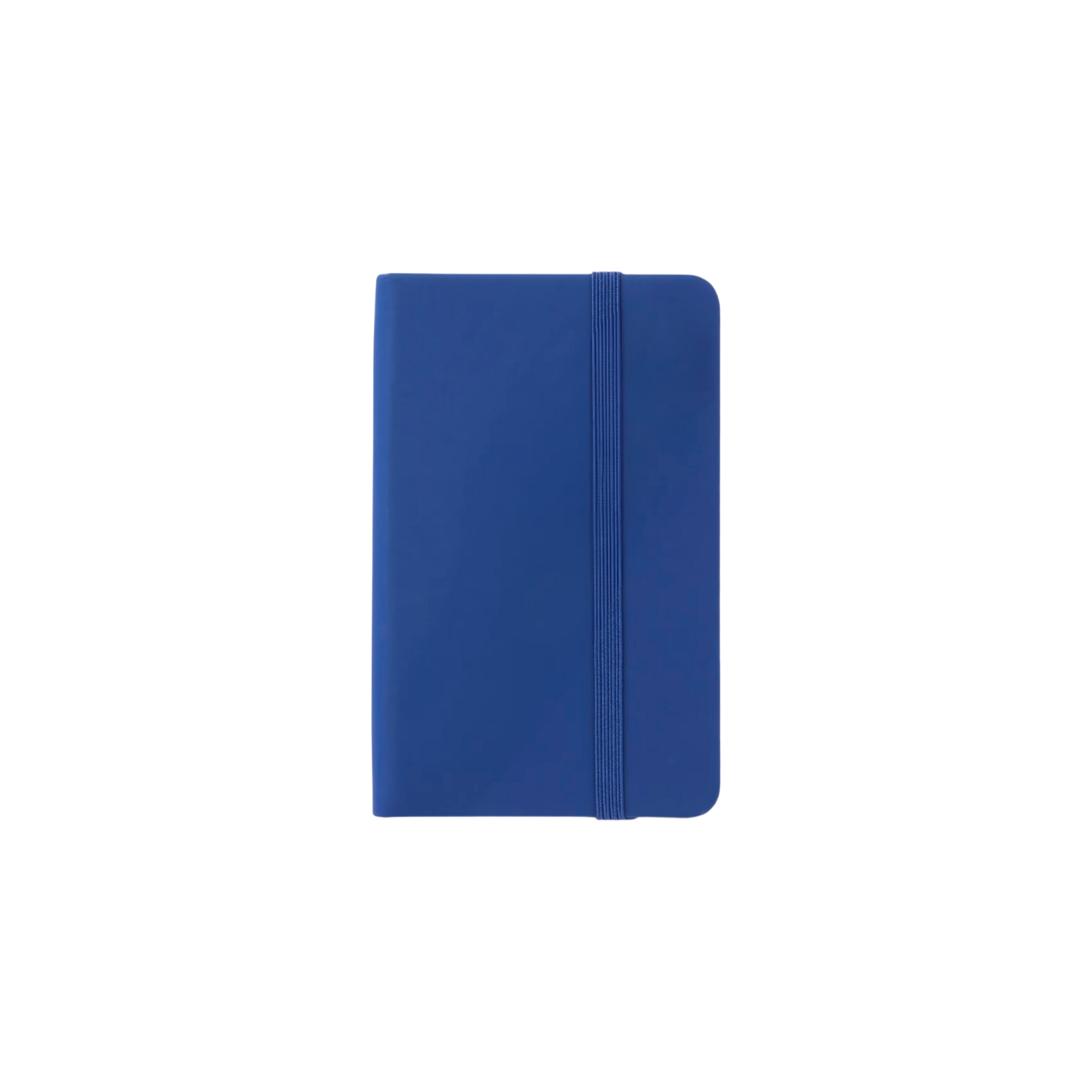 Liten skrivbok klädd i konstläder med färgmatchad elastisk snodd, perfekt att ta med i handväskan eller på resan.