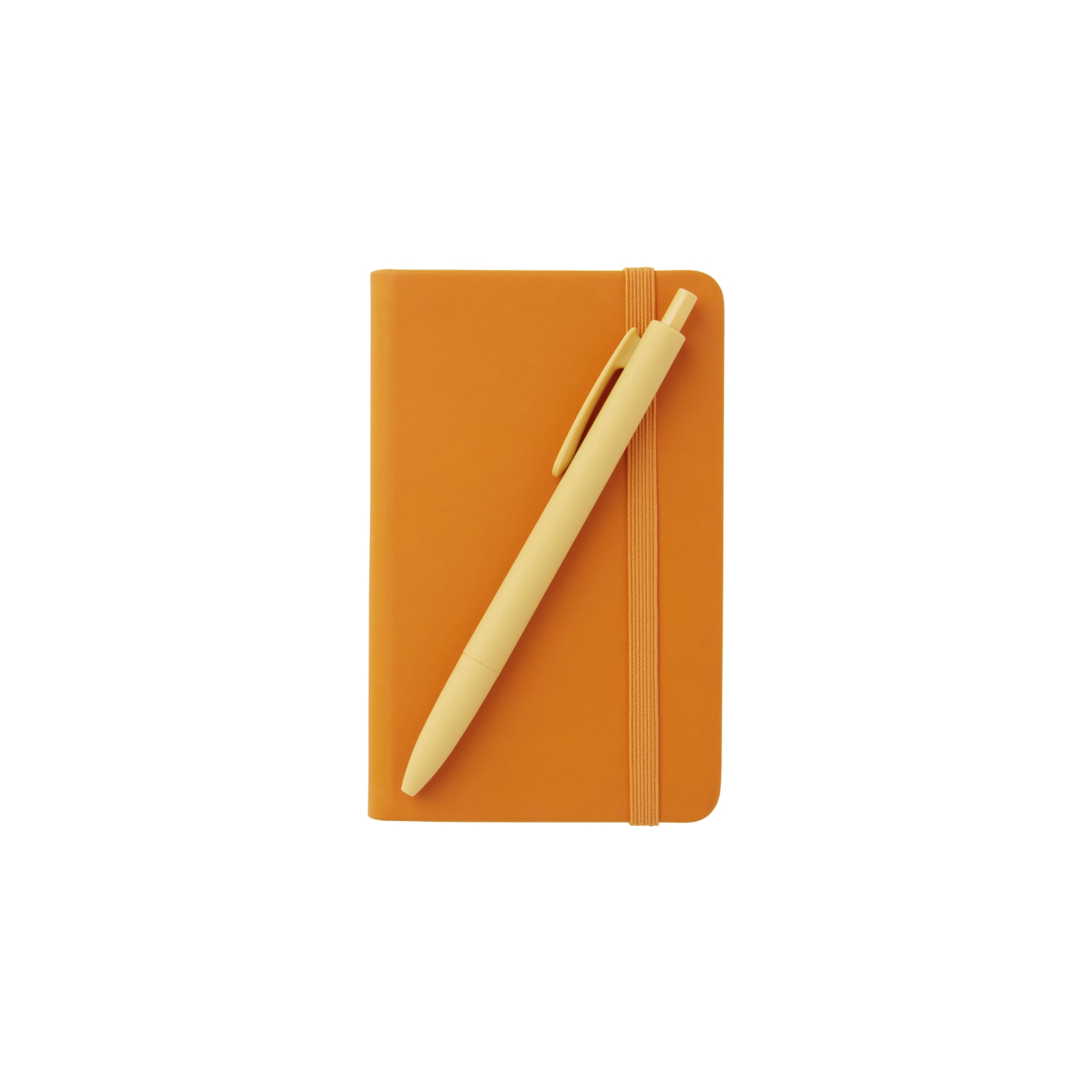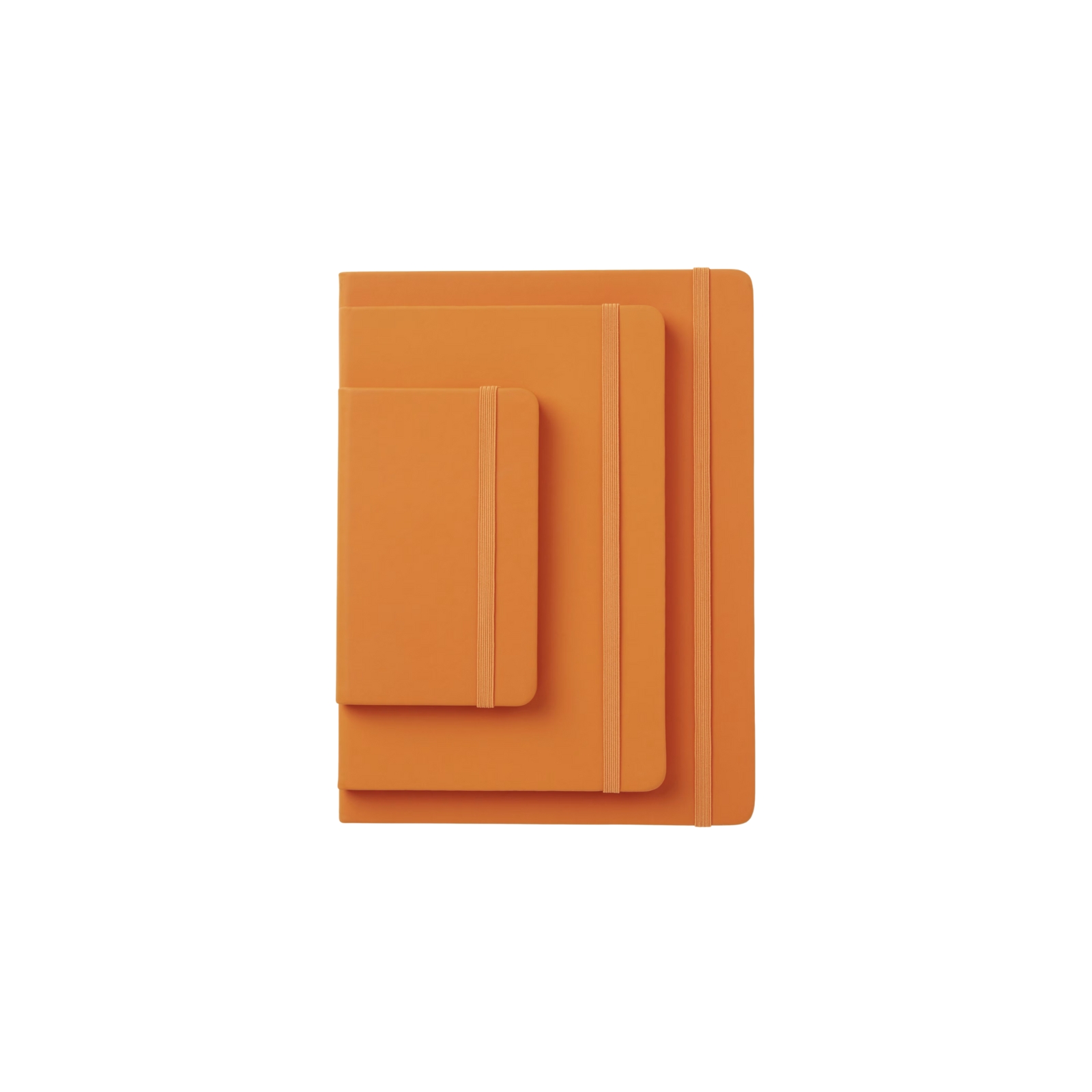 Liten skrivbok klädd i konstläder med färgmatchad elastisk snodd, perfekt att ta med i handväskan eller på resan.