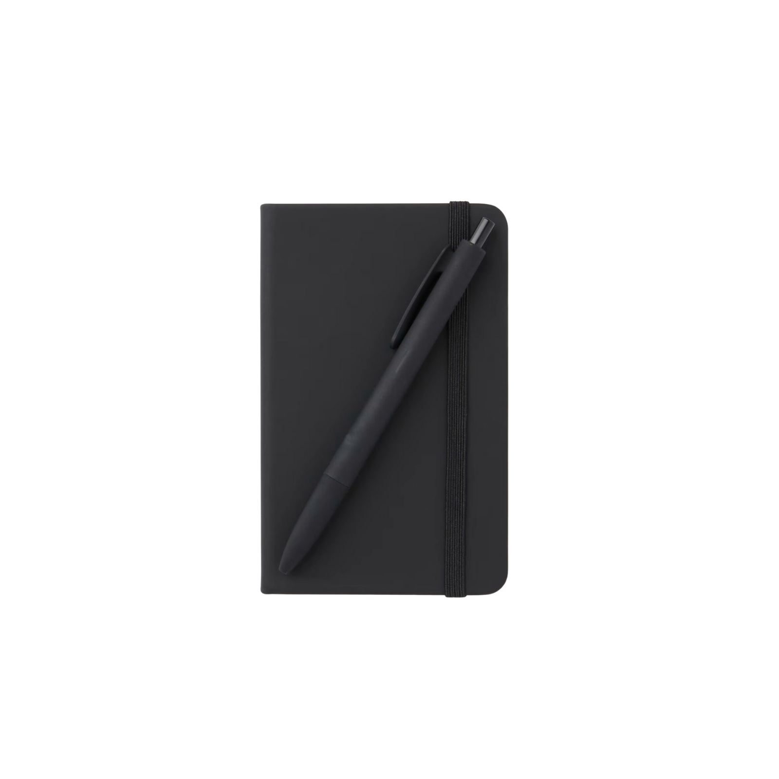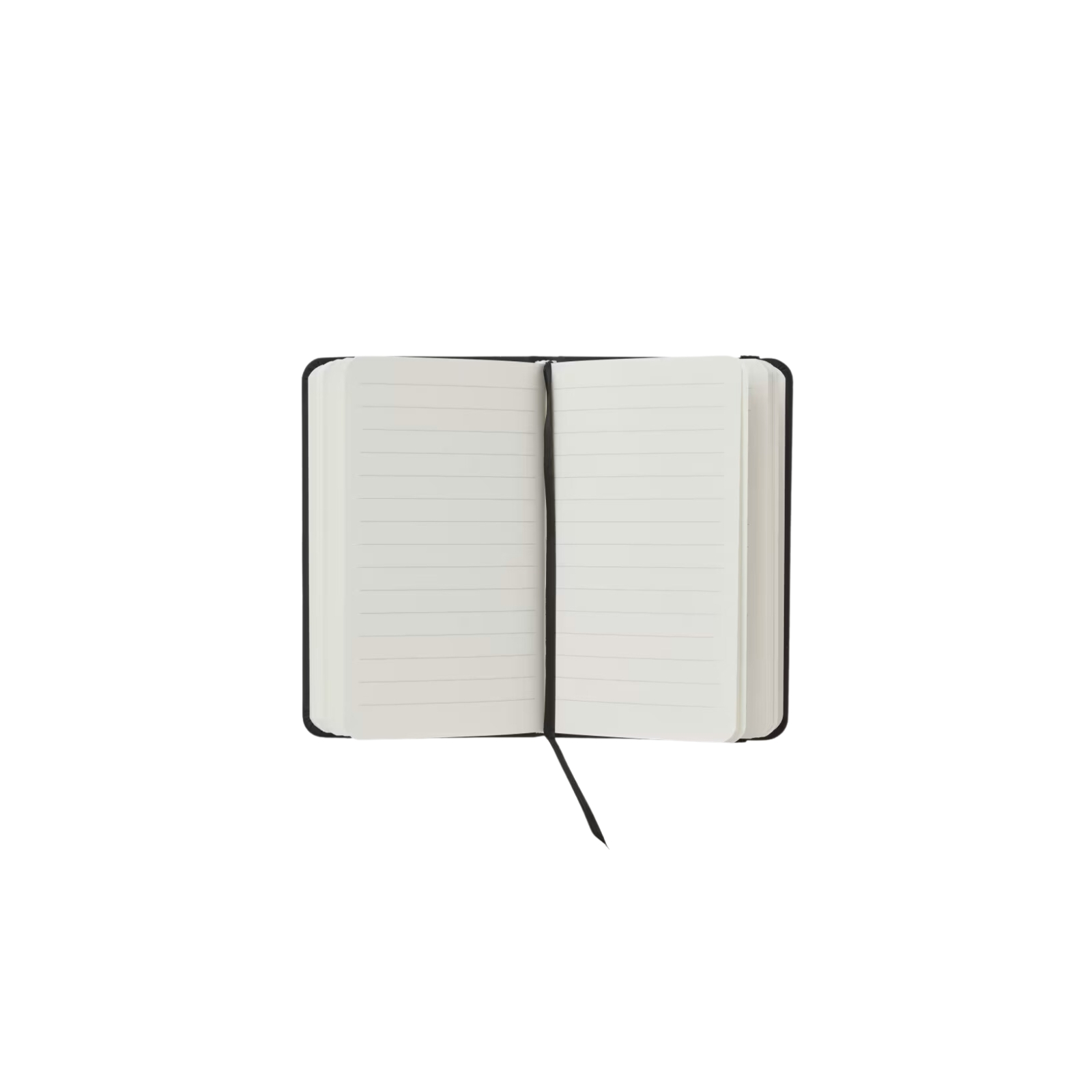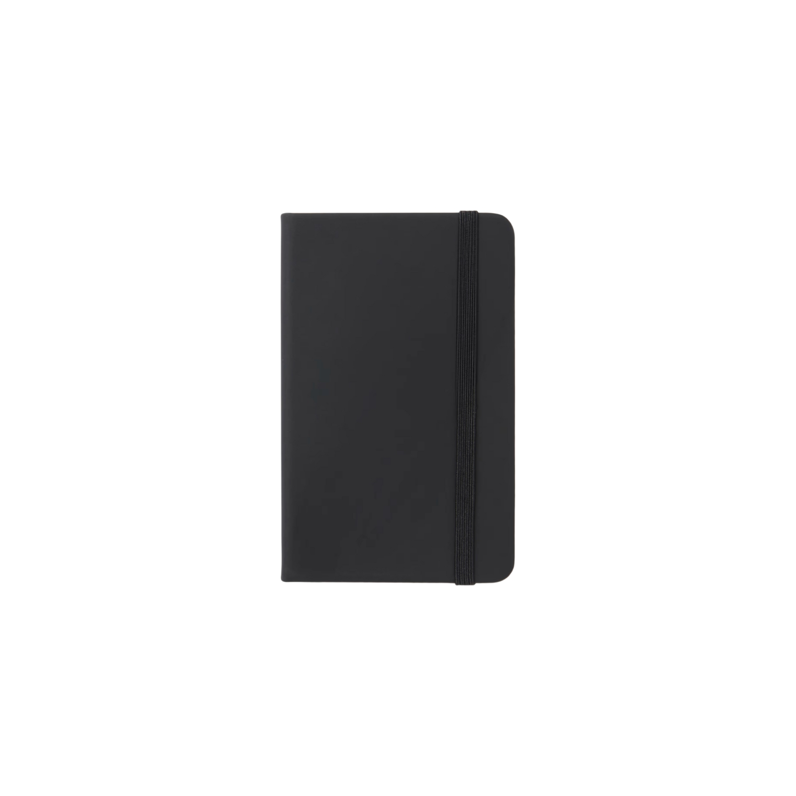 Liten skrivbok klädd i konstläder med färgmatchad elastisk snodd, perfekt att ta med i handväskan eller på resan.