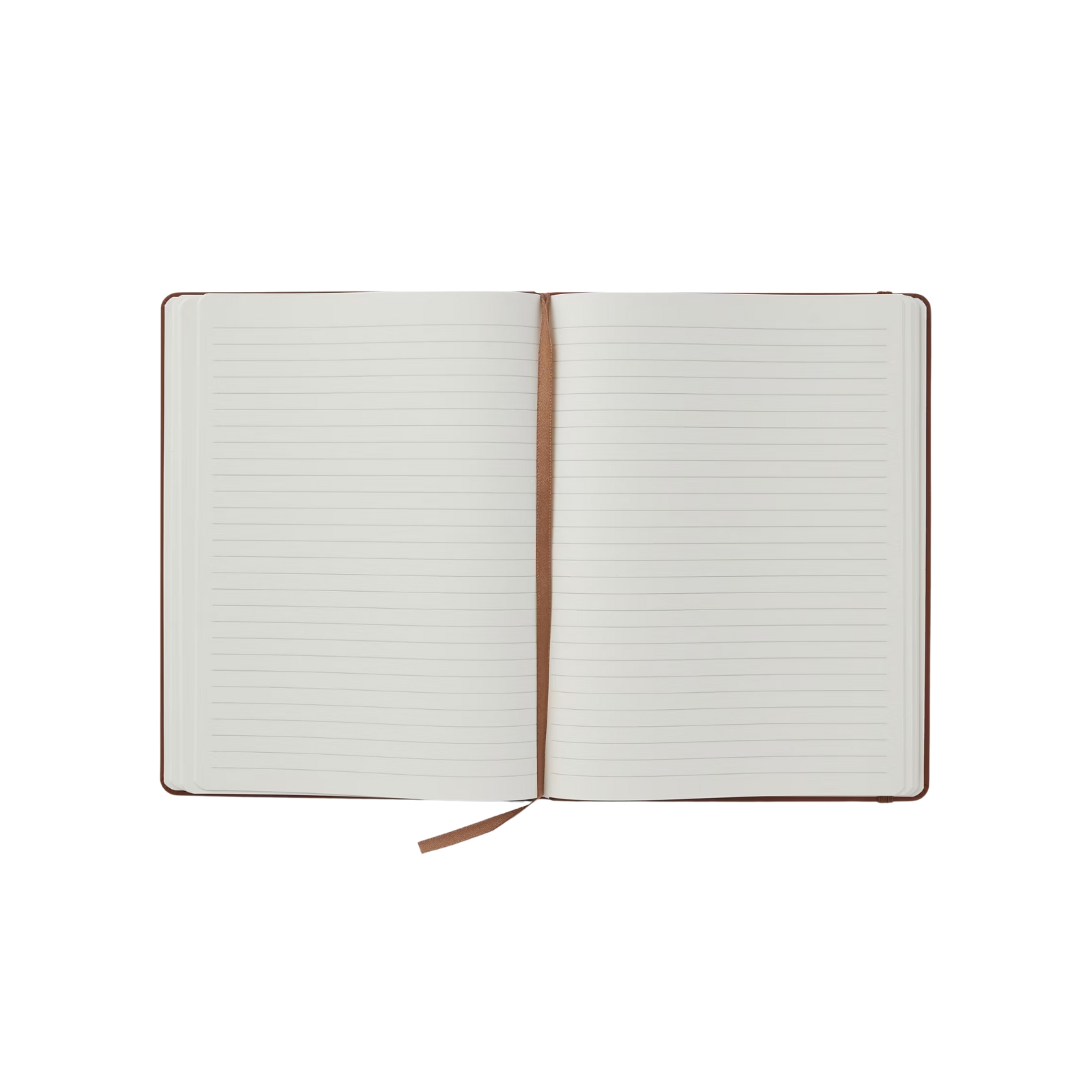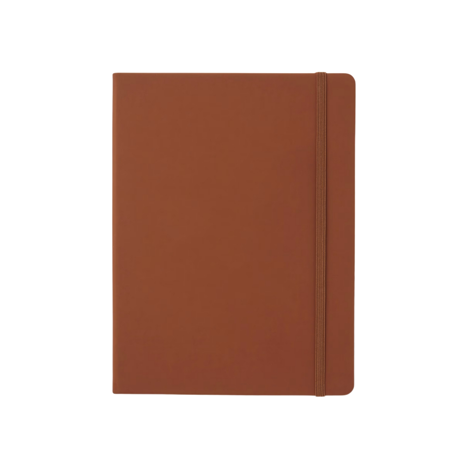 Skrivbok klädd i konstläder med färgmatchad elastisk snodd, perfekt att ta med i handväskan eller på resan.