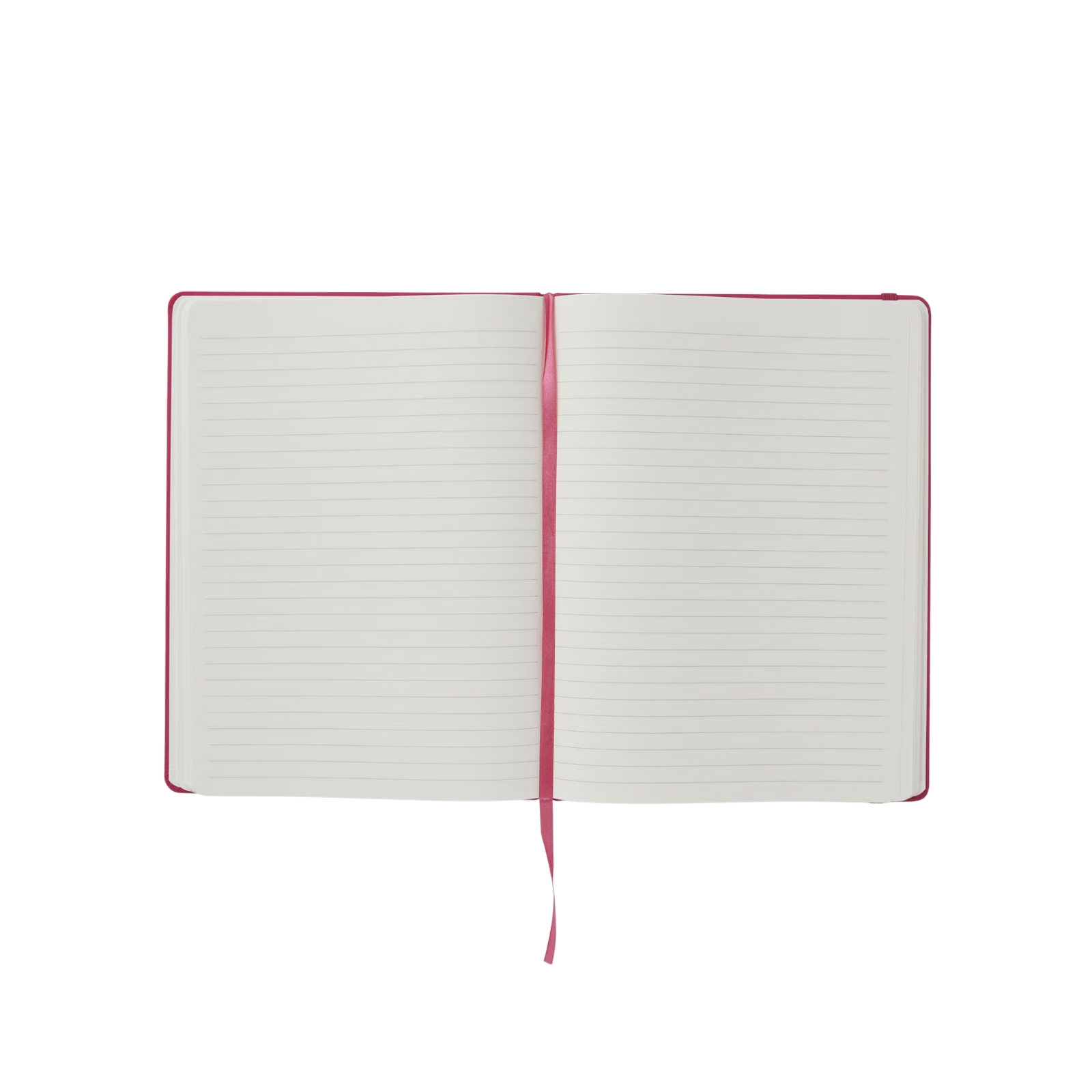 Skrivbok klädd i konstläder med färgmatchad elastisk snodd, perfekt att ta med i handväskan eller på resan.