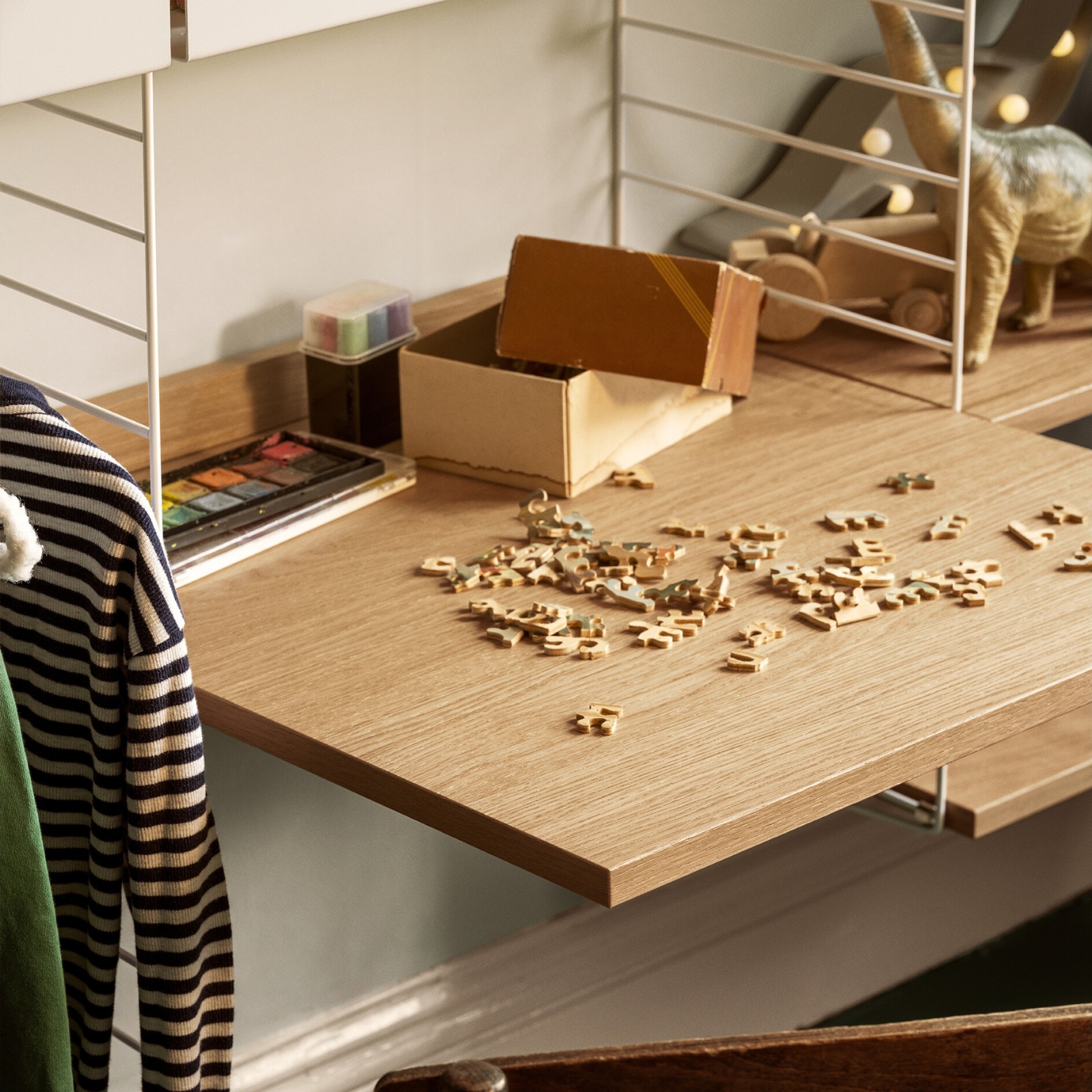 Fixa till arbetsrummet med din egen skräddarsydda Stringhylla. Med den här arbetsskivan i lackad MDF förvandlar du din String-hylla till en kompakt arbetsplats. Perfekt för dig med begränsat utrymme.