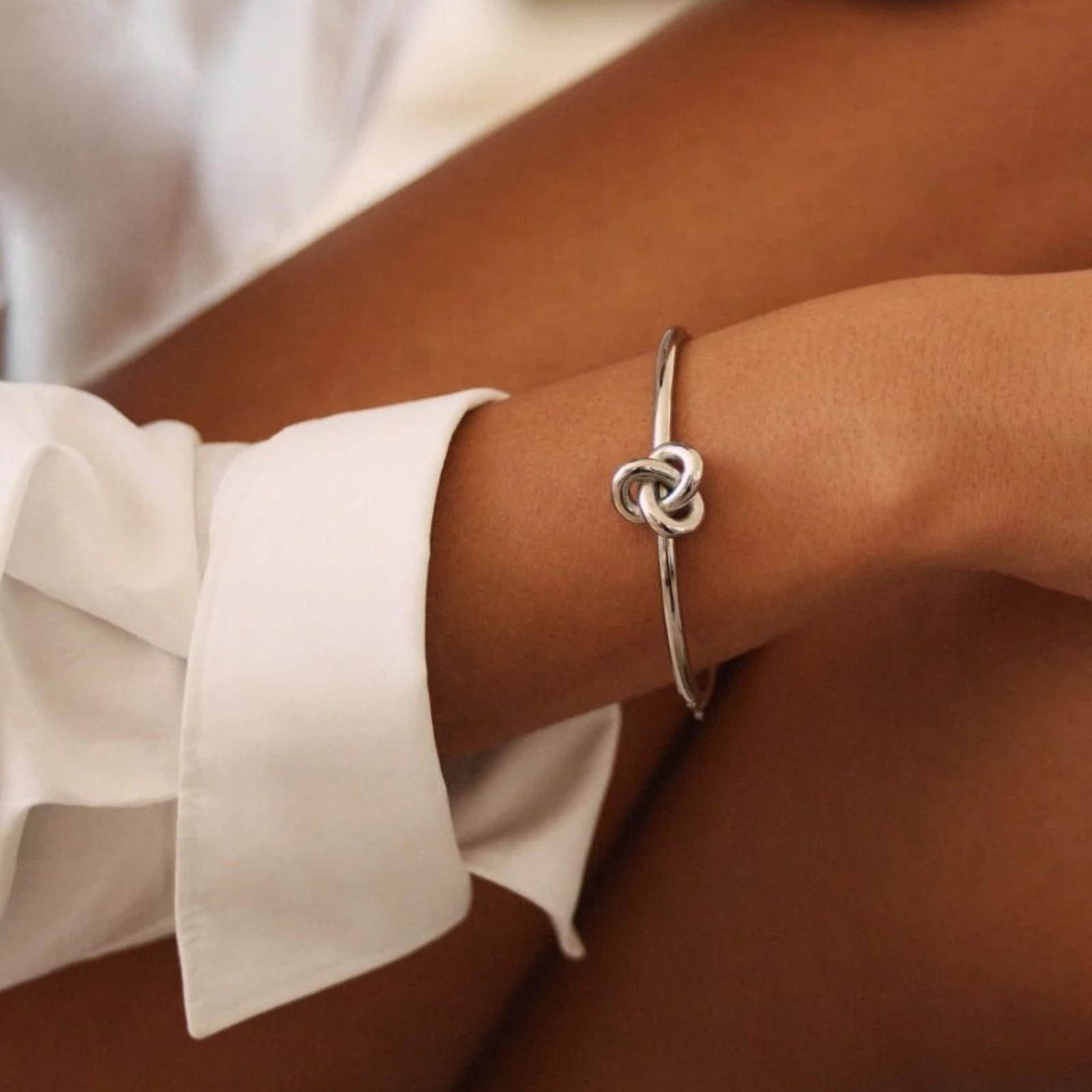 Den skulpturala evighetsknuten i serien Infinity Knot är en tidlös klassiker. De obrutna linjerna i knuten symboliserar kontinuitet. En kraftfull symbol som passar alla tillfällen. Här i en överdimensionerad bangle med knutformen i blankt rostfritt stål. Fint att kombinera med seriens större ring, längre halsband eller större studs.