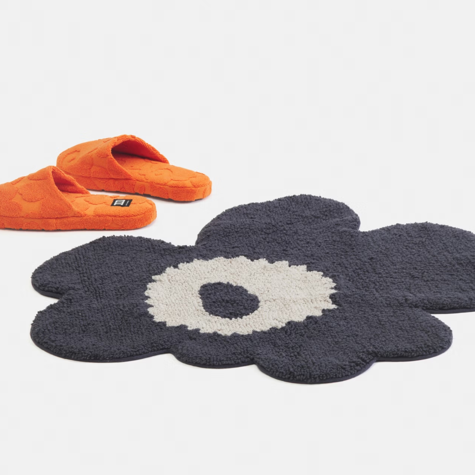 Den blommformade badrumsmattan Unikko är tuftad i mjuk ekologisk bomull och ger badrummet en lekfull men stilren känsla. Den handskurna formen och den mjuka ytan gör varje matta unik, med små naturliga variationer som ger det där lilla extra. För att ligga stadigt på plats är mattan försedd med halkskydd på baksidan.