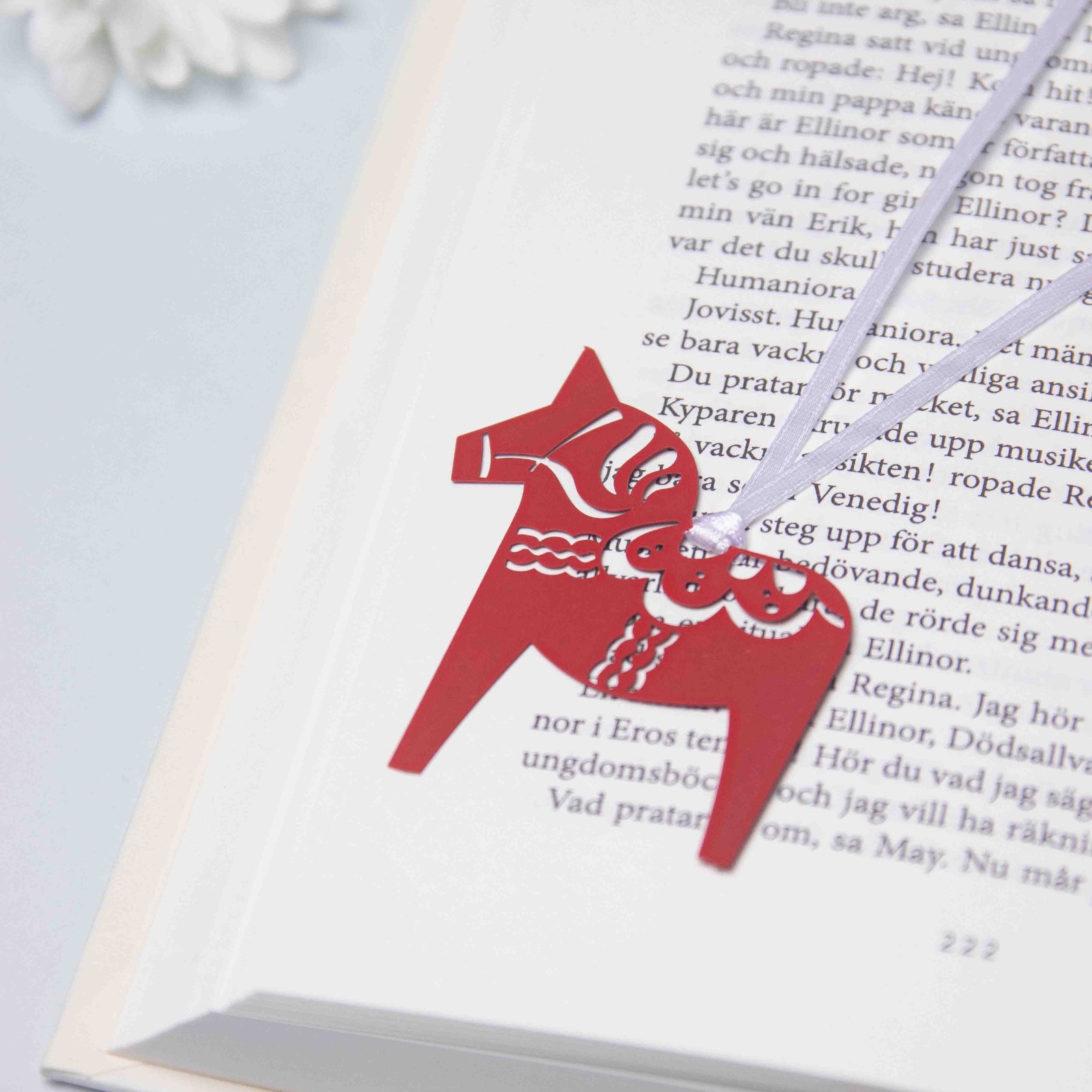 Bokmärke med en klassisk dalahäst som ger läsningen en personlig detalj med svensk tradition. Ett fint tillbehör för bokälskaren som vill sätta lite extra karaktär på sin läsupplevelse.