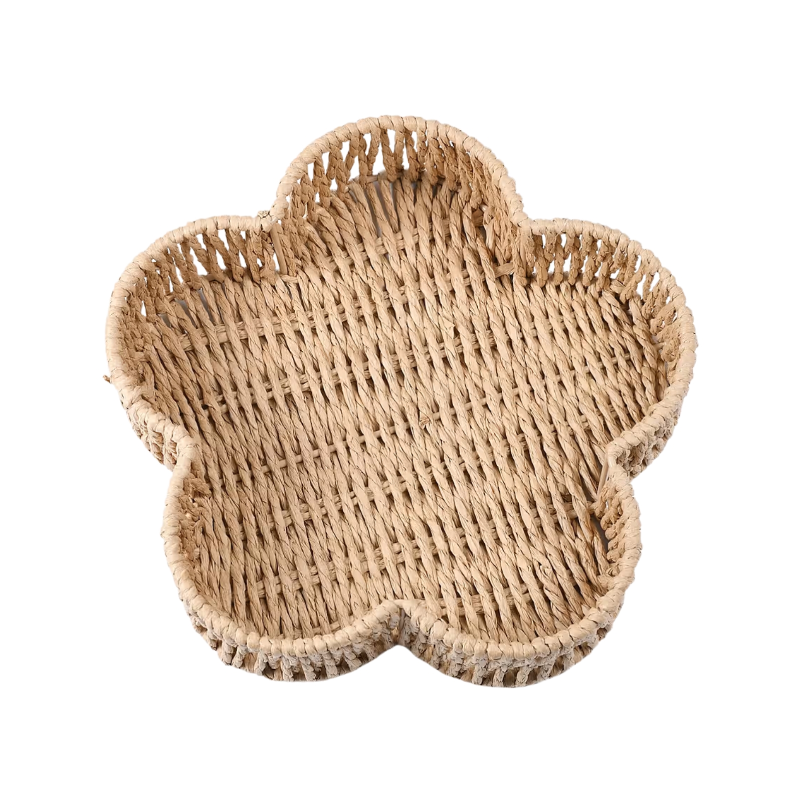 Brödkorg med formen av en blomma, tillverkad av järn och flätad pappersstrå.