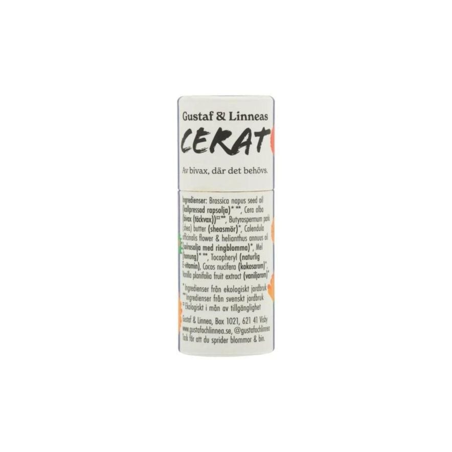 Ekologiskt, handgjort och naturligt cerat av bivax i smaken ringblomma. Ceraten är gjorda för att mjuka upp hela kroppen - allt från läppar till armbågar och hälar. Ceraten tillverkas med svenskt bivax vilket gör det #närpollinerat och bidrar till att sprida blommor och bin över Sverige för en mer hållbar framtid. Ceraten kommer istället för i en traditionell plastförpackning i en återvinningsbar pappförpackning av högsta kvalitet med vacker gotländsk design. Ceraten kommer i fyra smaker; Honung, Kokos & honung, Pepparmynta och Ringblomma.