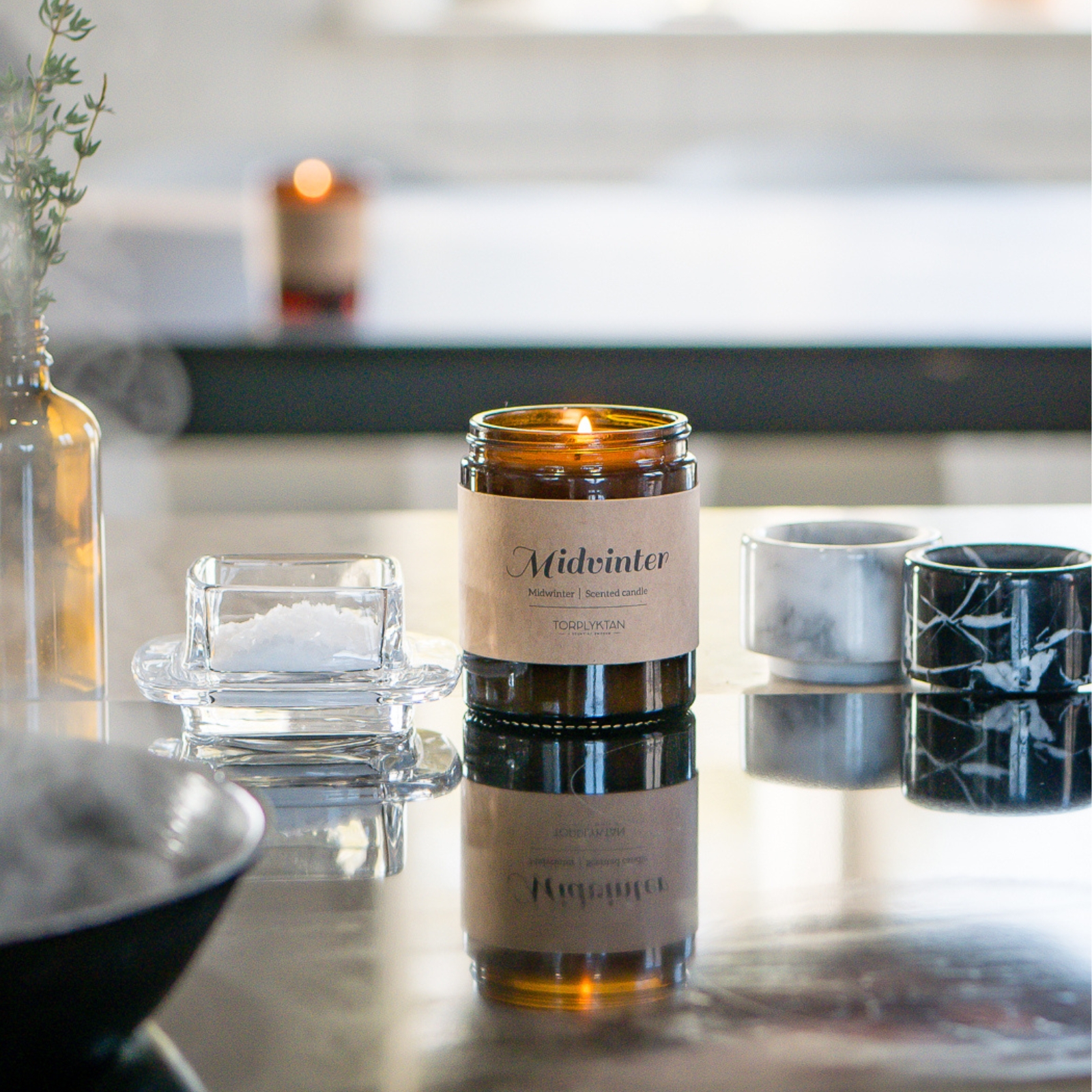 Doftljuset Midvinter ger en mjuk och värmande doft av sandelträ och cederträ som smälter samman med en subtil ton av rostad vanilj. Ljuset ger en omslutande känsla av lugn och harmoni.