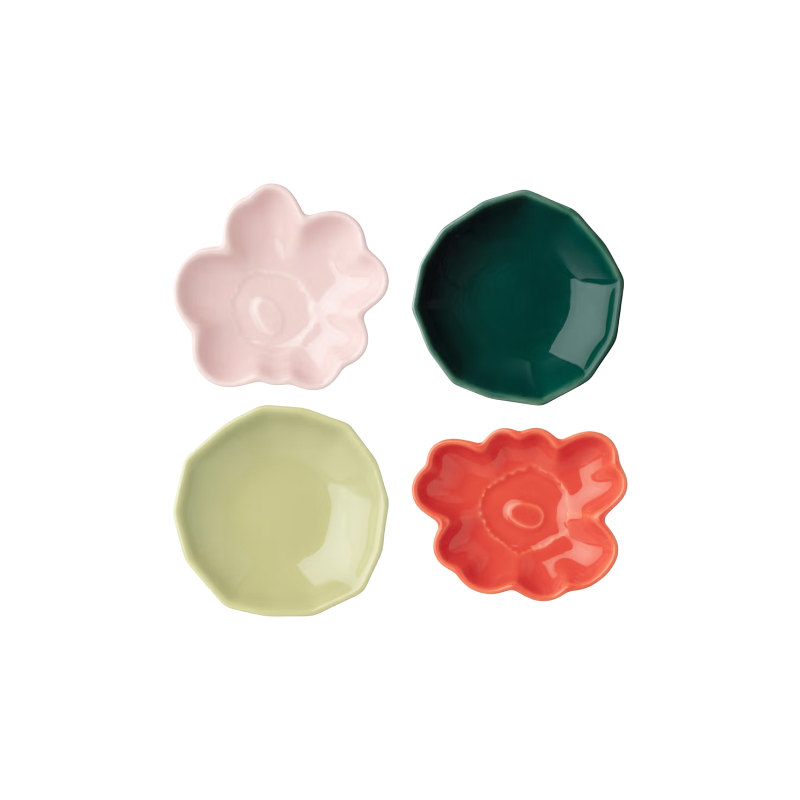 Det här setet består av fyra små tallrikar med ikoniska mönster. Två är formade som Unikko-blommor och två har formen av Kivet-mönstret. Tallrikarna är tillverkade i keramik och har glasyrer i olika färger som ger ett lekfullt och dekorativt uttryck. Vi rekommenderar handdisk för att bevara både form och yta över tid.