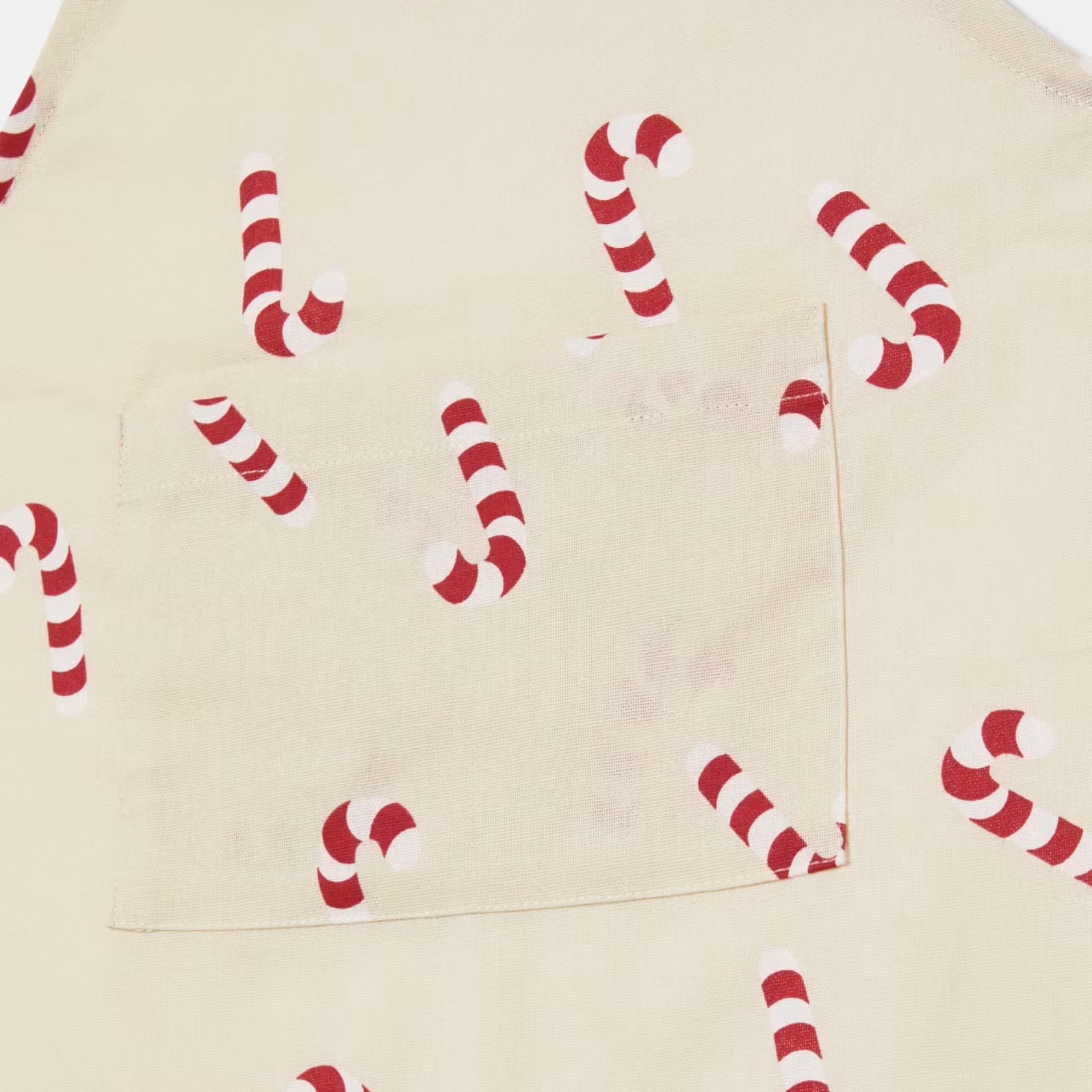 Förklädet har en ficka framtill, justerbart band runt halsen och knytband i midjan.