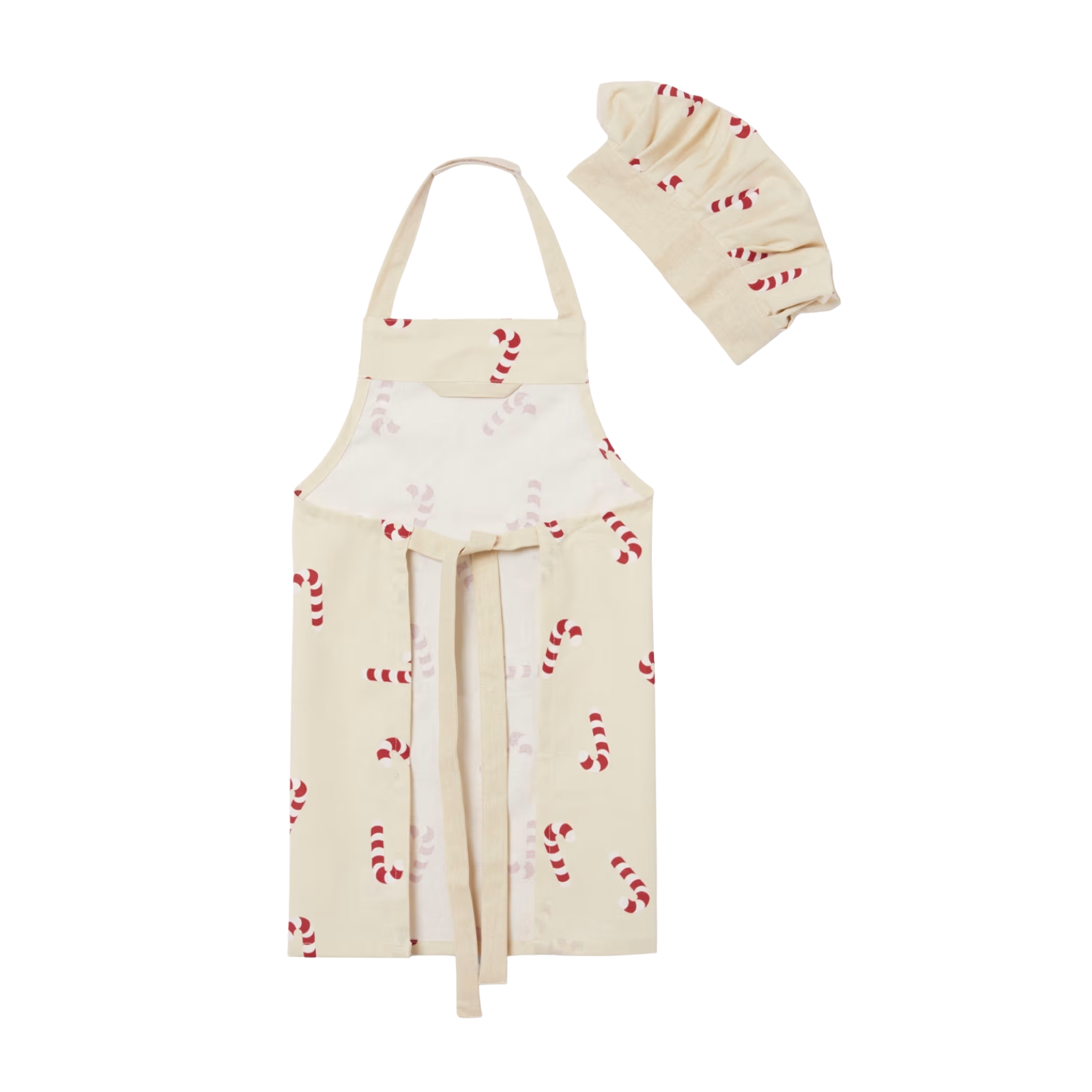 Mönstrat set med ett förkläde och kockmössa för den lilla hemmakocken.