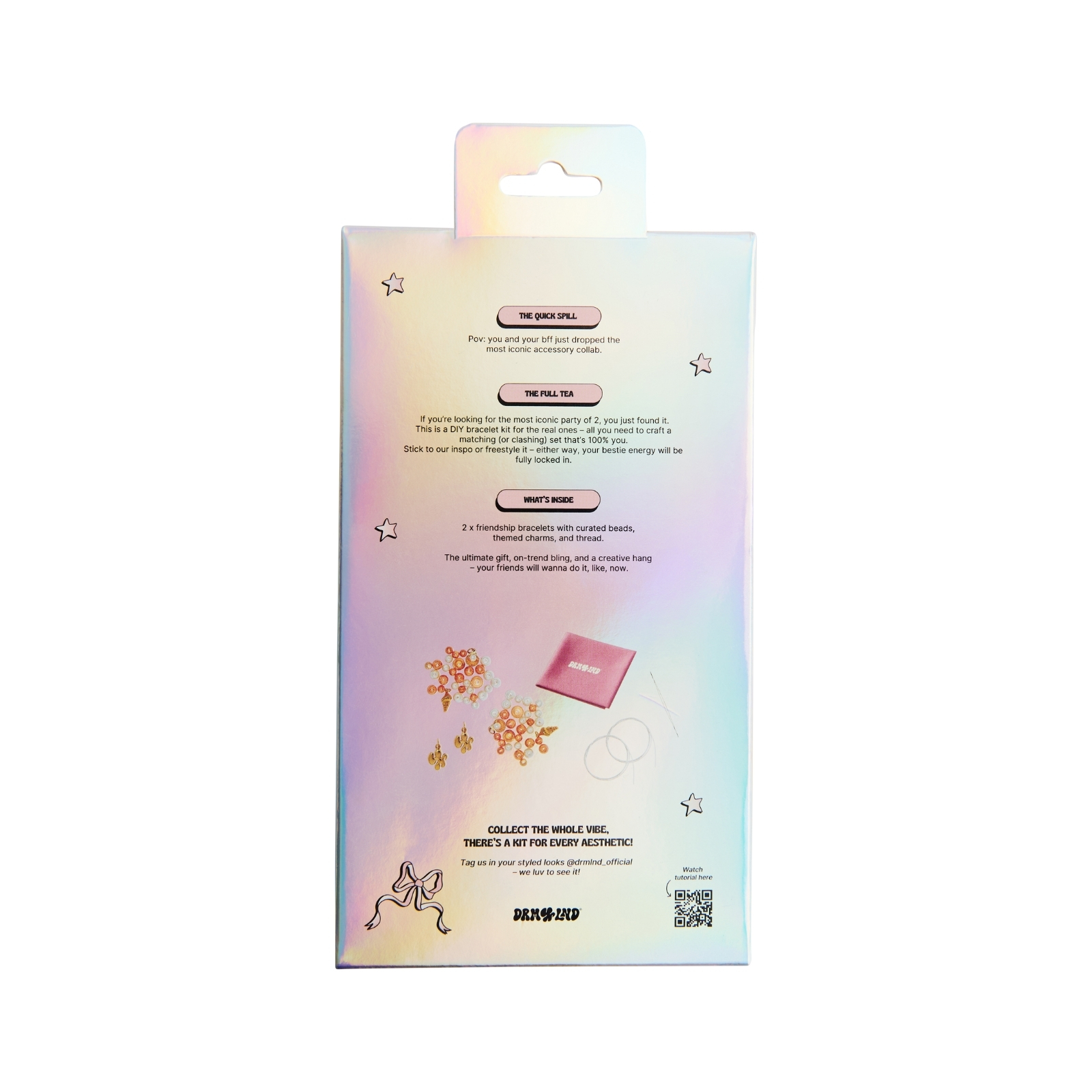 Två armband – ett till dig och ett till din bästis. Med DRM-LND:s kreativa armbandskit skapar du enkelt ett personligt set tillsammans med någon du tycker om. Varje kit innehåller två armband att designa och dela, och finns i fem olika stilar att samla på, från sött och pastelligt till färgstarkt och lekfullt.