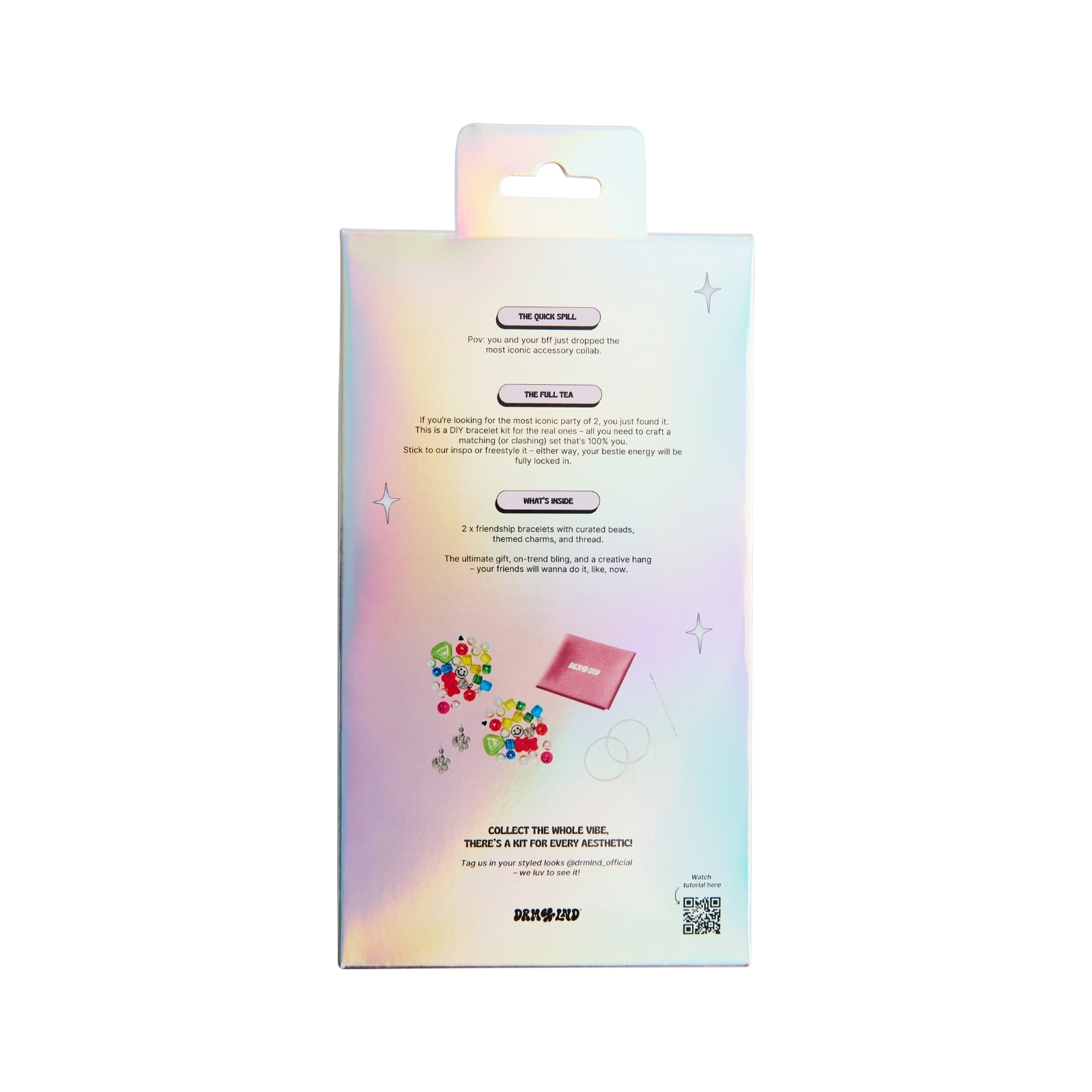 Två armband – ett till dig och ett till din bästis. Med DRM-LND:s kreativa armbandskit skapar du enkelt ett personligt set tillsammans med någon du tycker om. Varje kit innehåller två armband att designa och dela, och finns i fem olika stilar att samla på, från sött och pastelligt till färgstarkt och lekfullt.