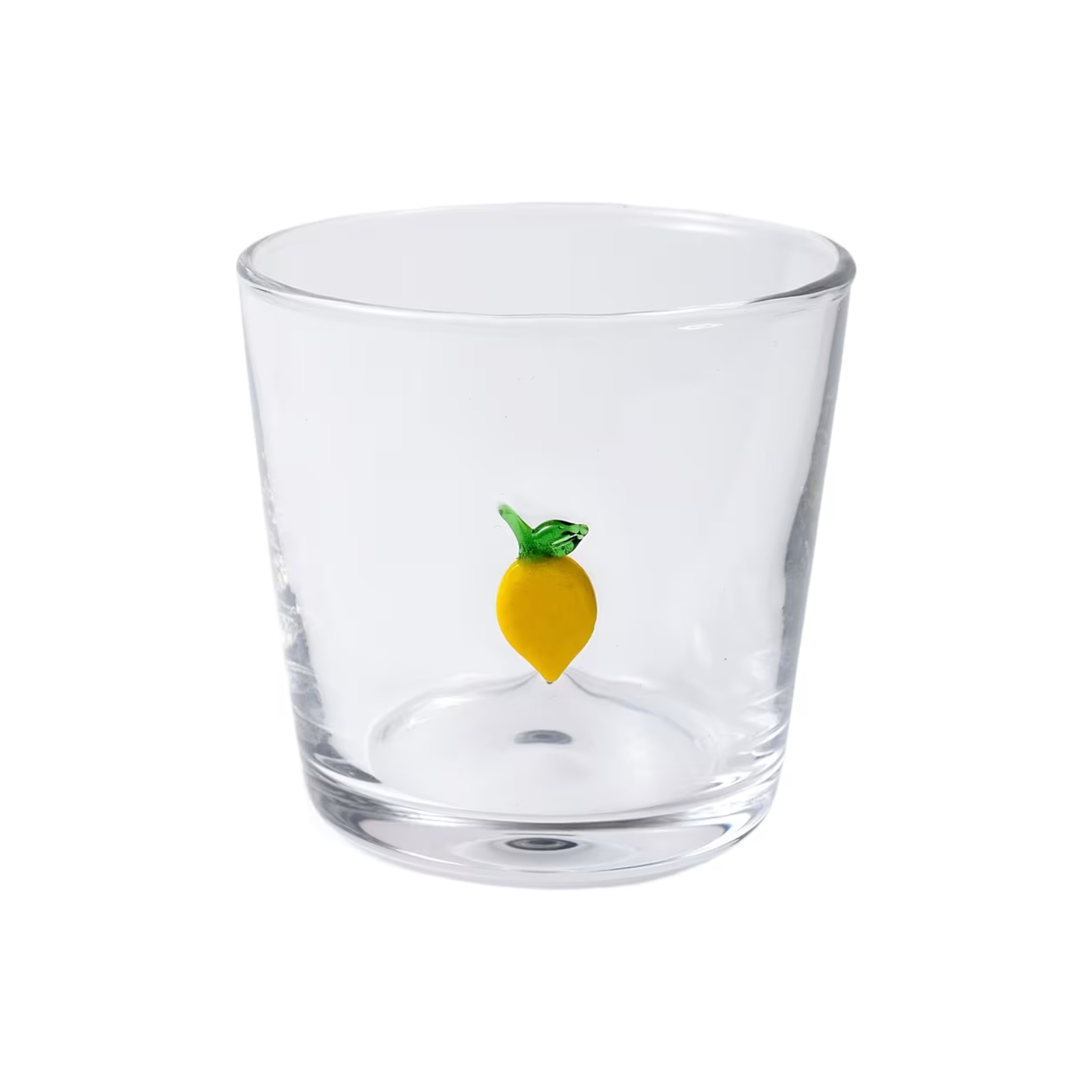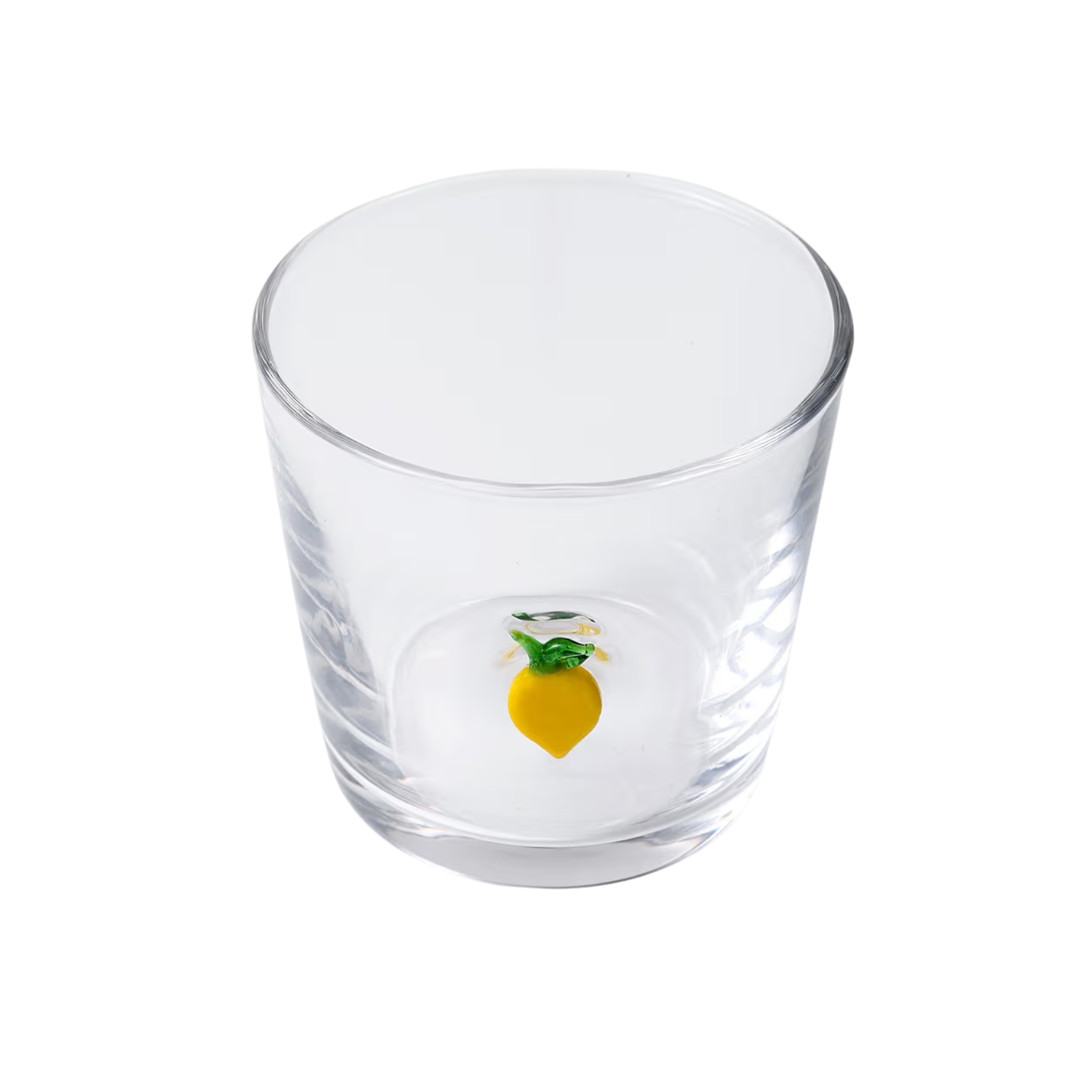 Dricksglas i tumblermodell med en dekorativ citron på sidan.
