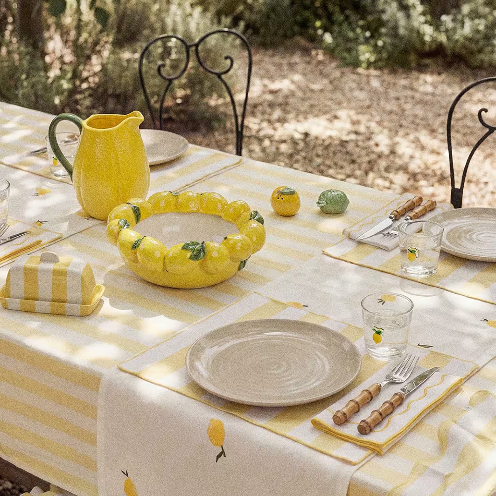 Skapa din egen unika dukning. Med vackert målad keramik i oräkneliga kombinationer, tunna glas och textiler med lekfulla detaljer – som volanger, klassiska ränder och broderade kanter. En kreativ färginjektion, som för tankarna till stora middagar i skuggan under citronträden.