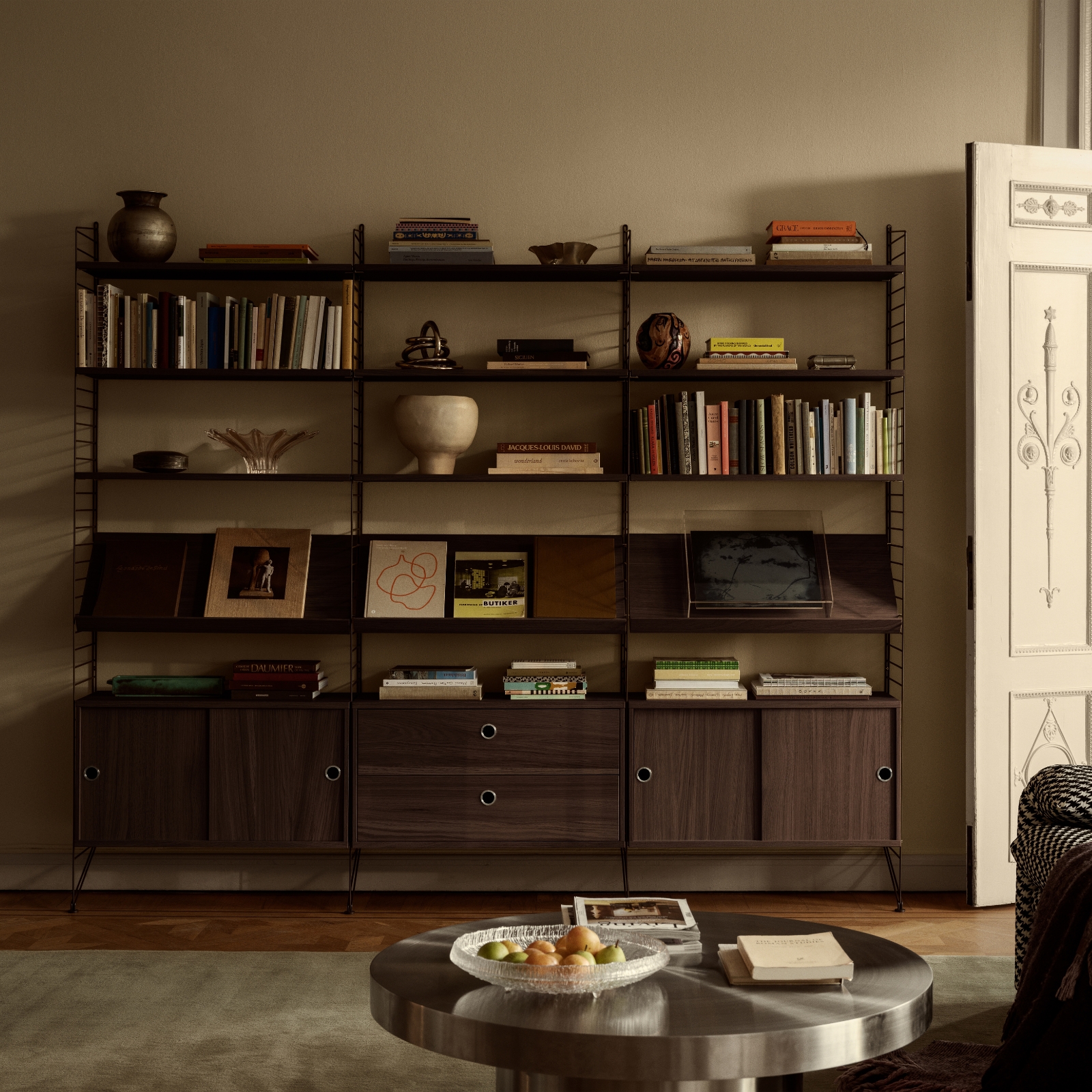 Stringhyllan ritades redan 1949 av arkitekten Nisse Strinning och har tack vare sin smarta konstruktion blivit en tidlös designklassiker. Med den flexibla pockethyllan får du en kompakt och stilren lösning för mindre utrymmen, medan det modulära hyll-systemet kan byggas ut, kombineras och anpassas efter behov och smak. Genom ritverktyget går det enkelt att planera och visualisera sin egen String-lösning, välj färg, material och mått för att skapa en personlig kombination som passar alla rum. String Furniture står för funktionell, hållbar och stilren design med produktion i Sverige sedan mitten av 1900-talet.