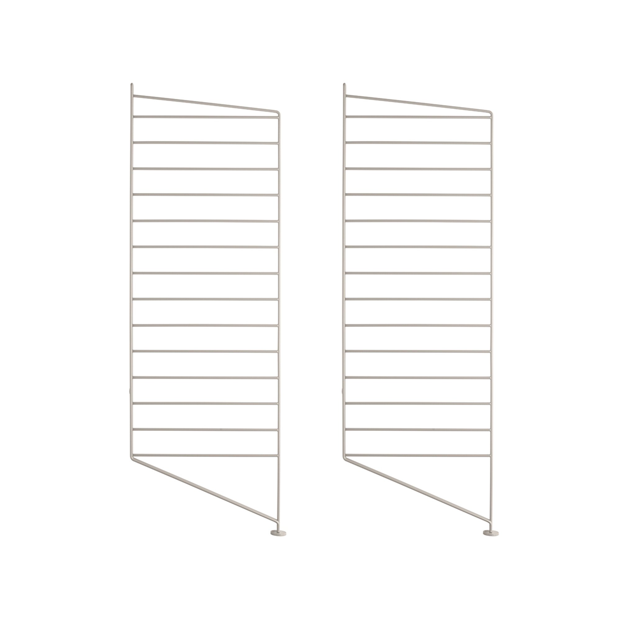 Golvgavlar finns i tre höjder, 85 cm, 115 cm, 200 cm, samt ett djup, 30 cm. Gavlarna är basen för att bygga din stringhylla. Därefter kan du addera produkter från String System förutsatt att de har 30 cm djup. Välj mellan en rad olika produkter så som hyllplan, skåp, lådhurtsar och tidskriftshyllor. Golvgaveln vilar mot golvet med sin fot vilket gör den väldigt stabil men samtidigt ger en lätt och luftig känsla. För att göra din hylla ännu mer funktionell och unik kan du komplettera med organizers, knivblock eller en tidskriftssamlare som hängs på gaveln. Golvgavlarna säljs i både 1-pack och 2-pack.