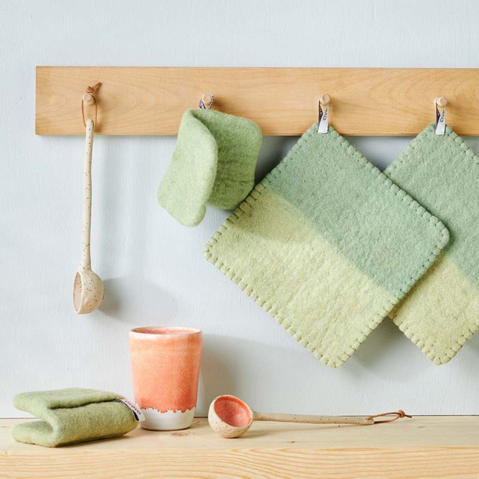 En färgstark och handgjord grytlapp i 100% ull som gör matlagningen både enklare och roligare. Ullen har naturligt värmeisolerande och smutsavvisande egenskaper, vilket gör den perfekt för köket och alla varma moment.