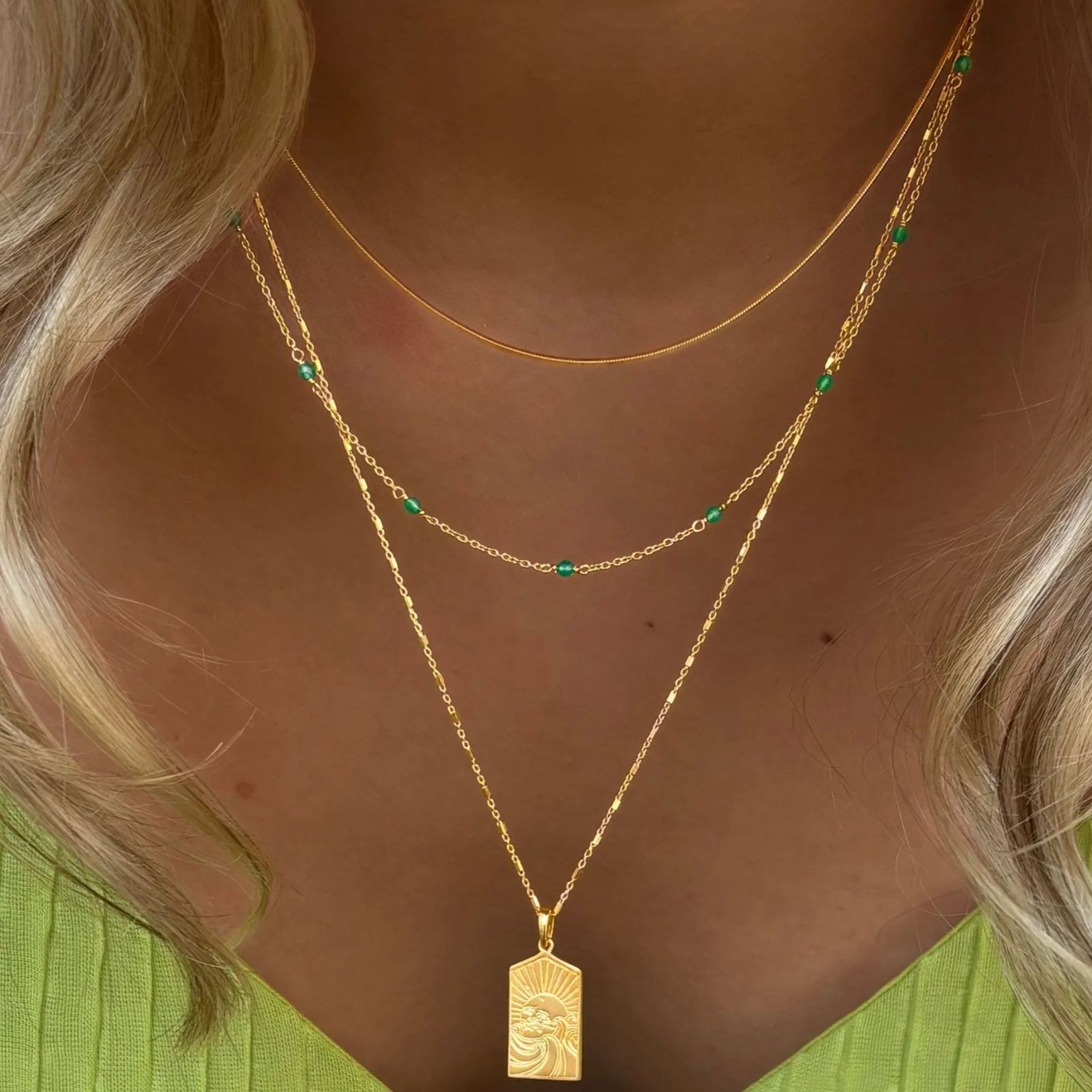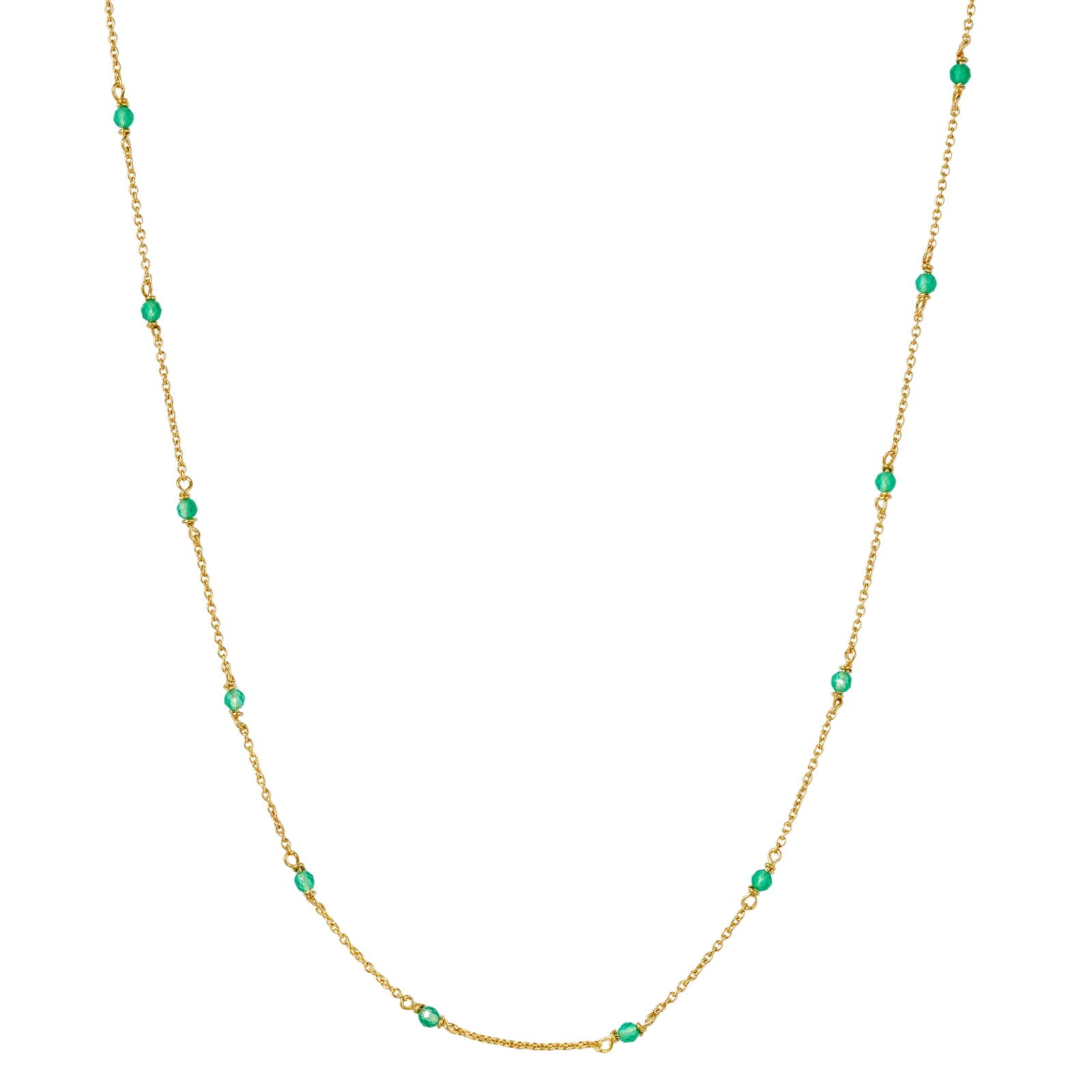 Den perfekta färgklicken för alla tillfällen. Halsbandet fångar uppmärksamheten med sina vackra gröna onyx-stenar och ger varje look det där lilla extra! Tillverkat i 100% återvunnet sterlingsilver,pläterat med 18K guld. Perfekt att kombinera med ett matchande armband för en komplett look. Garanterat en uppskattad present för den som gillar färg.