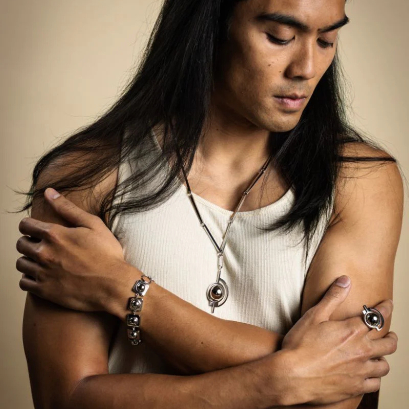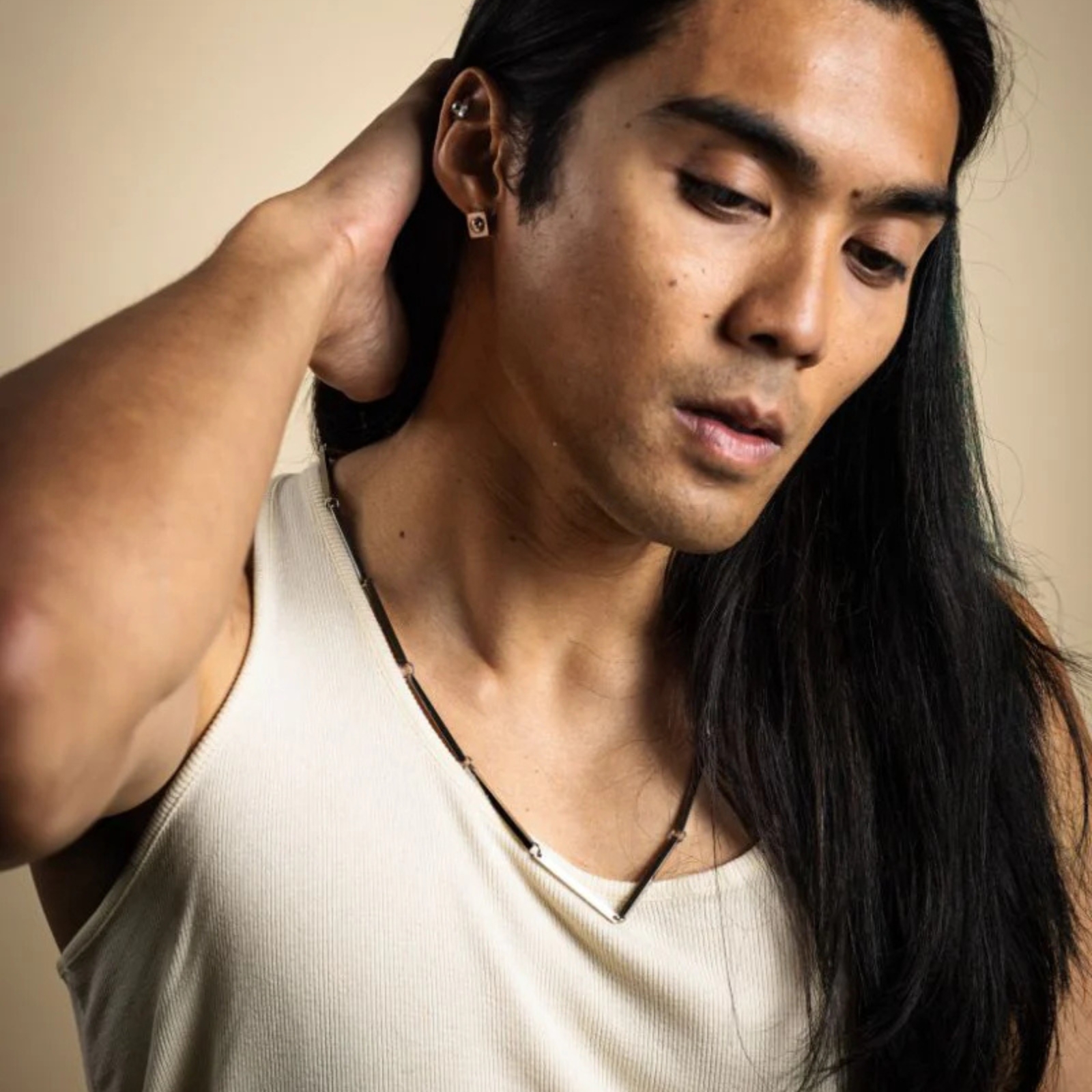 De slanka stängerna skapar ett uttrycksfullt statement, medan den avtagbara berlocken och justerbara längden ger oändlig mångsidighet. En sann unisex-design, skapad för att bäras av alla.