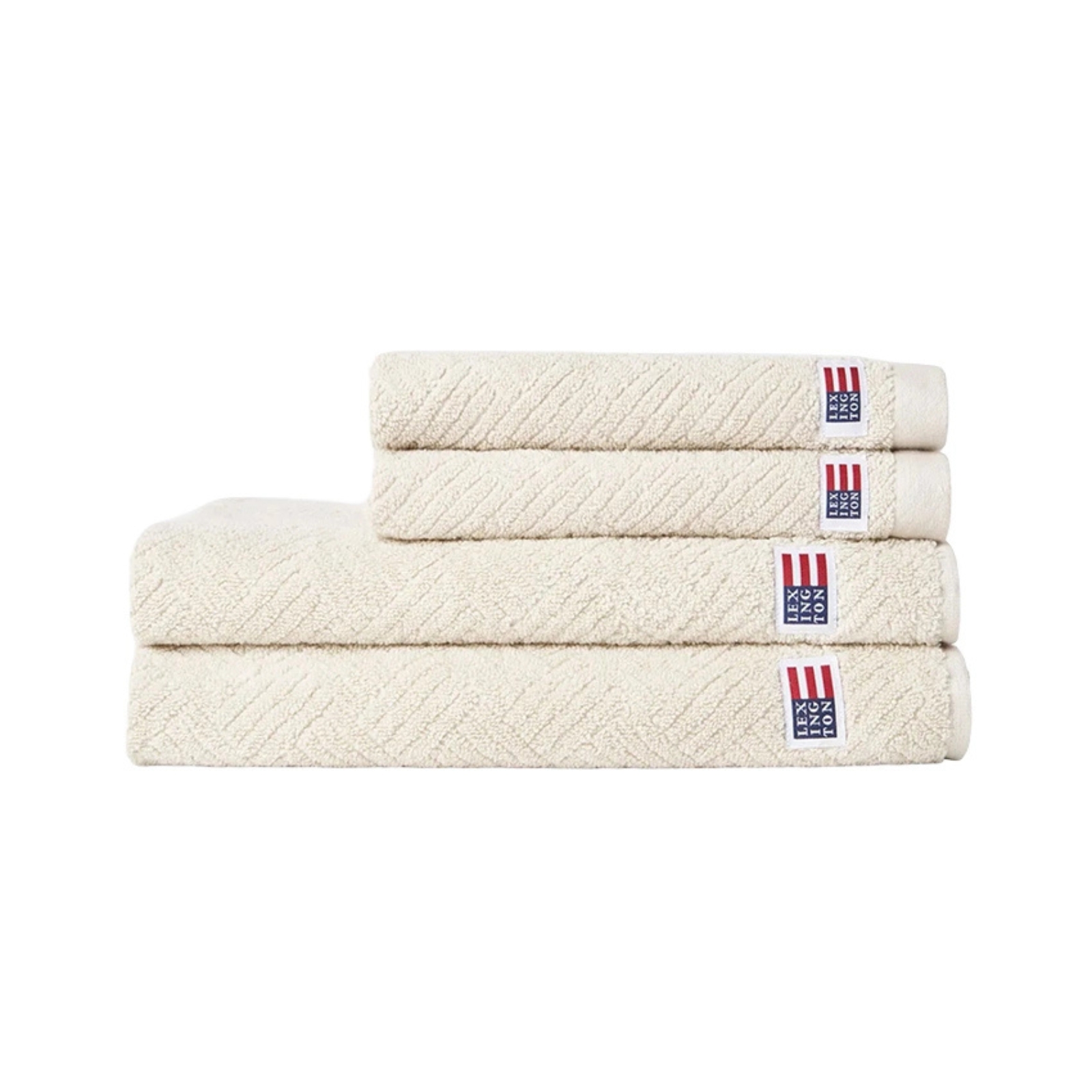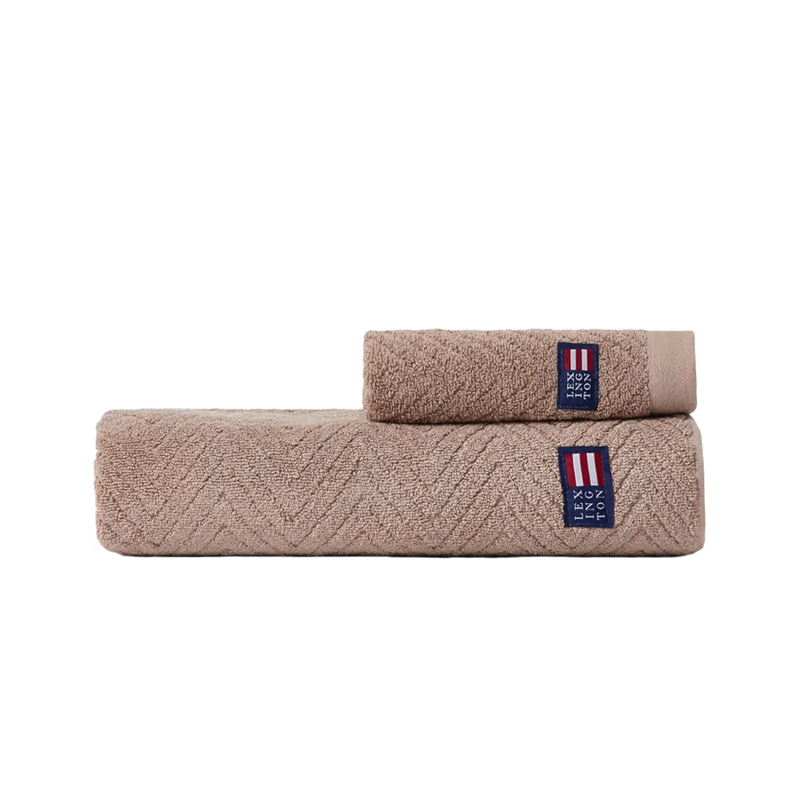 Lexington Herringbone frottéhandduk i bomull är tillverkad i Portugal av 100 procent bomull. Handduken extra mjuk och absorberande, med en strukturerad frottéväv. Fållen är avslutad med en vikt twillkant. Handduken har även en upphängningsögla med logotyp samt Lexingtons flagglogotyp längst ned. Mjuk och skön att svepa in sig i efter en lång dusch eller ett varmt bad på en kylig höst- eller vinterdag. Färgpaletten i serien är klassisk och passar alla stilar och badrum.