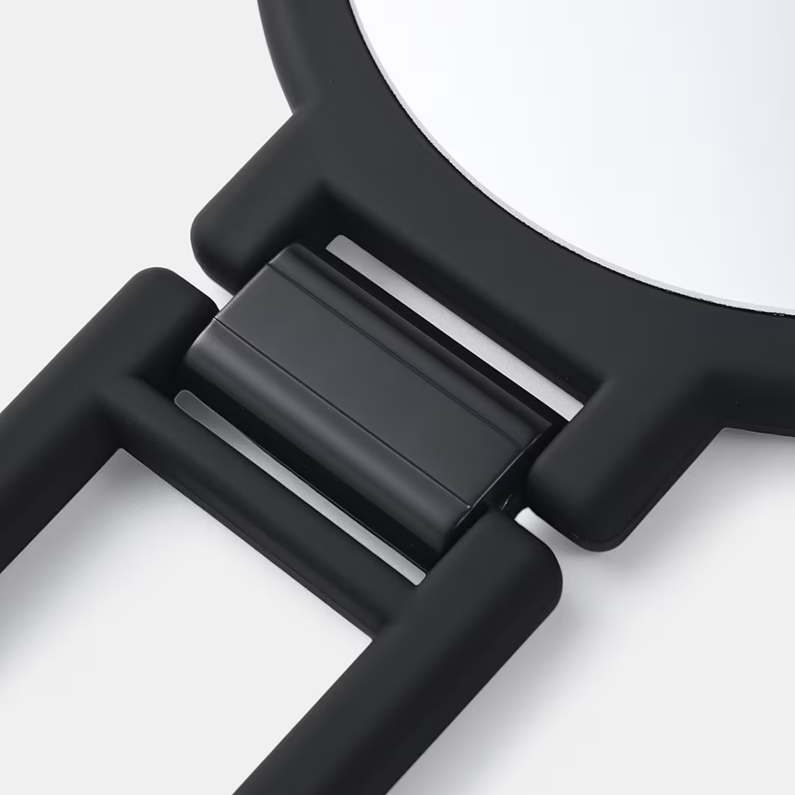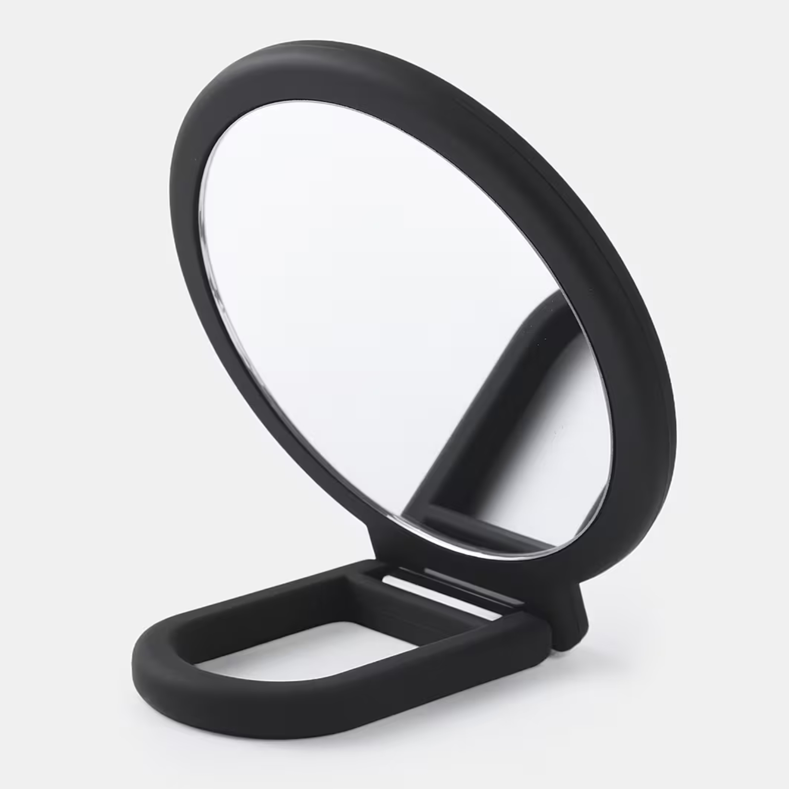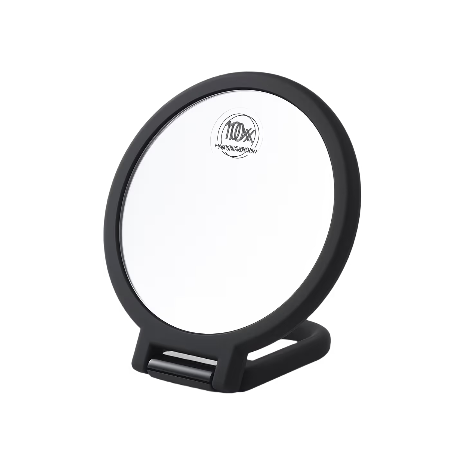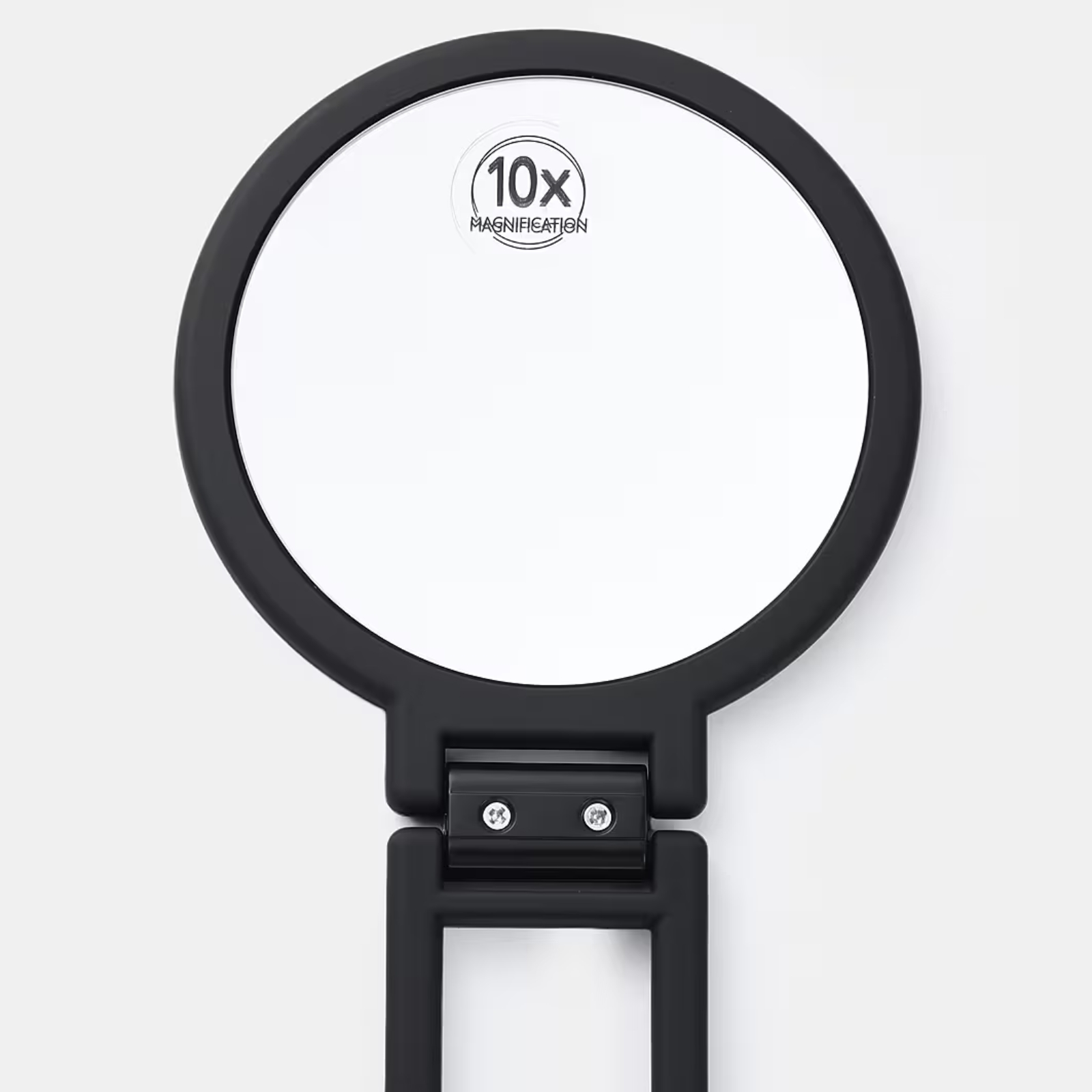 En spegel med 1x och 10x förstoring, med praktiskt utfällbart handtag som kan användas som stöd – idealisk både i handen och på bordet.