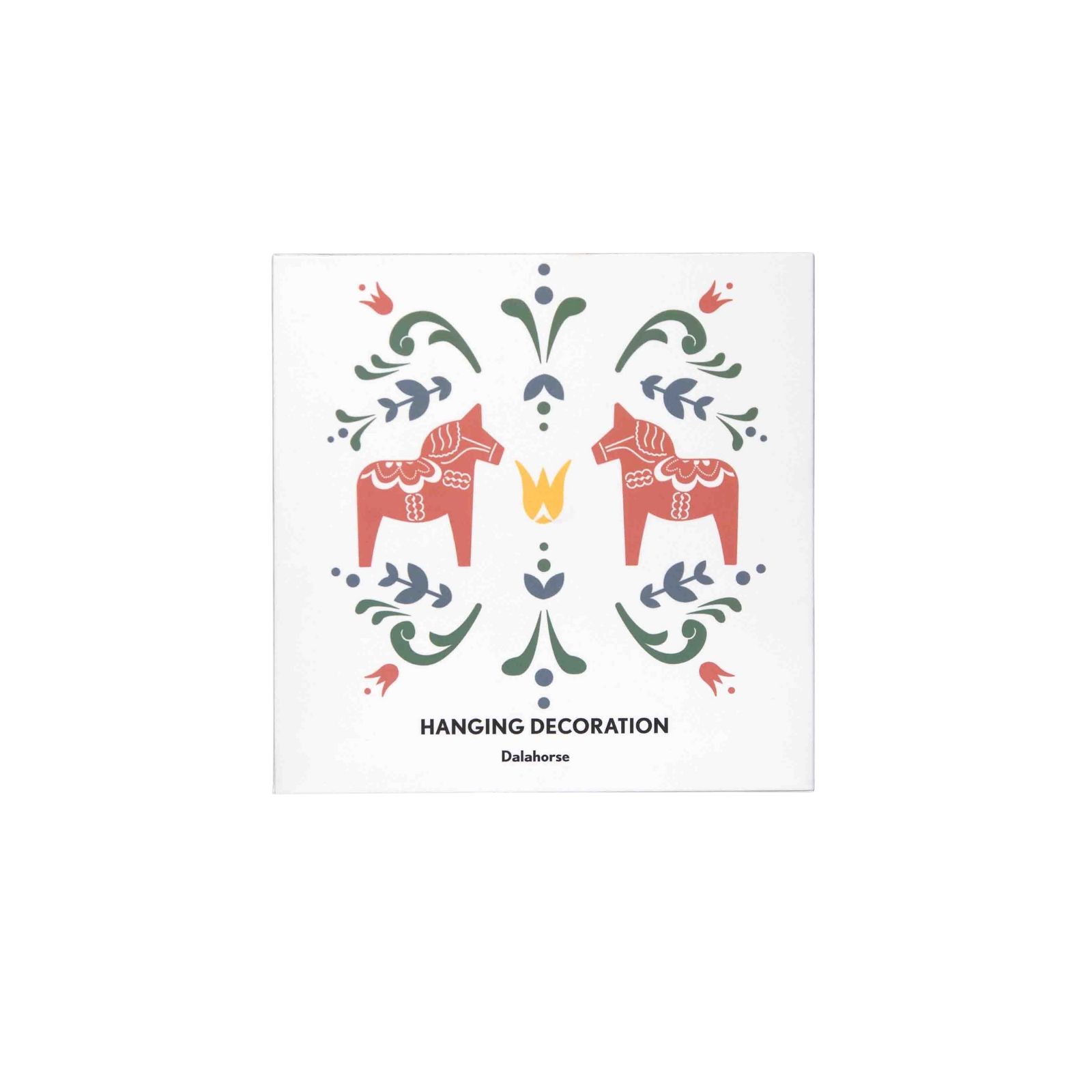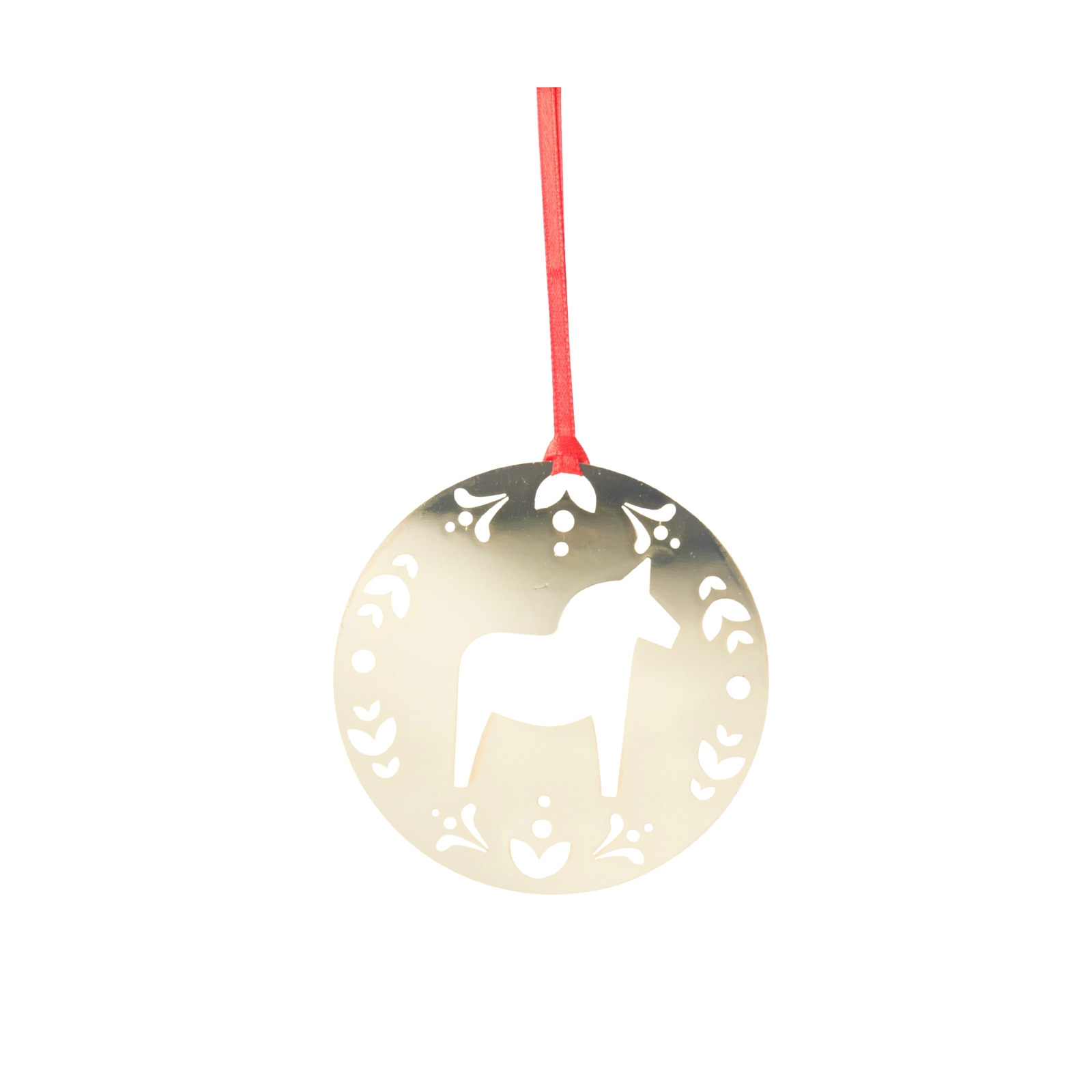 Stilrent hängsmycke i metall med utskuren dalahäst som kombinerar ett klassiskt uttryck med en modern känsla. Den runda formen och den eleganta finishen gör den till en fin dekoration i fönstret, i granen eller som en personlig detalj i hemmet.