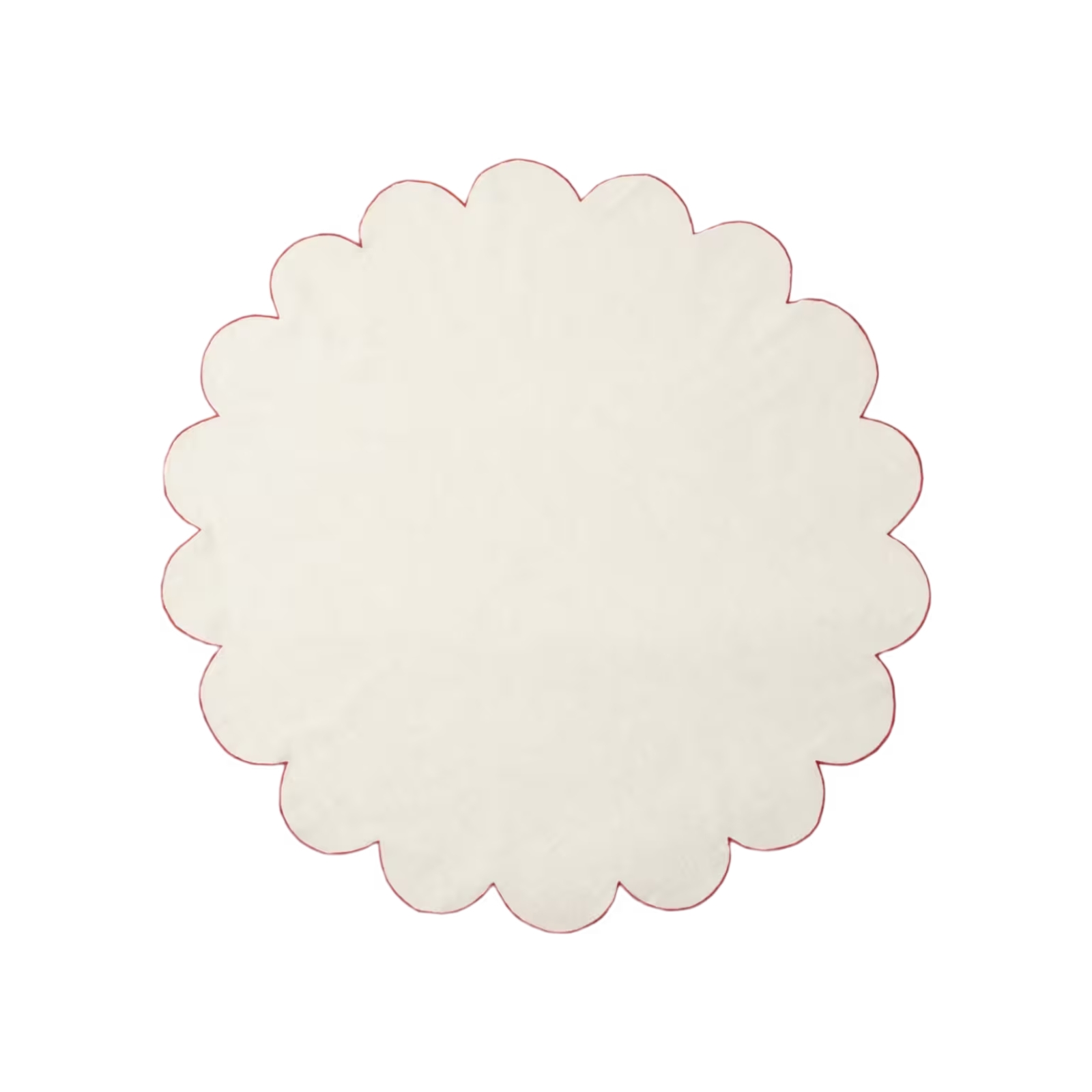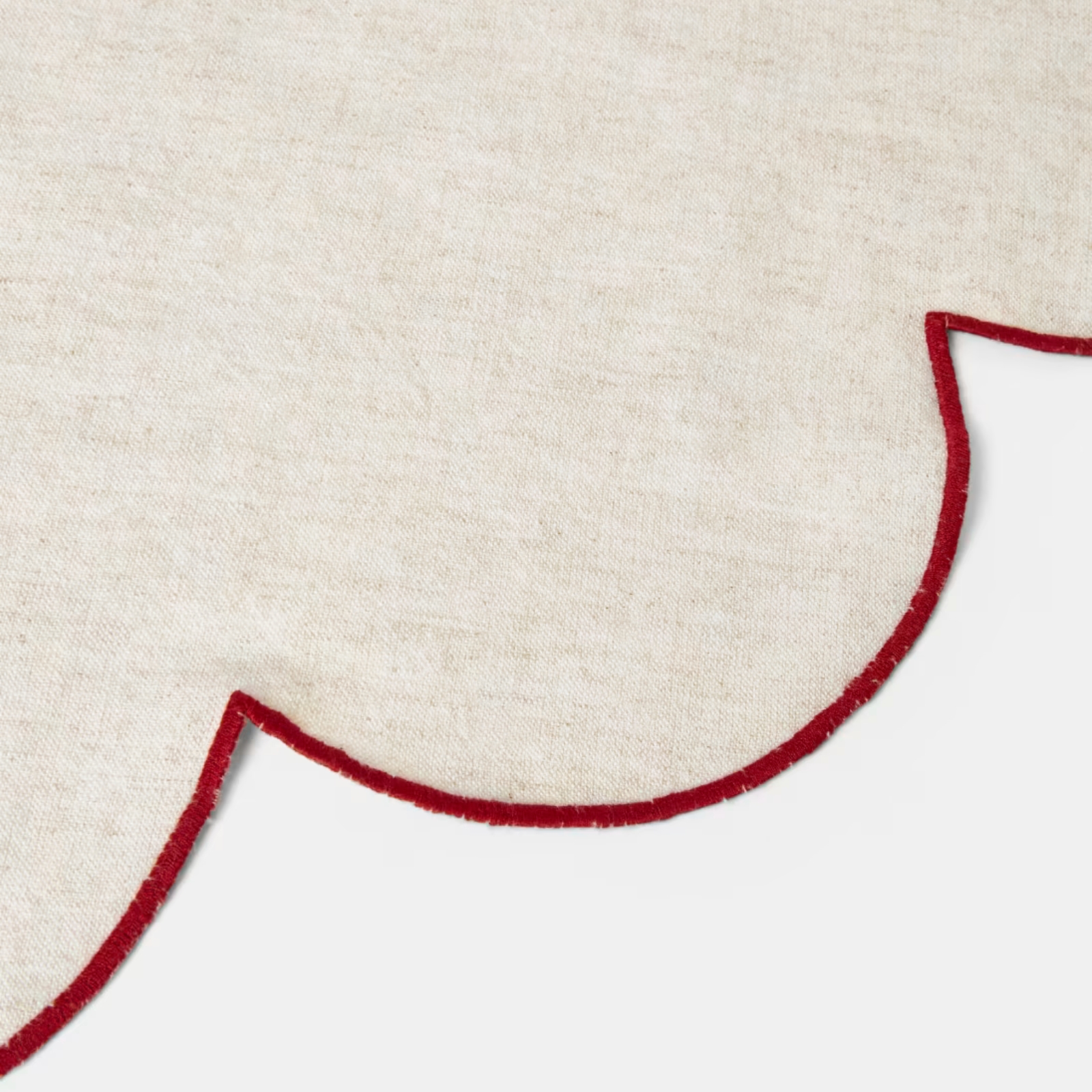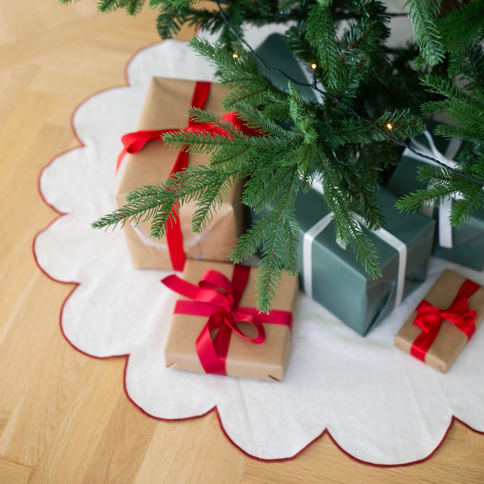 En röd söm löper runt hela den vågiga kanten.• Julgransmatta i linnemix