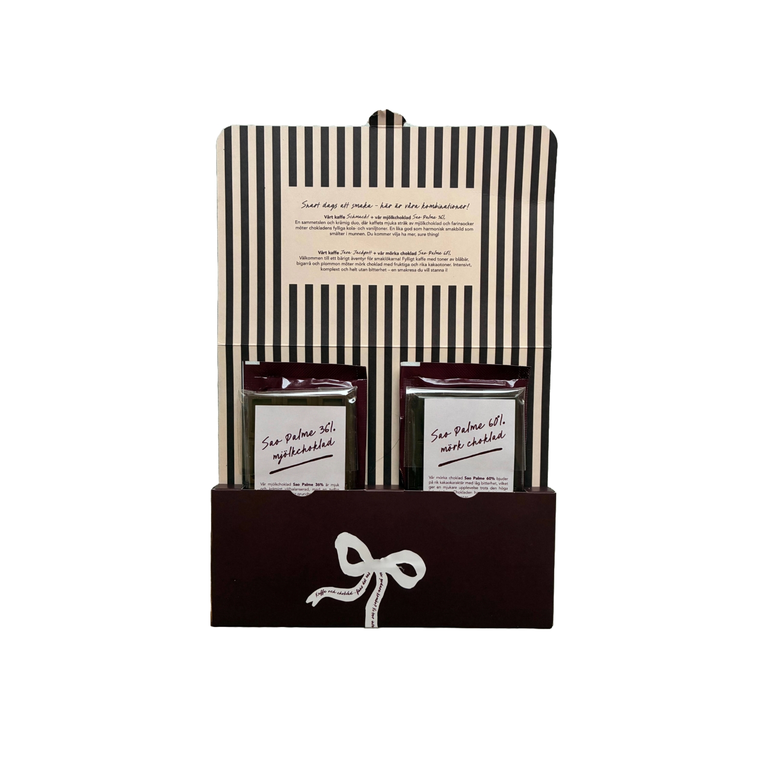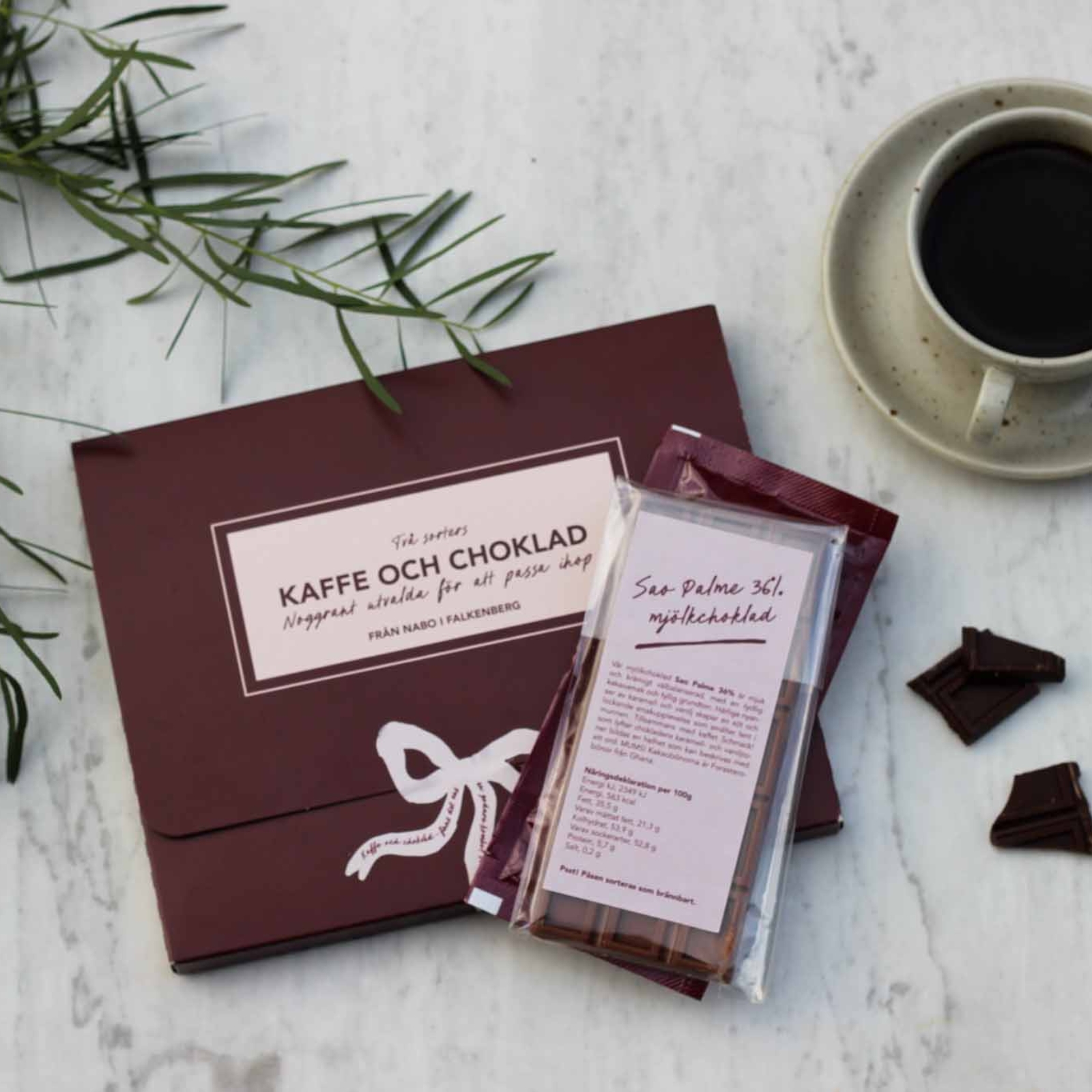 Kaffe och choklad – finns det en godare kombination? Vi tror inte det. Därför har NABO valt ut två av sina kaffefavoriter och noggrant matchat dem med varsin chokladkaka av grym kvalitet, tillverkade hos dem i Falkenberg. Häng med på en smakupplevelse där kaffet och chokladen är som gjorda för varandra och lyfter din fikastund till nästa nivå! En kaffe- och chokladprovning som är perfekt för två personer att dela på. Gör en egen liten provning med någon som älskar kaffe och choklad lika mycket som du, eller ge bort som present till någon som är värd lite guldkant. Kaffet är rostat i Göteborg och packat i Falkenberg. Chokladen är tillverkad i Falkenberg.