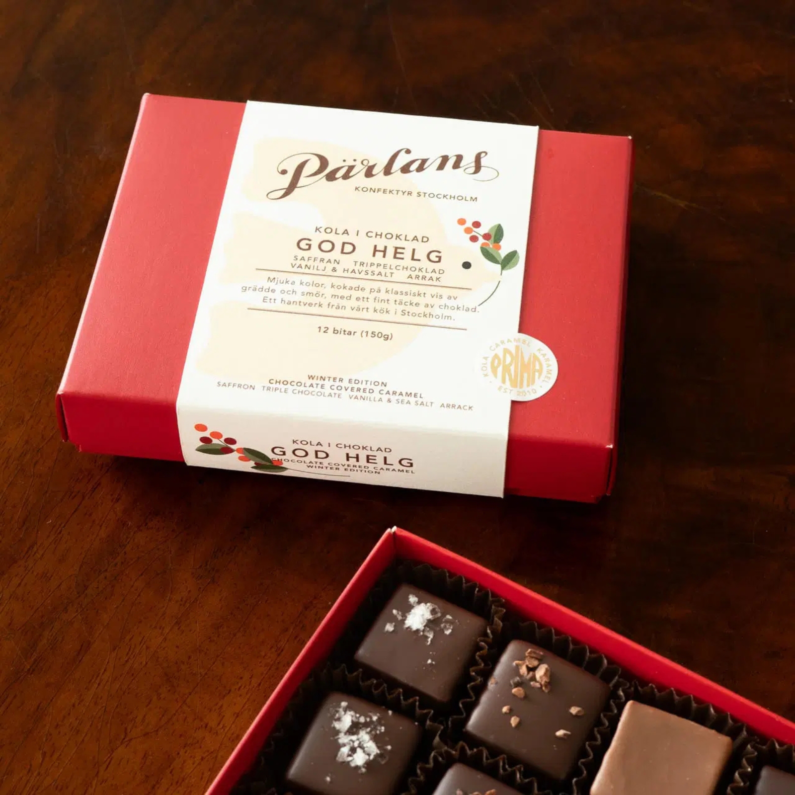 Kolor från Pärlans, kan det blir godare? Har du inte provat dessa chokladdoppade kolorna så är det dags. Asken God helg innehåller smakerna Saffran blond, Trippelchoklad, Vanilj & havssalt och Arrak.