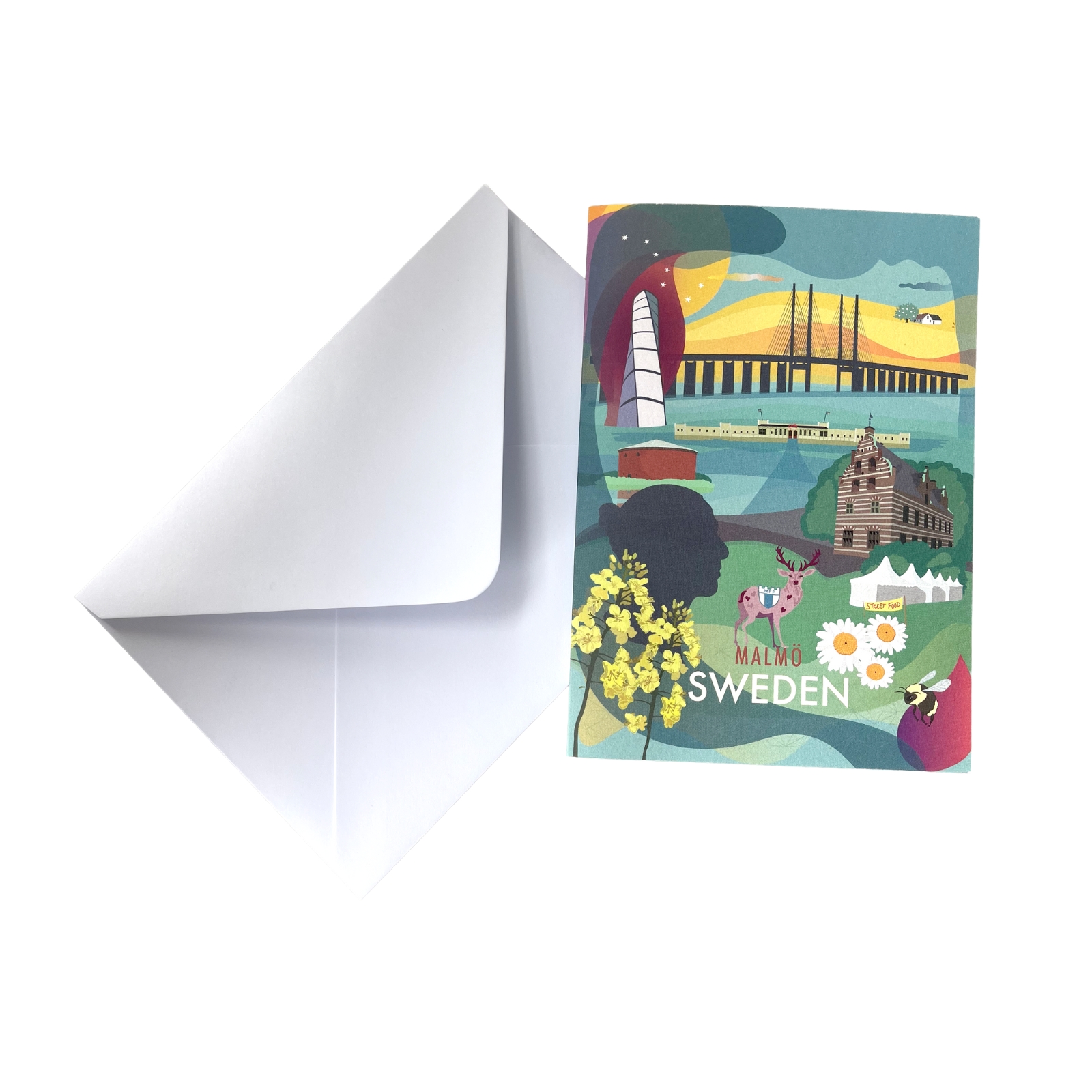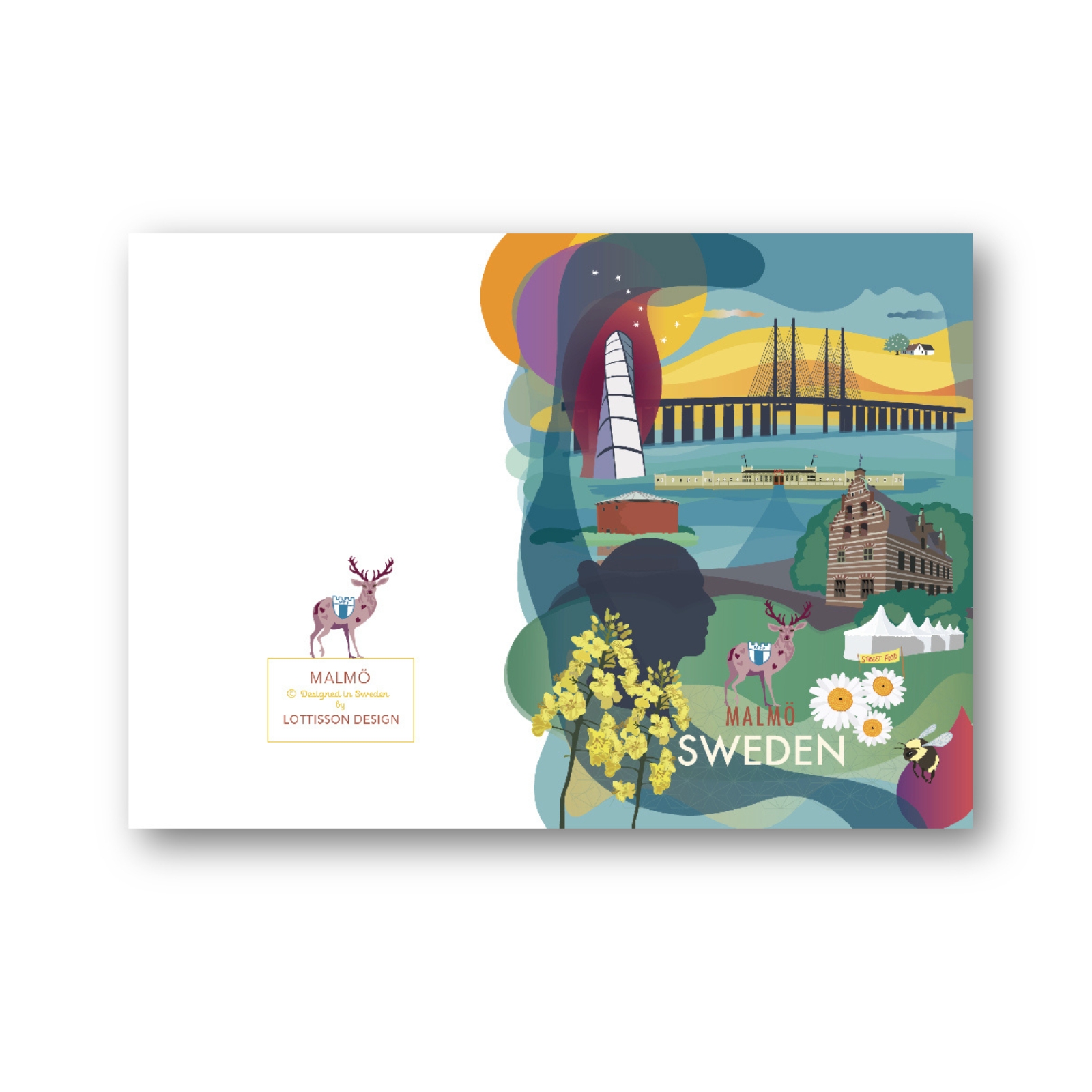 Kort med kuvert med Malmömotiv av Lottis Karlsson. Ett färgstarkt kort som fångar känslan av en plats. Illustratören Lottis Karlsson skapar sina motiv genom att lyfta fram symboler och detaljer som definierar en stad eller stadsdel. Resultatet blir en lekfull och personlig illustration som sprakar av färg och karaktär.