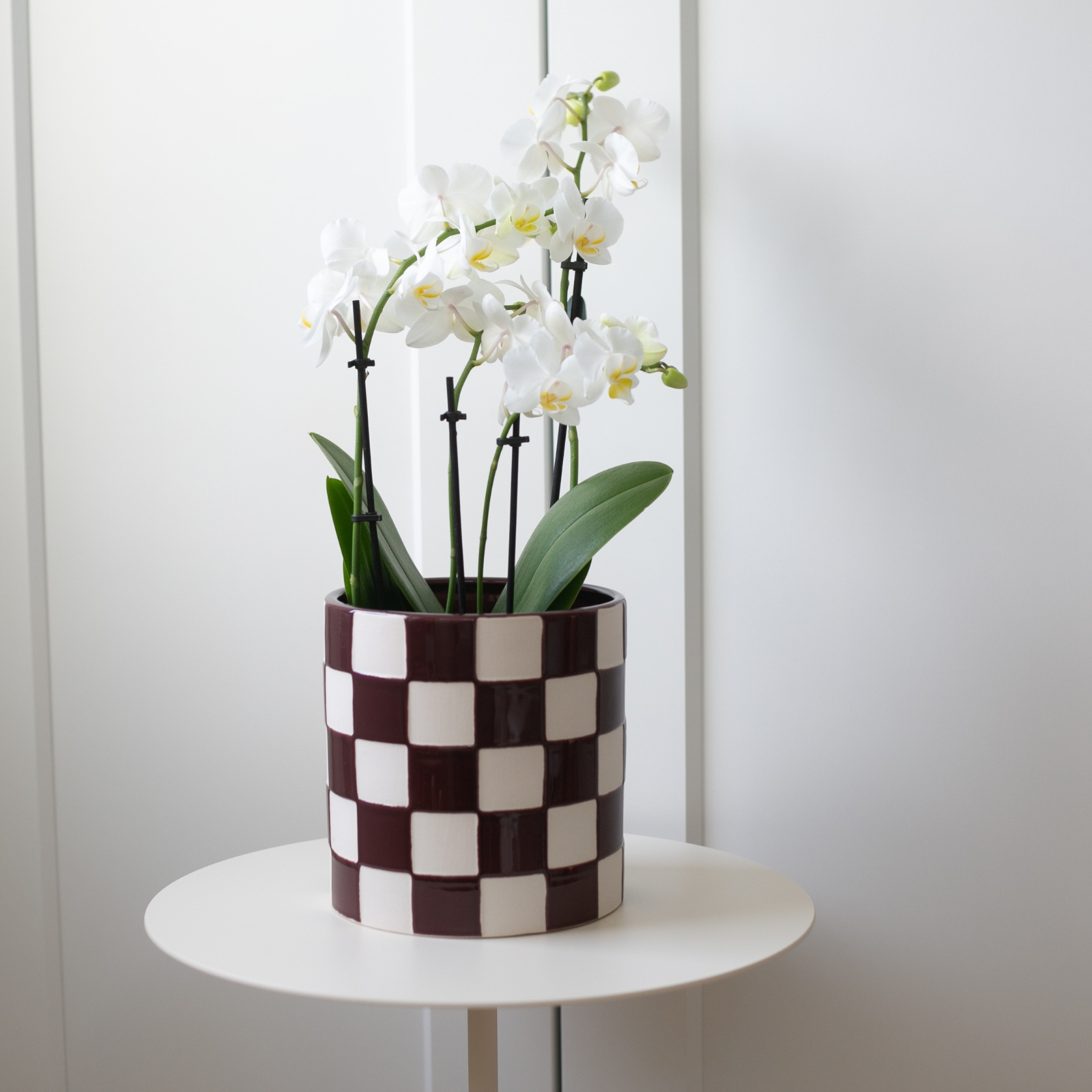 Kruka med rutmönster som påminner om ett schackbräde. För dig som vill få gröna fingrar eller ge bort en unik kruka till någon i present är denna kruka den ultimata gåvan att ge bort. Kommer i olika färger.