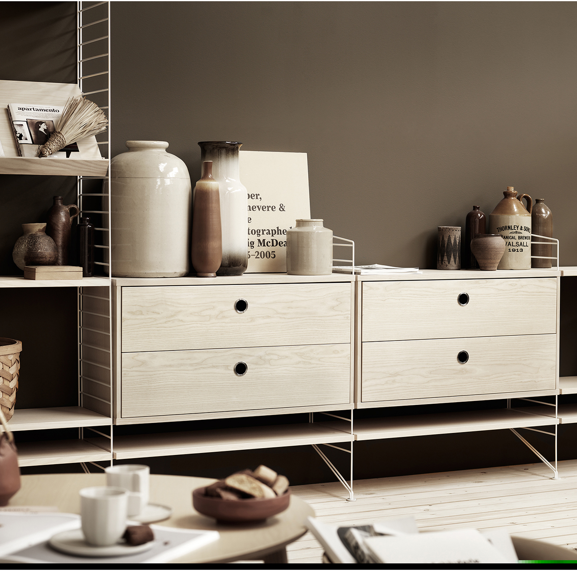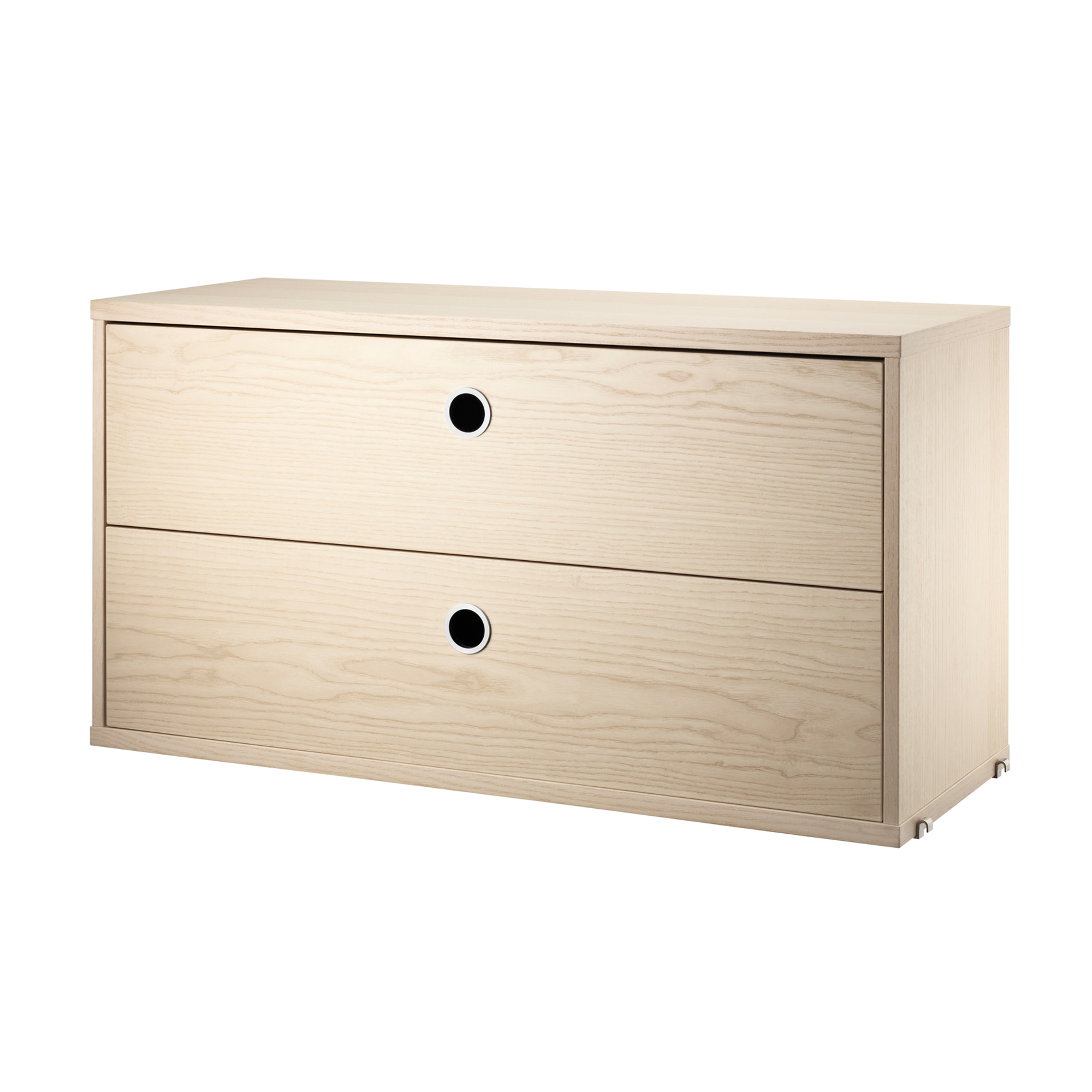 String lådhurts i träfanér med två lådor, med handtag i rostfritt stål. Insidans djup 23 cm. Upphängning ingår.
