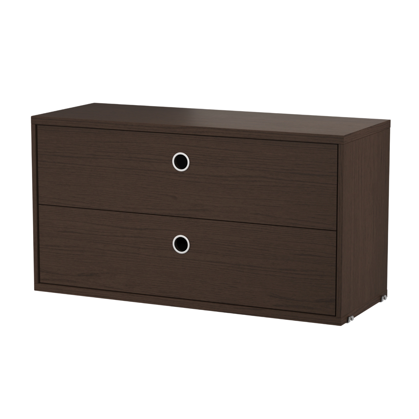 String lådhurts i träfanér med två lådor, med handtag i rostfritt stål. Insidans djup 23 cm. Upphängning ingår.