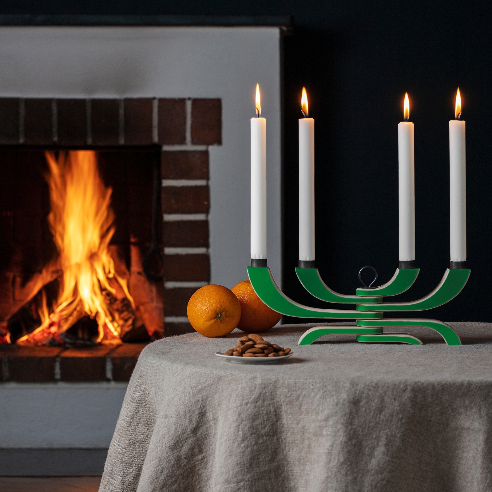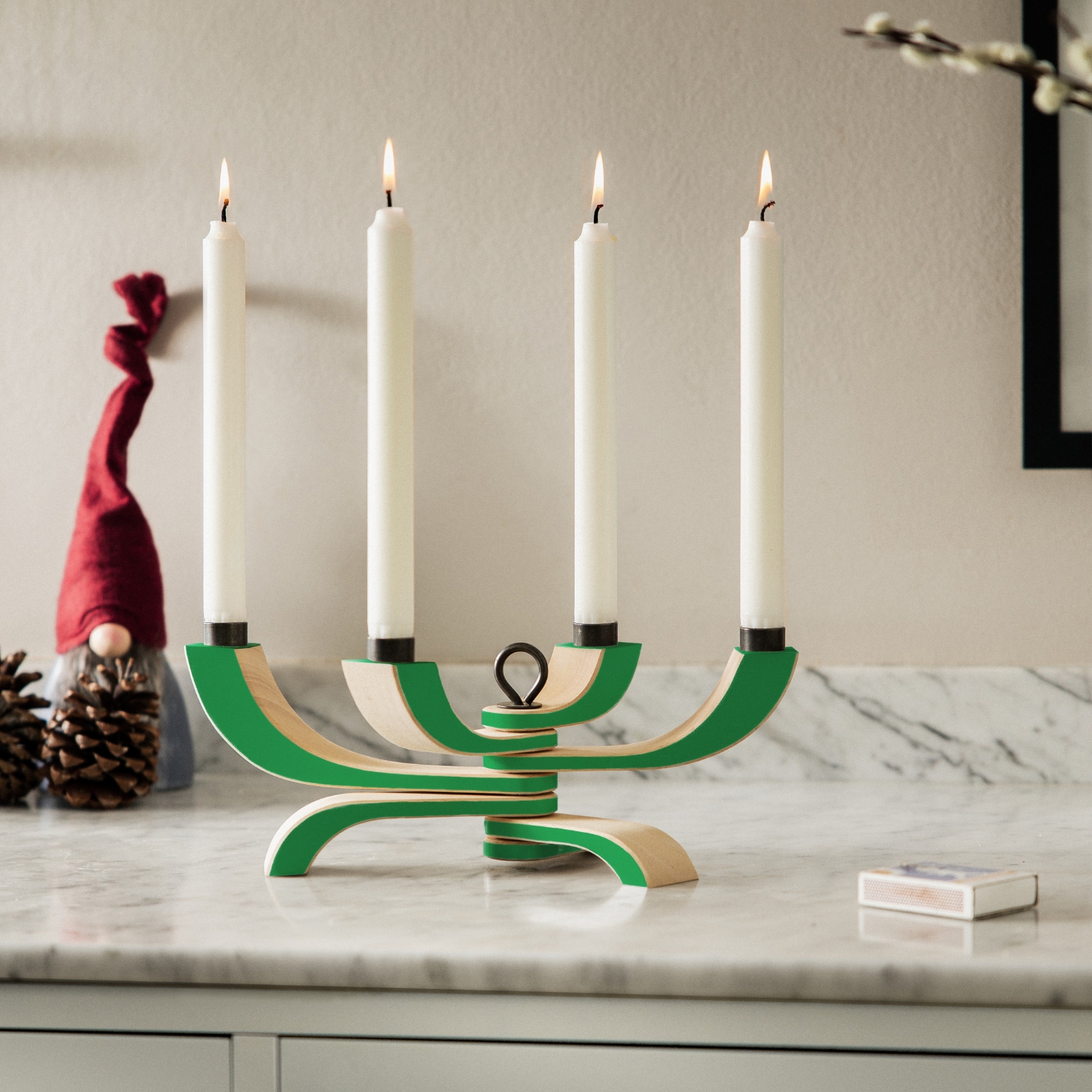 Formgivaren Jonas Grundell har kombinerat släta träytor och matt lack med en svart järnring som elegant binder ihop delarna. När ljusen har brunnit ner kan du enkelt vika ihop ljusstaken igen, smart, snyggt och platsbesparande.