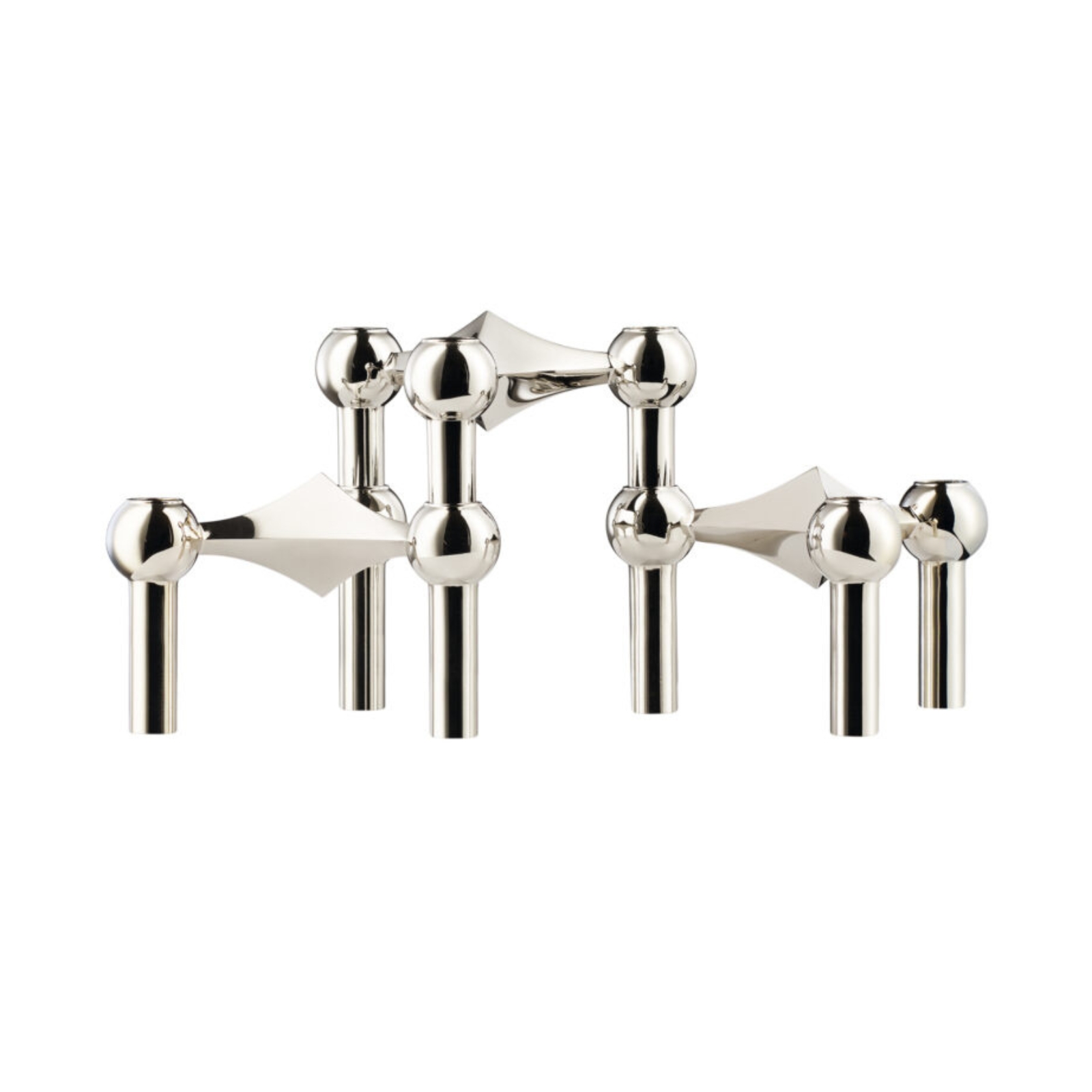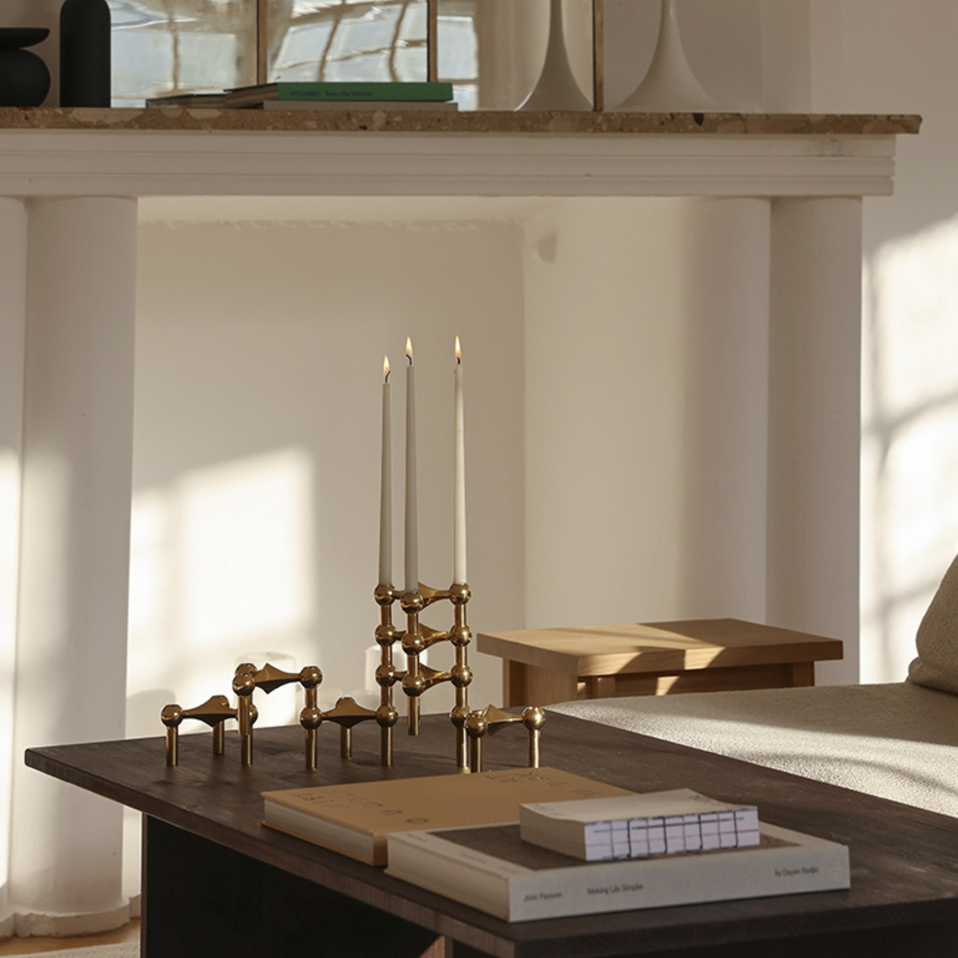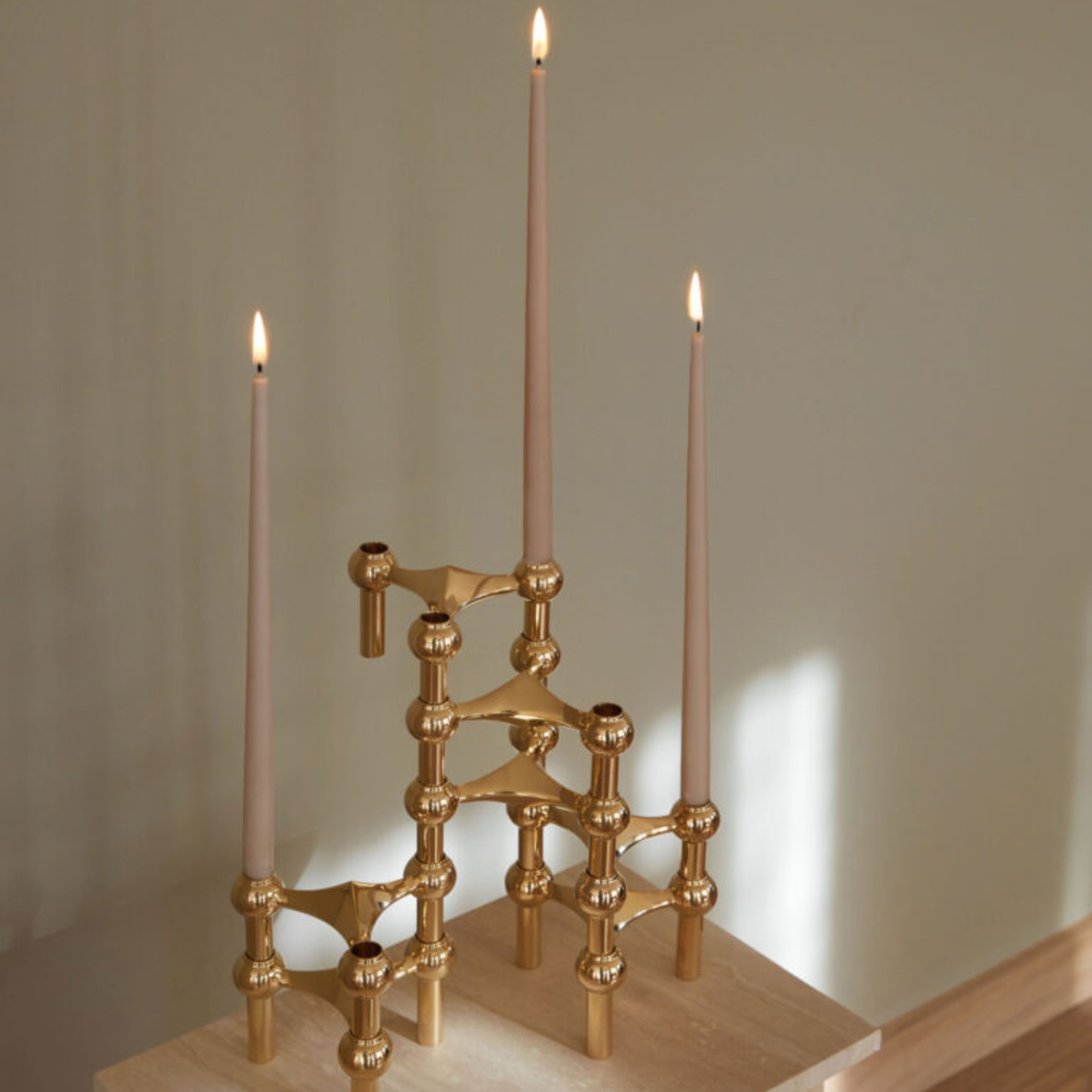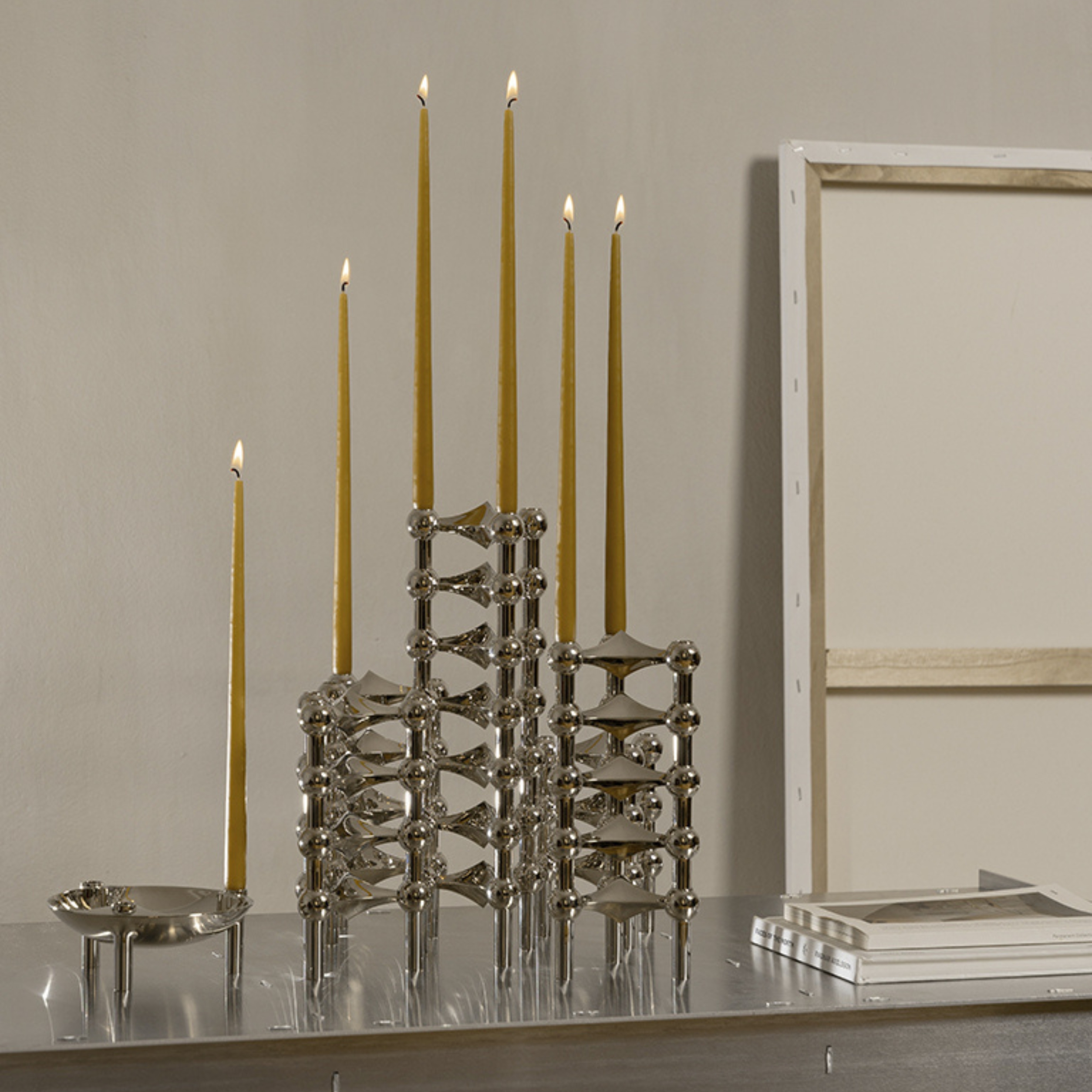 Ljusstaken i krom är den allra första och ursprungliga färgen i STOFF Nagel-designen, medans ljusstaken i massiv mässing är den mest exklusiva medlemmen i STOFF Nagel-familjen. Än idag räknas den som ett samlarobjekt i hem världen över – ett personligt uttryck och en formbar skulptur som tar gestalt efter sin ägares unika kreativitet. Skapa och kombinera den med andra STOFF Nagel-designs och använd den med kronljus, eller låt den stå som en dekorativ skulptur i sig själv.