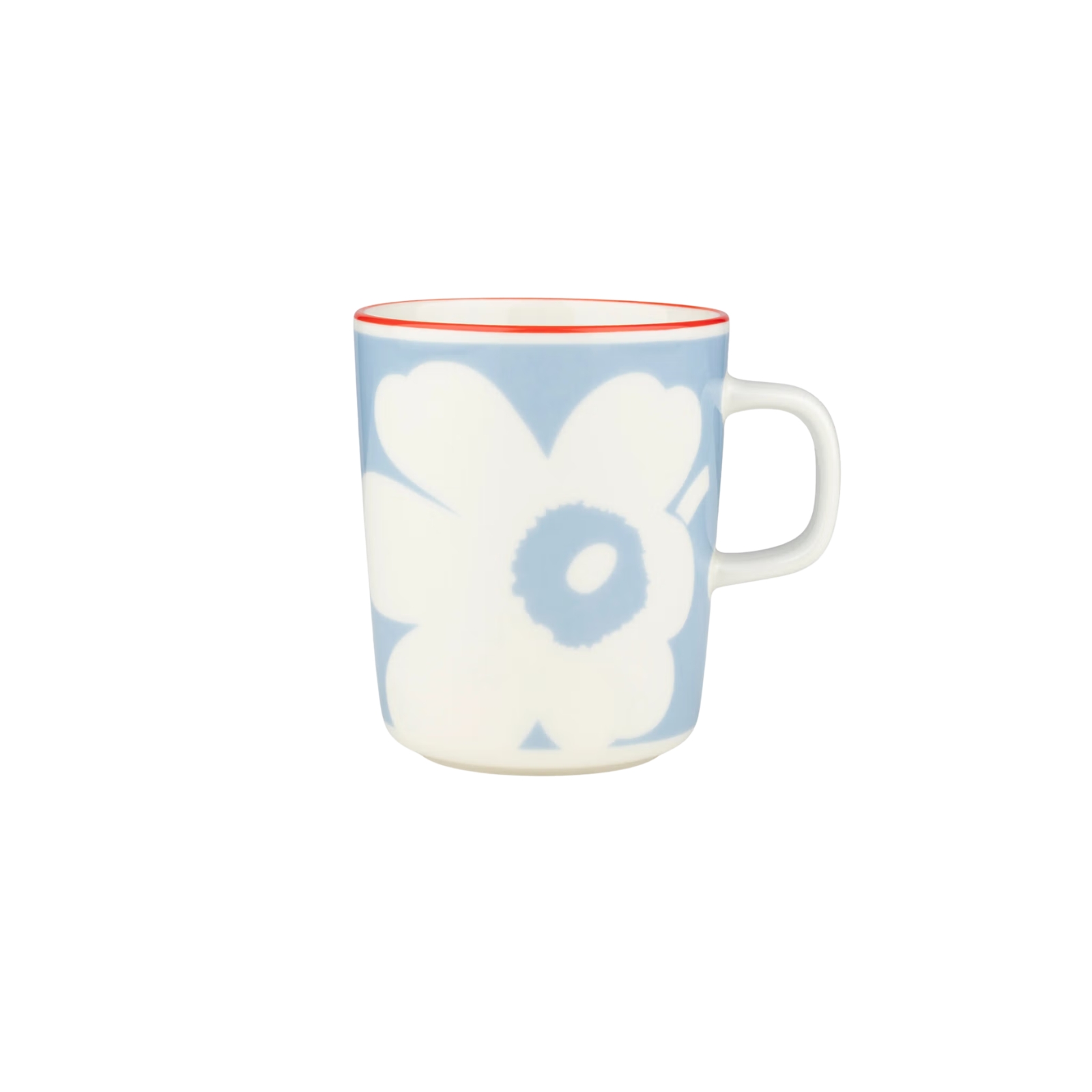 Denna mugg ur Oiva-serien kombinerar funktionell design med det uttrycksfulla Juhla Unikko-mönstret. Den handmålade, orange kanten ger varje mugg ett levande och personligt uttryck – det där lilla extra som gör fikastunden ännu bättre.