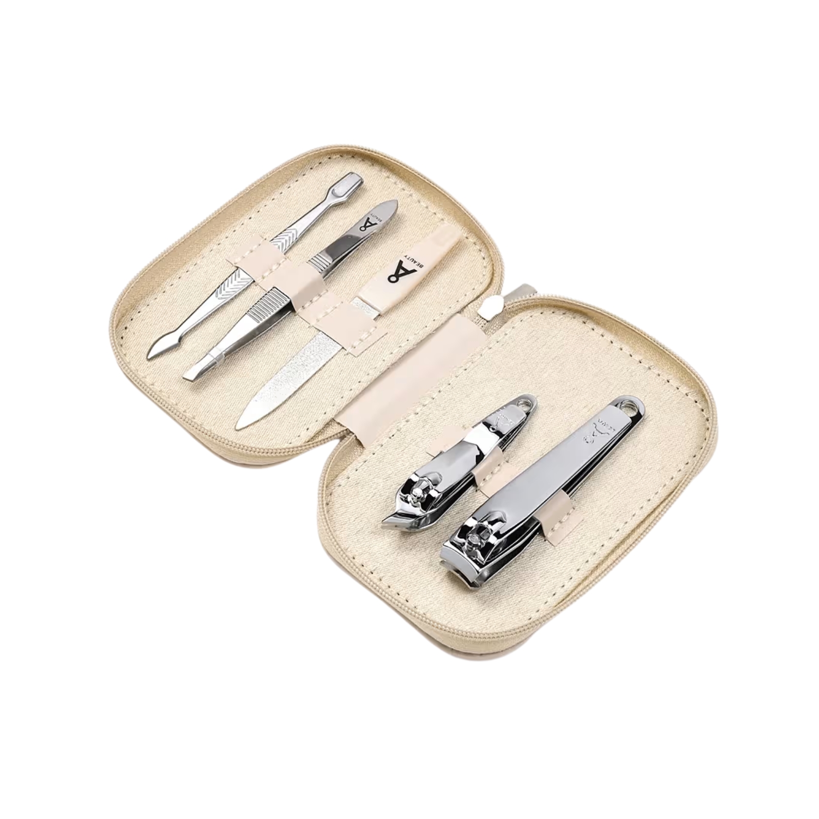 För bekväm nagelvård när du är på språng. Kitet innehåller en pincett, nagelklippare, nagelfil, nagelbandspusher och nagelbandsklippare. Förvaras utom räckhåll för barn.