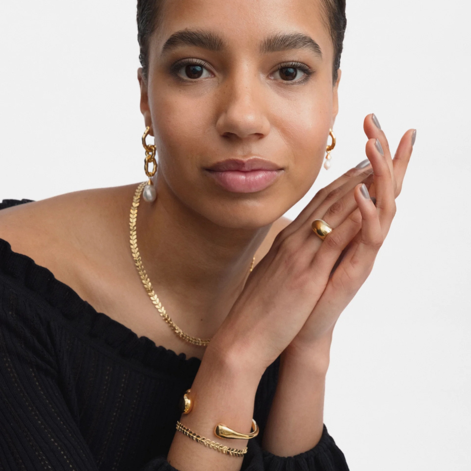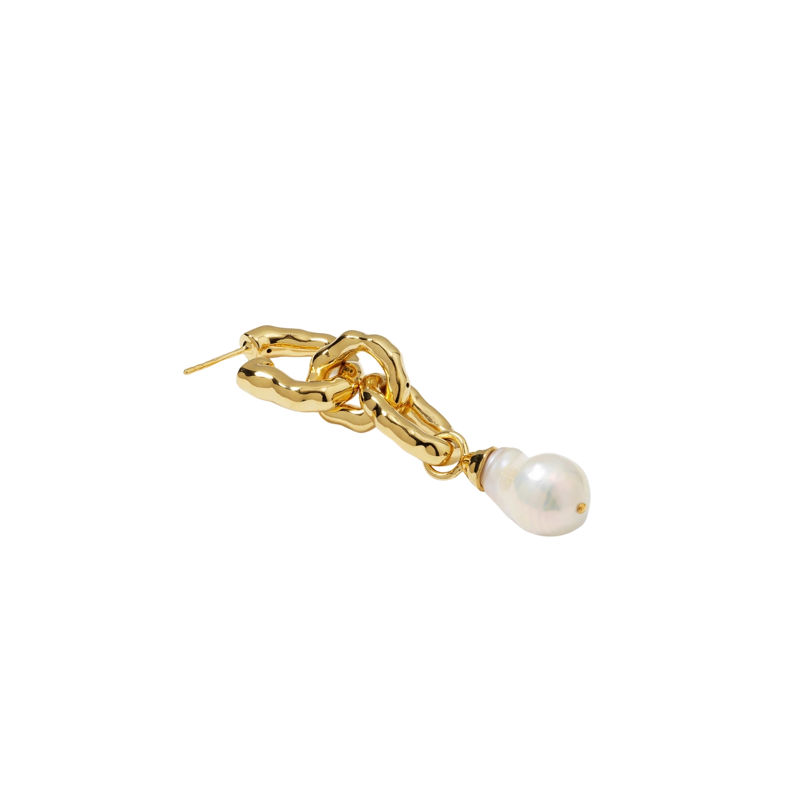 Långt örhänge av kraftiga länkar med hamrad finish och ett hänge med en barockpärla. Pärlan varierar i form, vilket verkligen gör varje smycke helt unikt. Tillverkat i 100% återvunnet sterlingsilver, pläterat med 18K guld. Från Syster P.