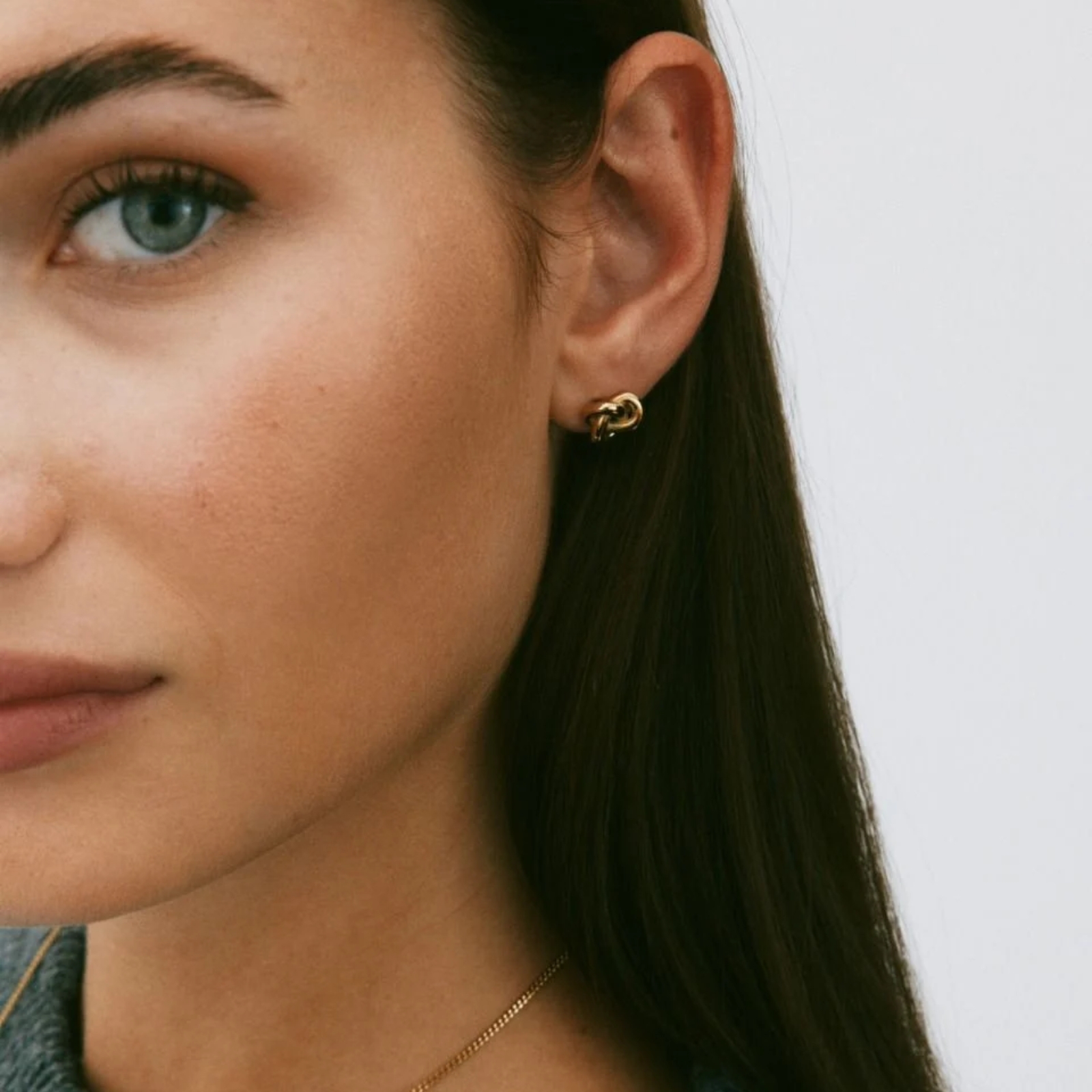 Den skulpturala evighetsknuten i serien Infinity Knot är en tidlös klassiker. De obrutna linjerna i knuten symboliserar kontinuitet. En kraftfull symbol som passar alla tillfällen. Här med knutformen i små, fina studs i 14K guldplätering. Fina att kombinera med seriens nättare halsband, armband eller ring.