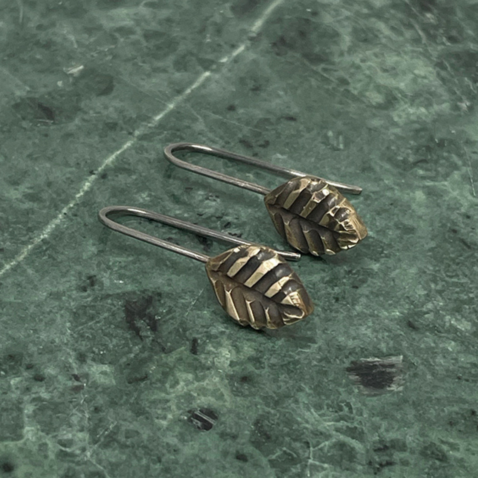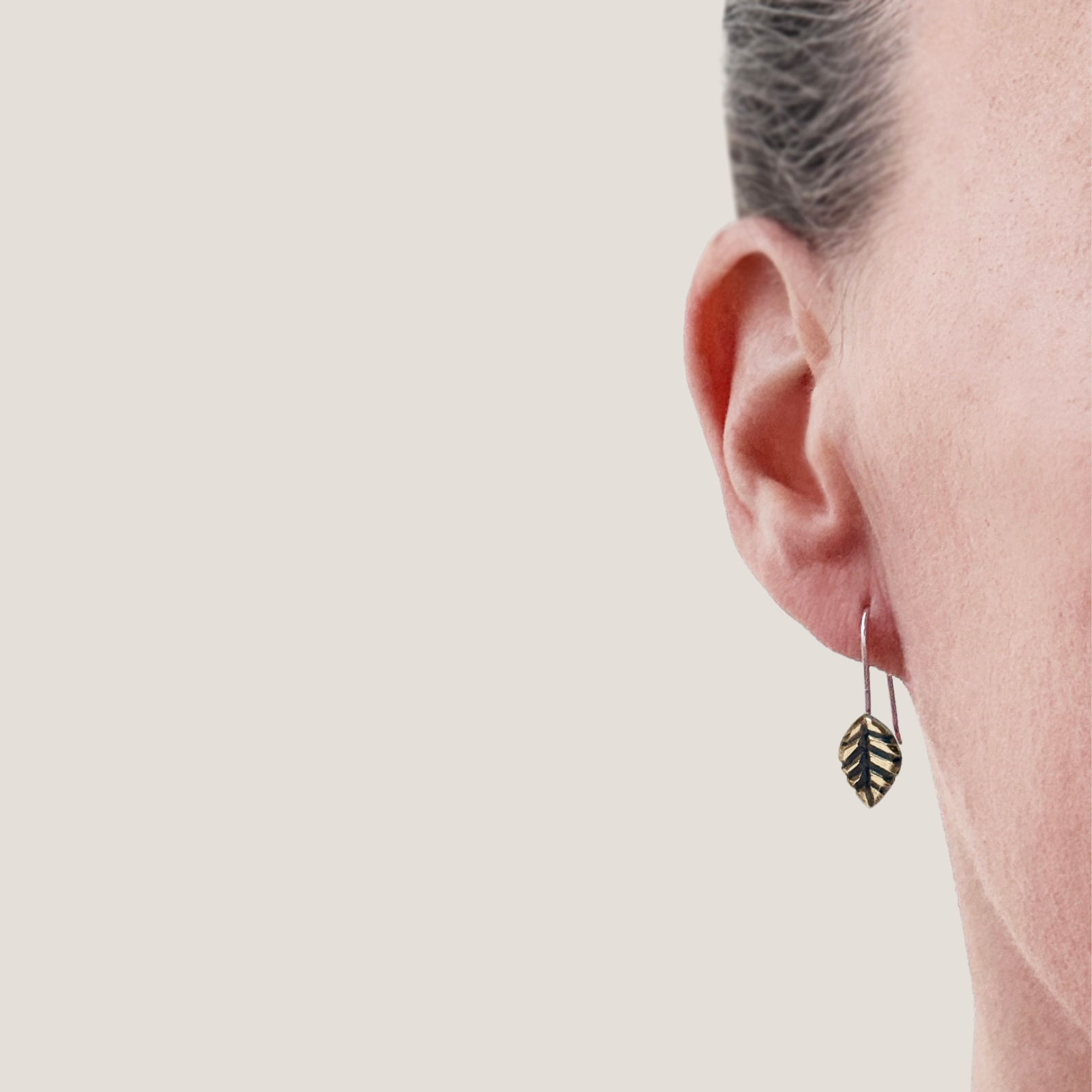 Varje löv är unikt och bär på sin egen karaktär. De är medvetet oregelbundna, långt ifrån perfekta – precis som vi. Det högpolerade bronset möter lätt oxiderade ådringar, vilket skapar en fin kontrast mellan ljus och mörker. Resultatet är ett levande, nästan grafiskt uttryck som framhäver formen och ger örhängena ett subtilt djup.