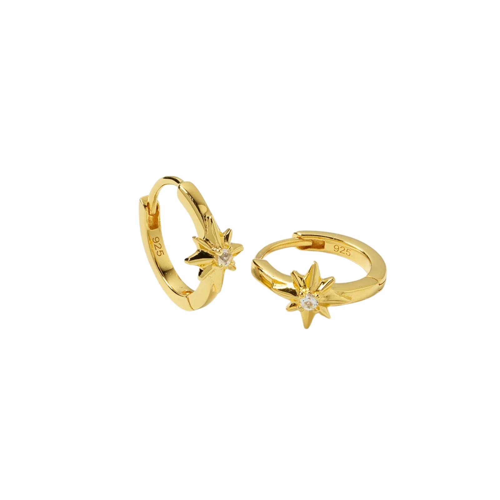 Ett par stilrena örhängen handgjorda i 925 sterlingsilver, 100% återvunnet och pläterade med 18K guld. Varje hoop har en liten stjärna med en infattad fasetterad kristall. Inspirationen kommer från nordstjärnan, där kristallen symboliserar ljus. Tidlösa och lättburna – perfekta både till vardag och kväll.