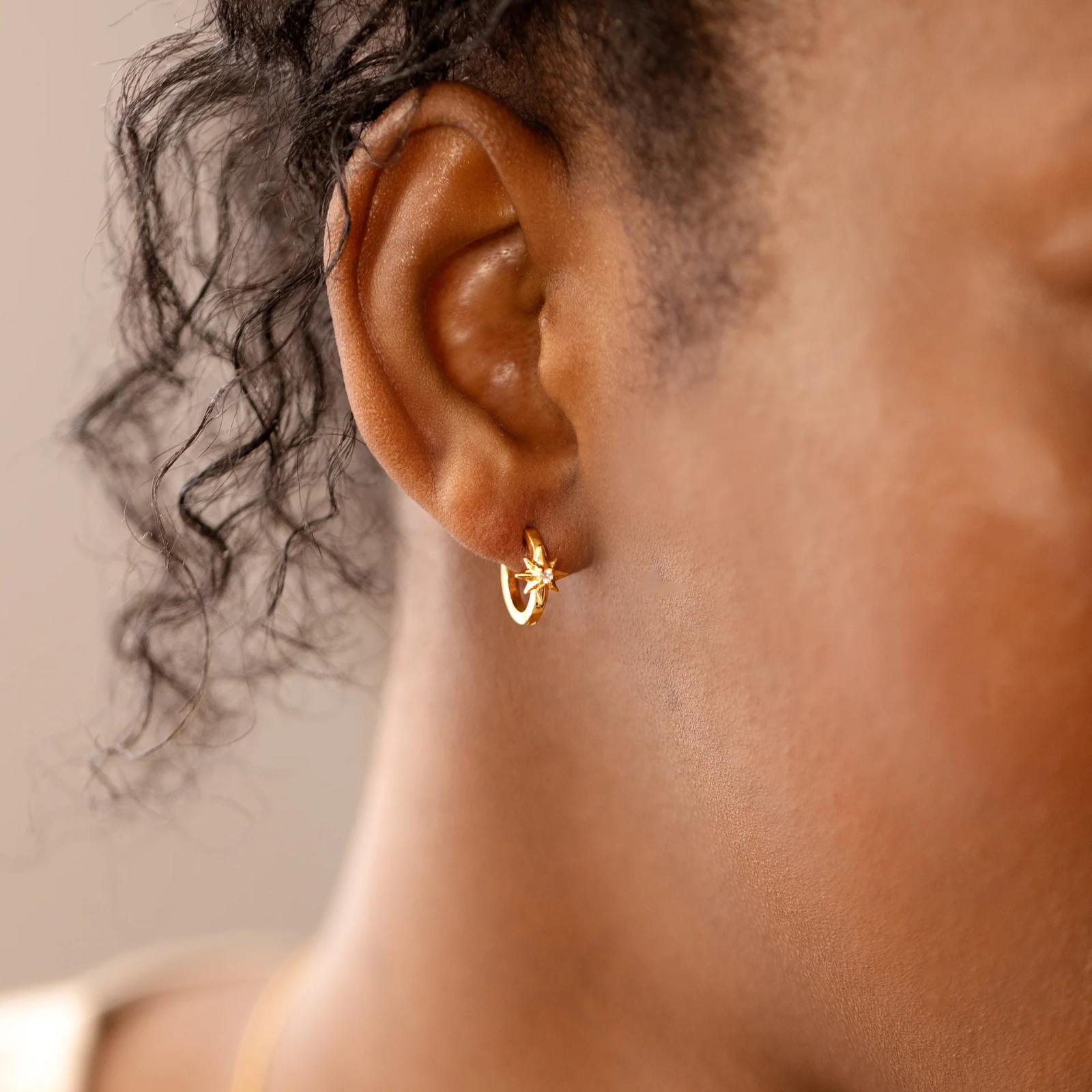 Ett par stilrena örhängen handgjorda i 925 sterlingsilver, 100% återvunnet/pläterade med 18K guld. Varje hoop har en liten stjärna med en infattad fasetterad kristall. Inspirationen kommer från nordstjärnan, där kristallen symboliserar ljus. Tidlösa och lättburna – perfekta både till vardag och kväll.