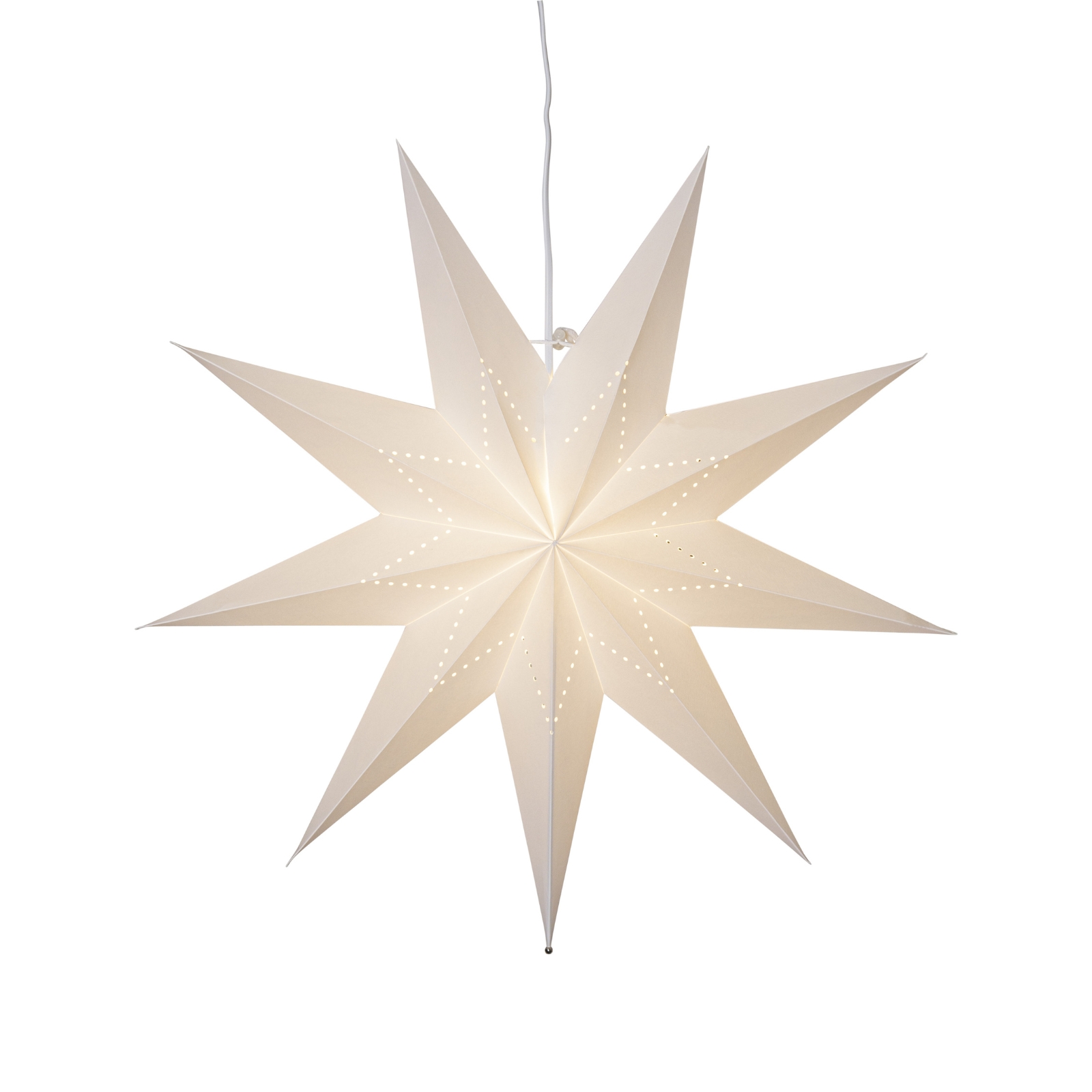 Skapa en ljus och stämningsfull känsla i hemmet med en vit pappersstjärna med hålmönster. Perfekt som jul- och adventsdekoration i fönstret, på väggen eller tillsammans i grupp för en extra effektfull inredning. Stjärnan har plats för en E14-ljuskälla och levereras med ett praktiskt upphäng. Tänd den för att få ett varmt, mjukt sken som sprider både julstämning och mysig atmosfär i rummet.
