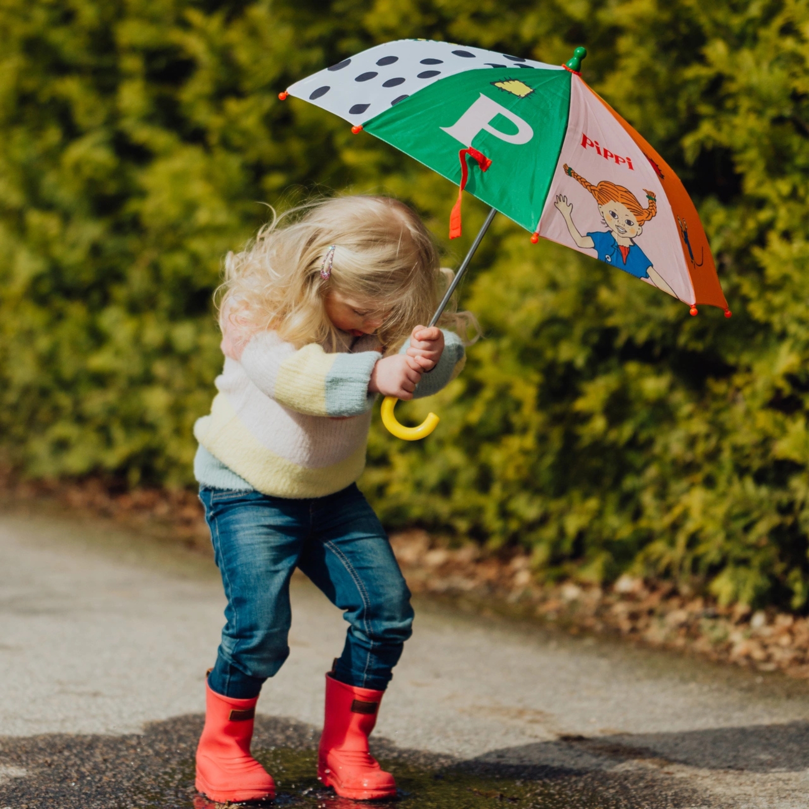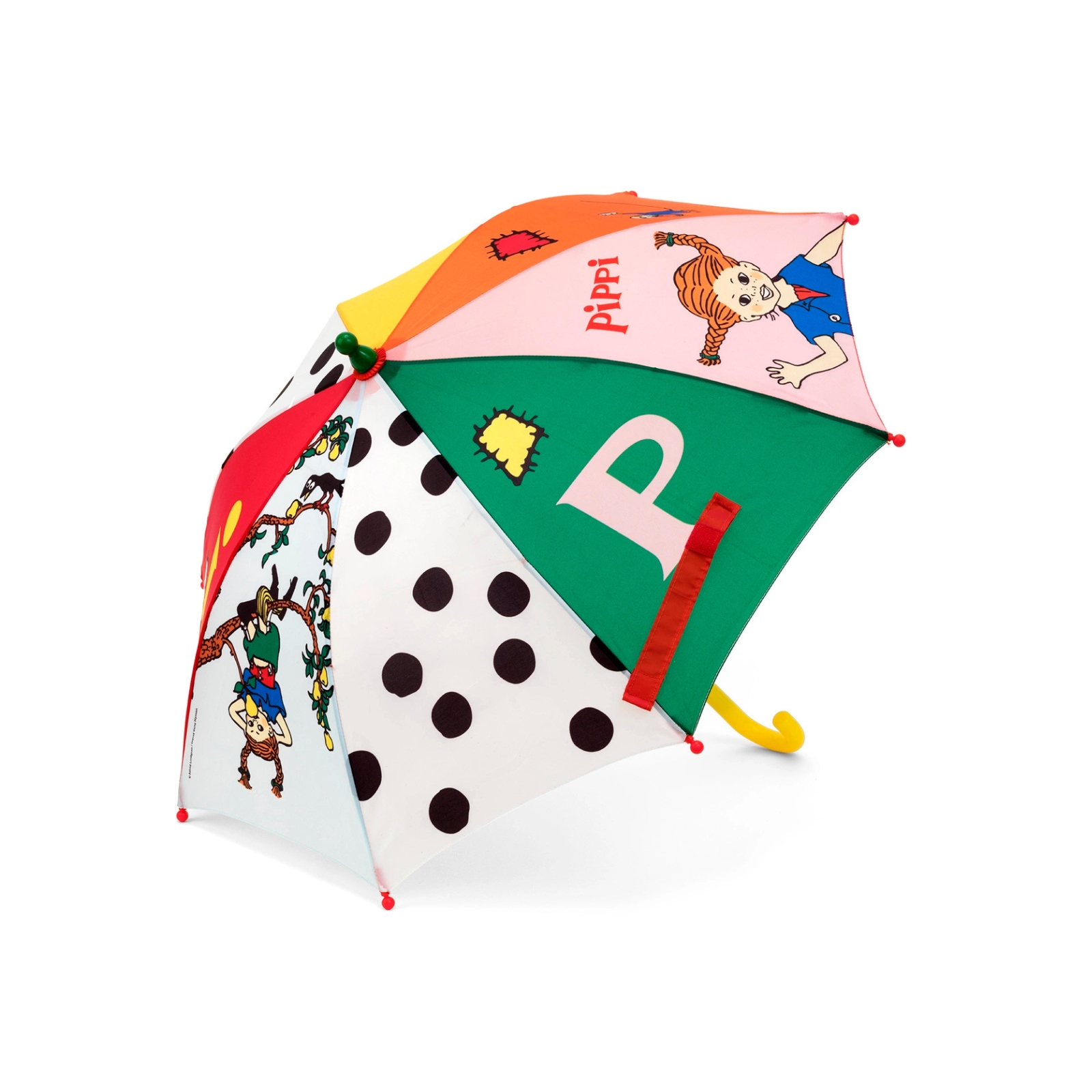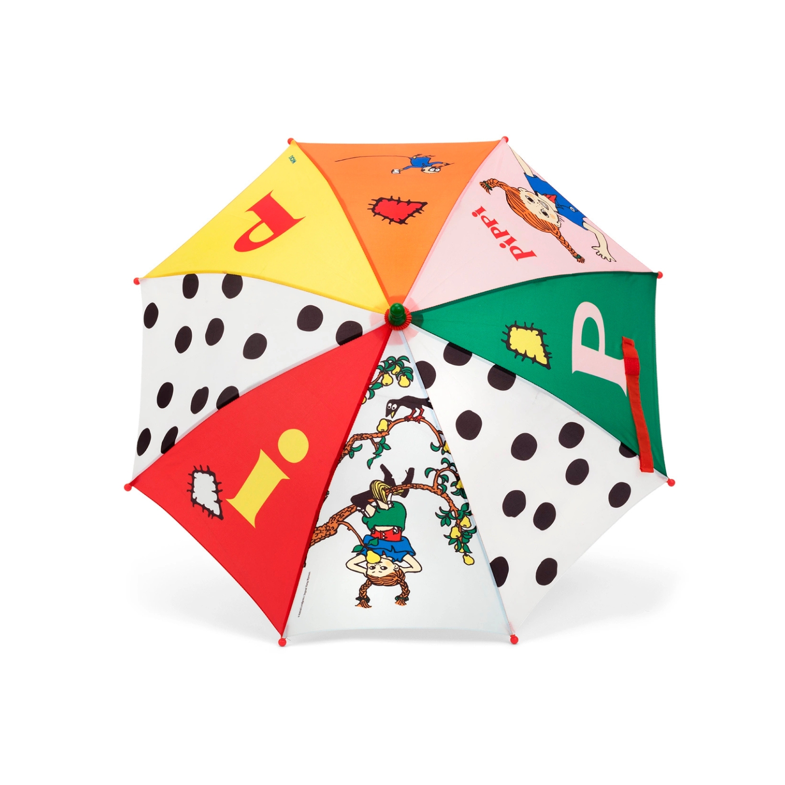 Ett alldeles eget Pippiparaply för regniga dagar. Med roliga mönster och glada färger piggar detta barnparaply upp vilken regnig dag som helst. Motiv av Ingrid Vang Nyman.