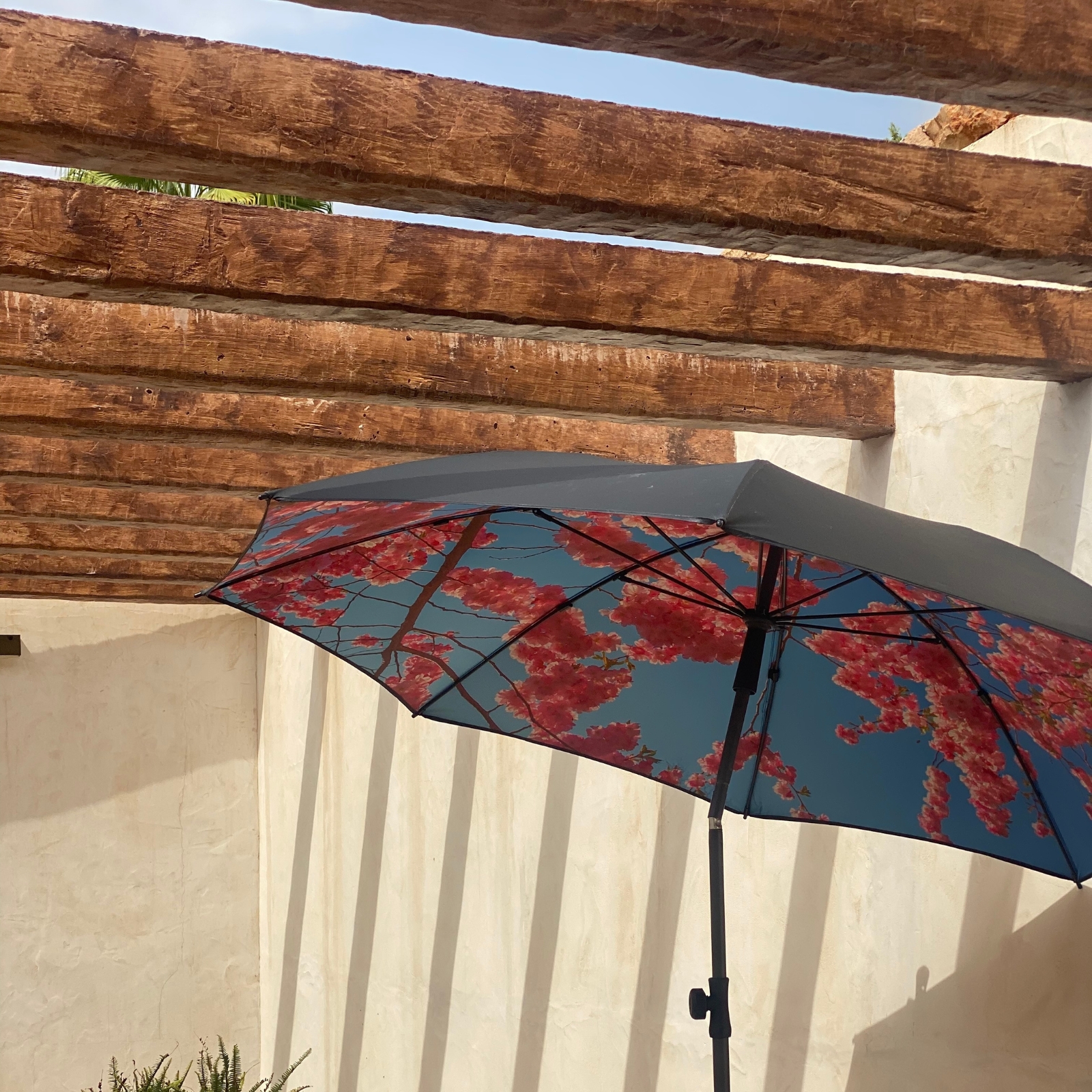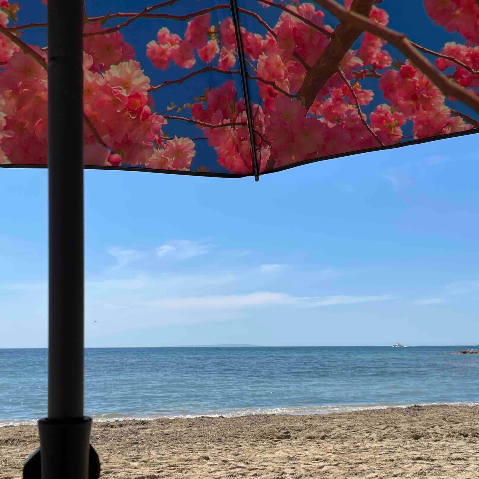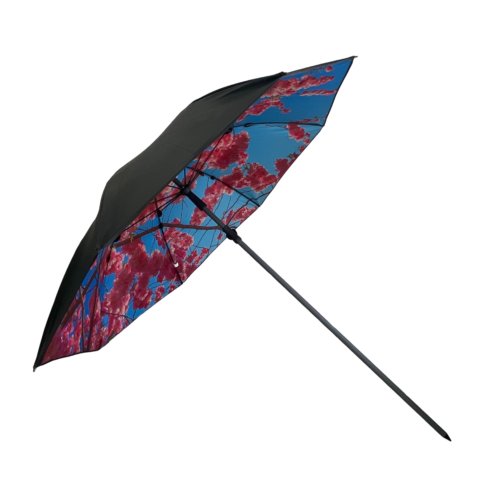 Parasollen finns i tre uttrycksfulla mönster – Cherry, Moln och Skog – inspirerade av naturens färger och former. Med ett högt solskydd (UPF 50+) får du både skugga och trygghet under starka solstrålar.