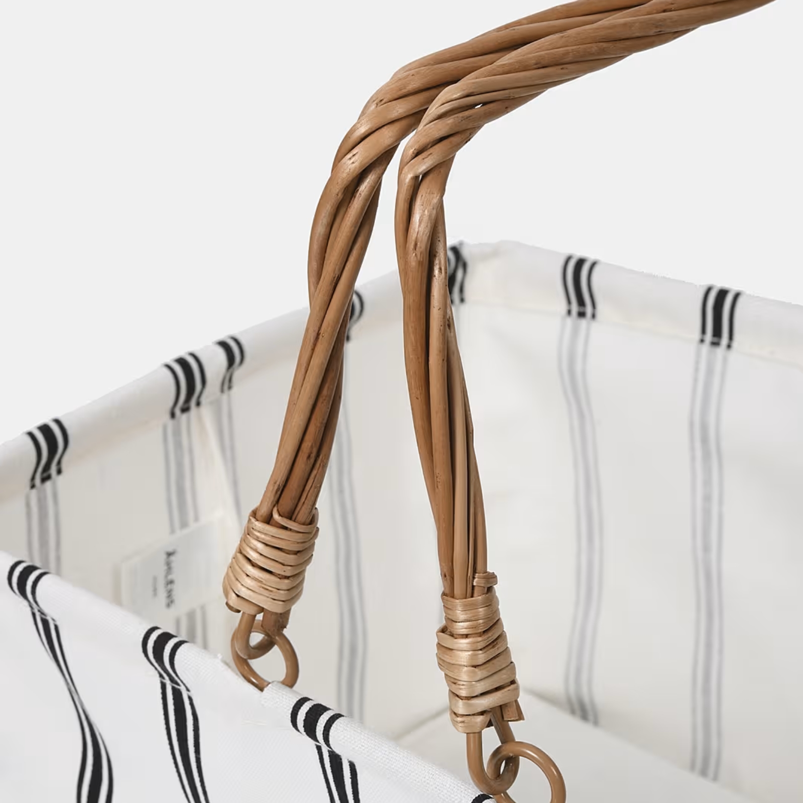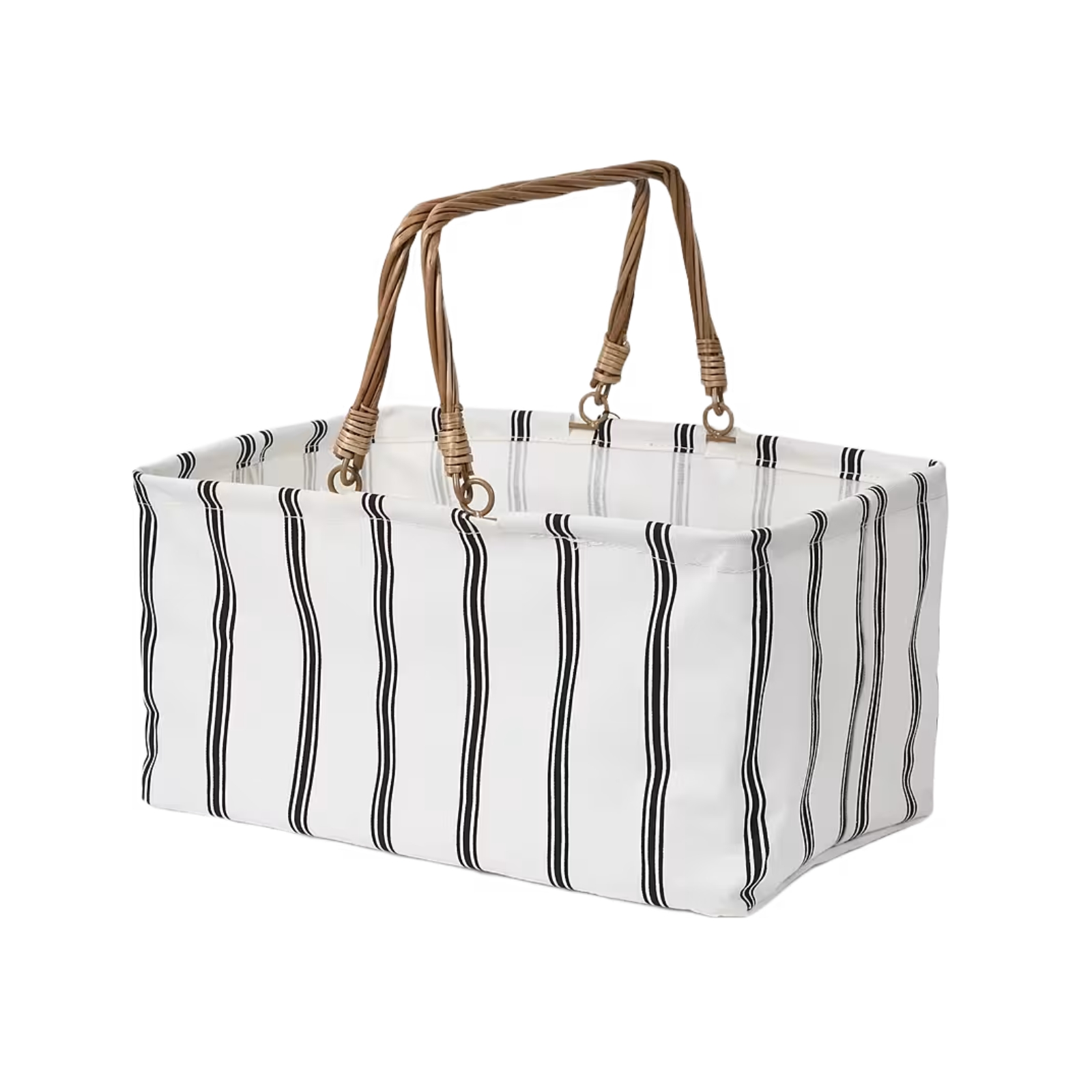 Korgen har fällbara handtag i tvinnat trä och en ram av metall för stabilitet.